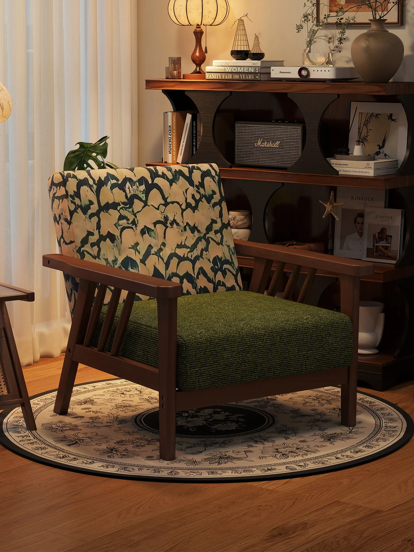 ヴィンテージ風の木製一人用ソファチェア - リビングルームや書斎にぴったりなレトロな布製デザイン。リラックスできる快適さとスタイリッシュな雰囲気を兼ね備えたこの一人掛け椅子は、バルコニーや民宿にも最適です。