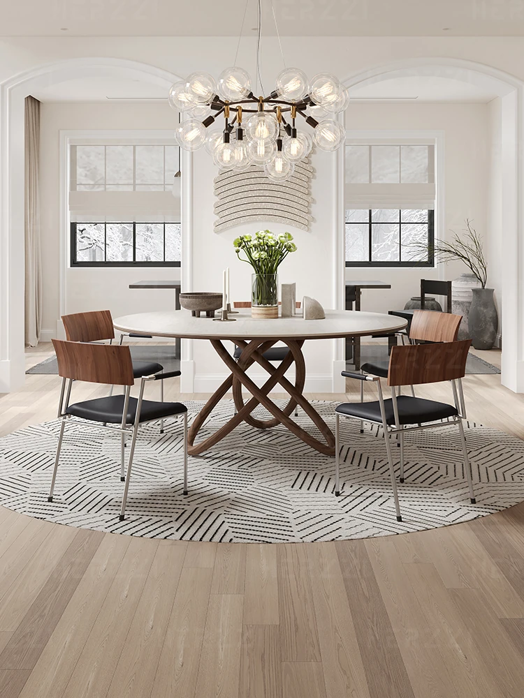 HERZZI新作!デリフォン天然石の岩板を使用したラウンドテーブルセット、輸入ホワイトアッシュ無垢材のダイニングテーブルとチェアの組み合わせ。おしゃれで温かみのある空間を演出!