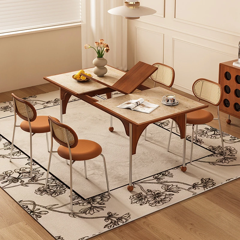 香港送料無料!軽やかな高級感のある光沢岩板ダイニングテーブル&チェアセット。伸縮可能な折りたたみ式で、小型住居にもぴったりな四角・円形兼用の実用的なデザインです。おしゃれで機能的な食卓をお楽しみください!