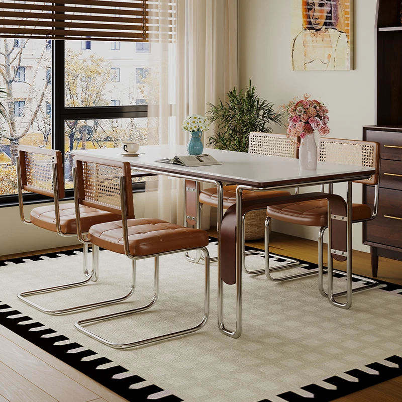 HERZZIデリフォン天然石岩板&無垢材ダイニングテーブルセット - バウハウスデザインのステンレス製長方形シンプルテーブルで、毎日の食事をスタイリッシュに彩る!
