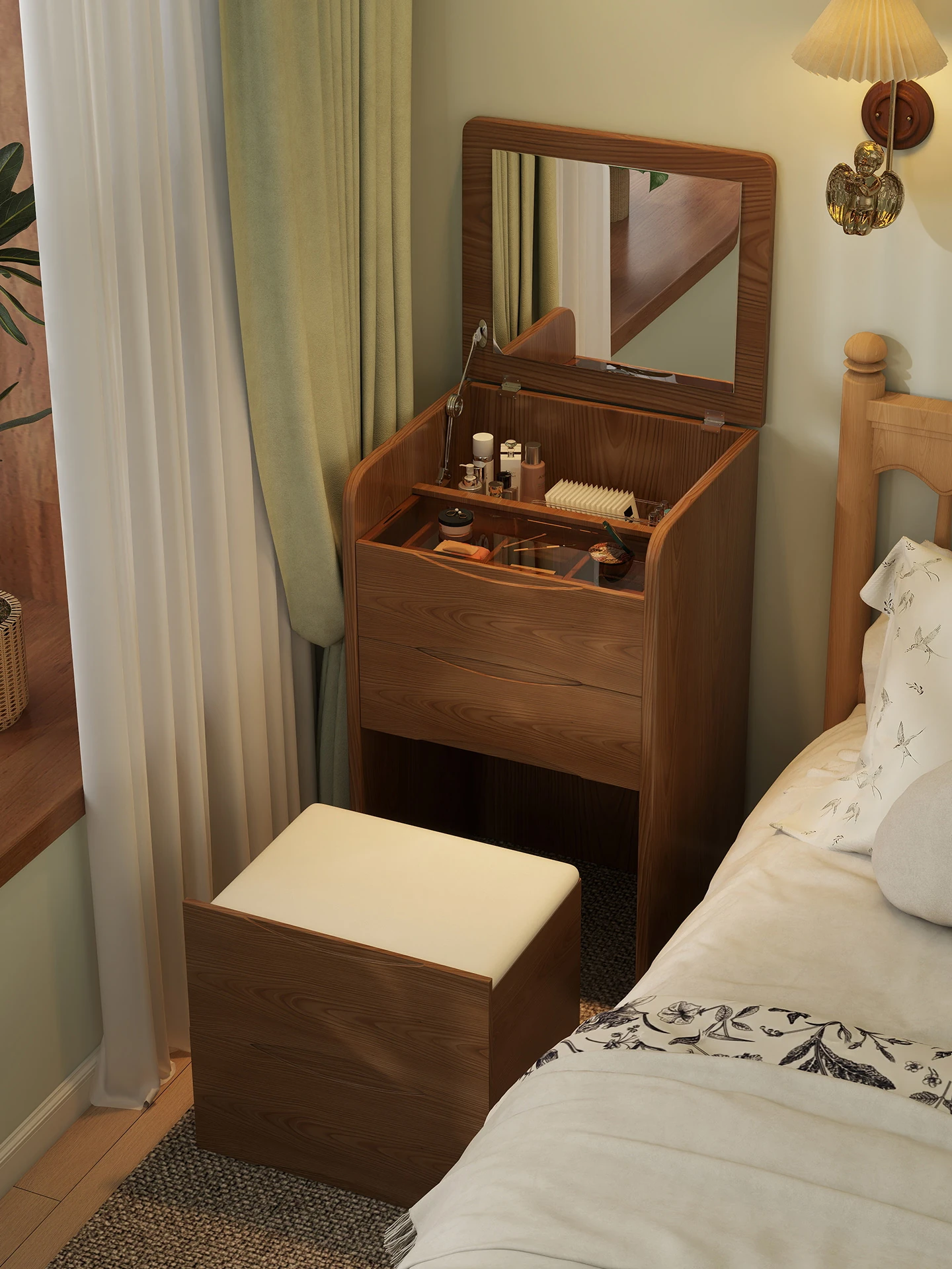 全実木製化粧台 - おしゃれでコンパクトなデザイン、狭いスペースにも最適!ミラー付きで、毎日のメイクアップが楽しみに。寝室をスタイリッシュに演出する、機能性と美しさを兼ね備えたアイテムです!