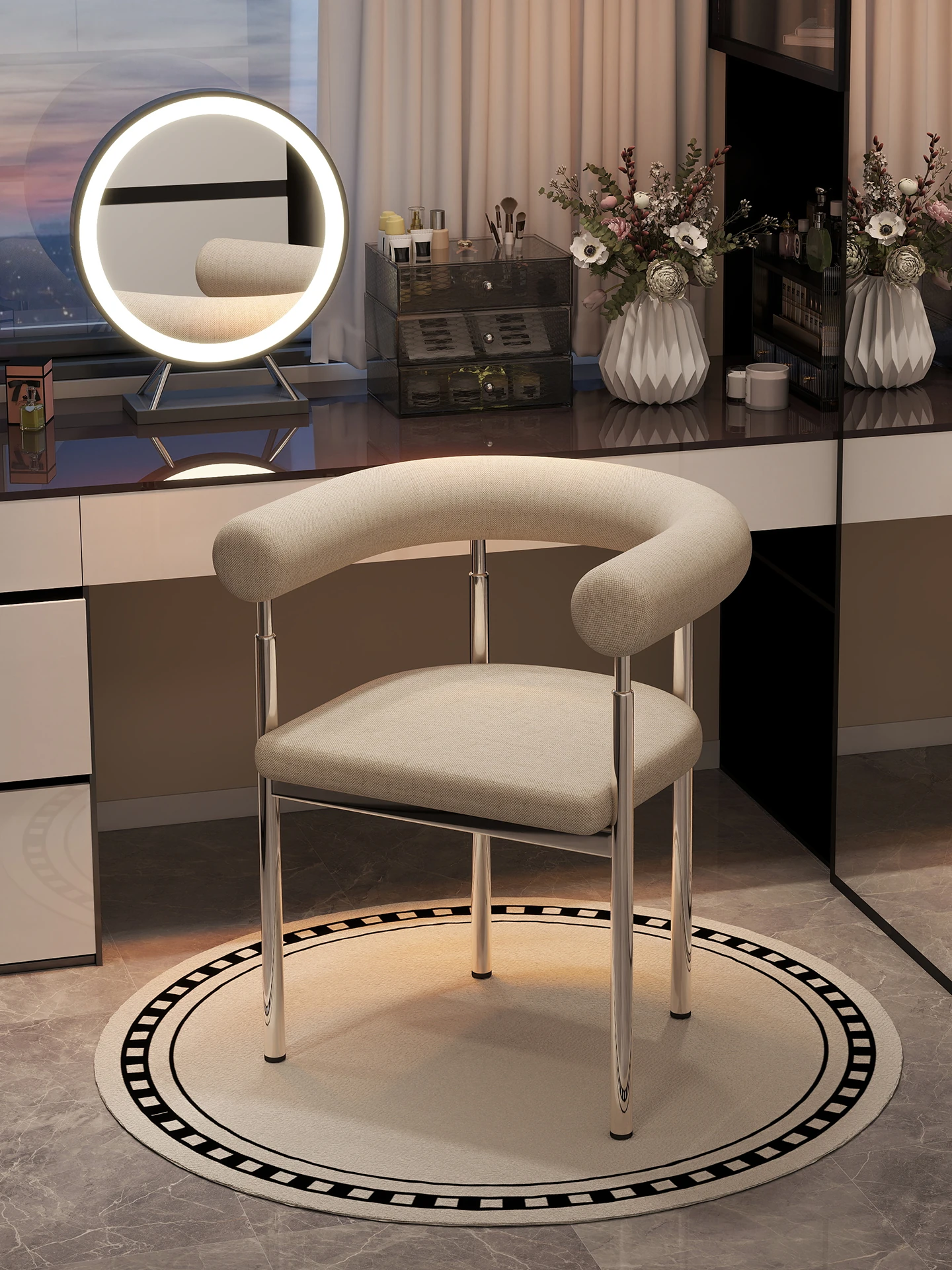 ミニマルデザインの化粧スツール、ラグジュアリーなラムファー仕立て!インスタ映えするクリエイティブなデザイナーによるイタリアンスタイルのシンプルなベッドルーム用ドレッシングテーブルサークルスツール。