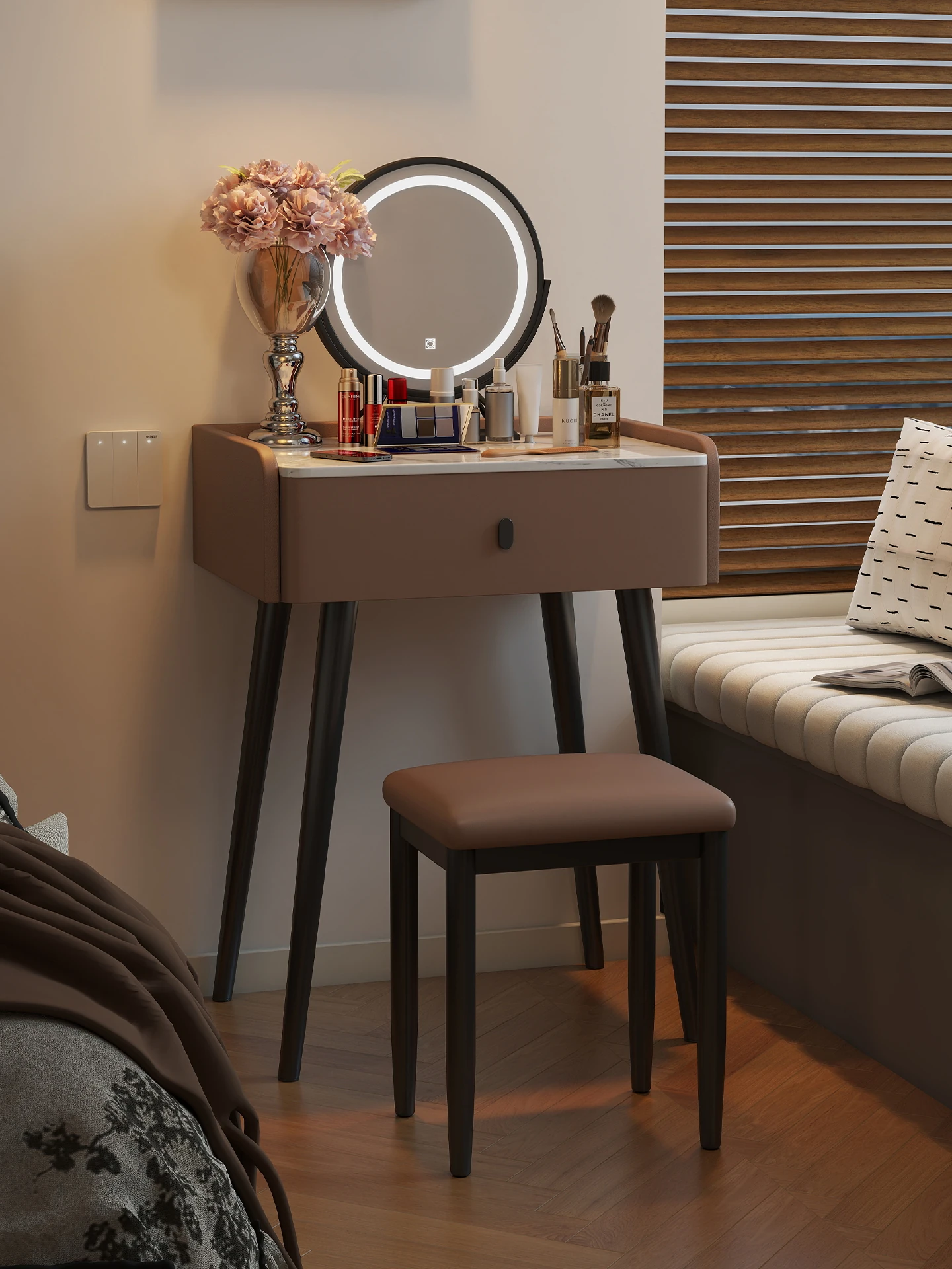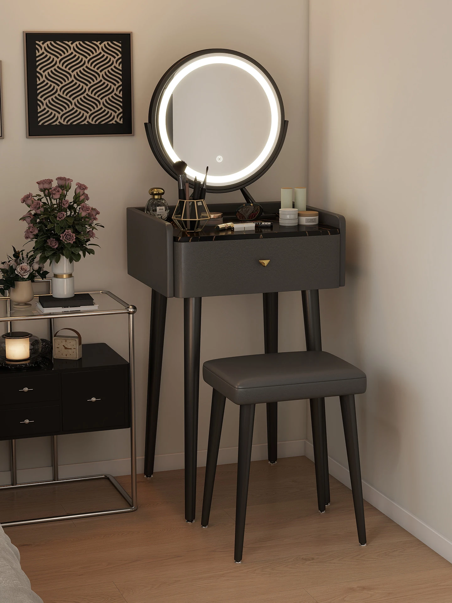 北欧スタイルの岩板ドレッサー|小型寝室やベッドサイドに最適!ミラー付きで、モダンでシンプルなデザインが魅力の軽奢な化粧台。あなたの美しさを引き立てる、スタイリッシュな空間を演出します。