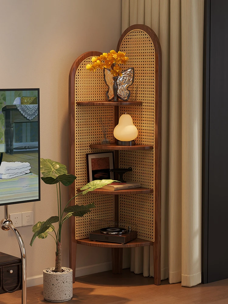 レトロ風の籐編みコーナー装飾ラック - リビングルームのソファサイドにぴったりな実木製の三つ折りスクリーン家具。本格的なデザインで収納力も抜群!おしゃれにお部屋を演出します。
