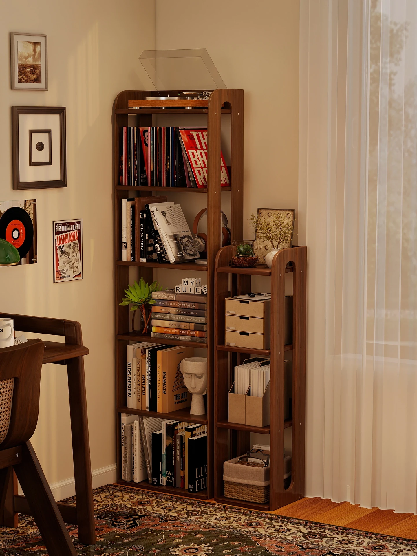 アンティーク風の無垢材製の多段式フロア書棚、大容量のインテリア展示キャビネット、収納力抜群のコーナー狭型ラック!おしゃれで実用的な収納スペースを実現!
