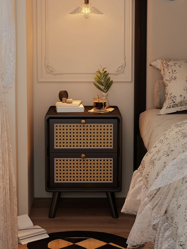 中古風の実木とラタン編みの小型ベッドサイドキャビネット | フレンチヴィンテージスタイル | 寝室の収納に最適なクリエイティブなサイドキャビネット!