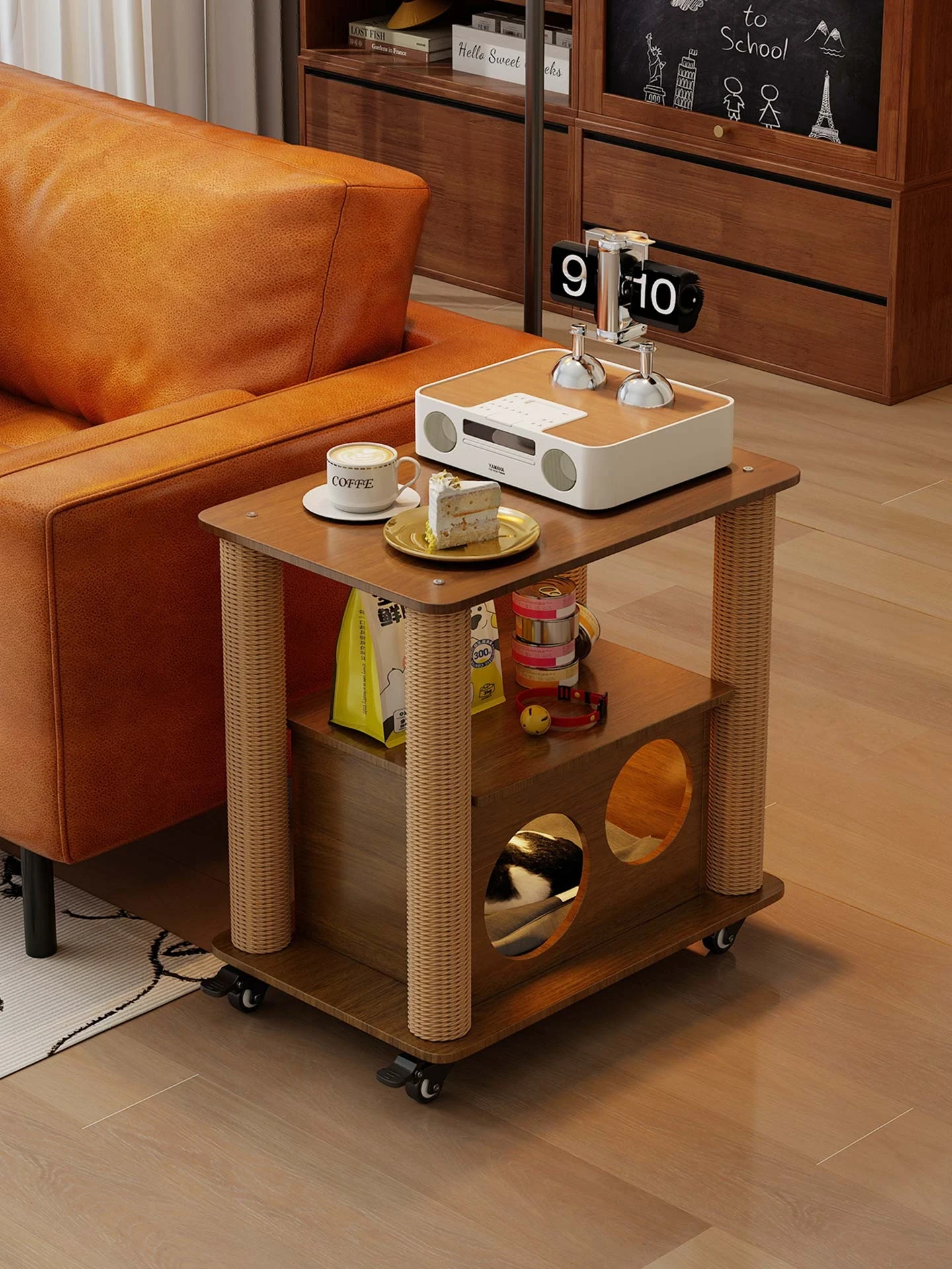 ペット用二重層リビングテーブル|人とペットのための猫ハウス&サイドテーブル|キャットタワー一体型|クリエイティブなソファコーナーテーブルでおしゃれなお部屋作りを!