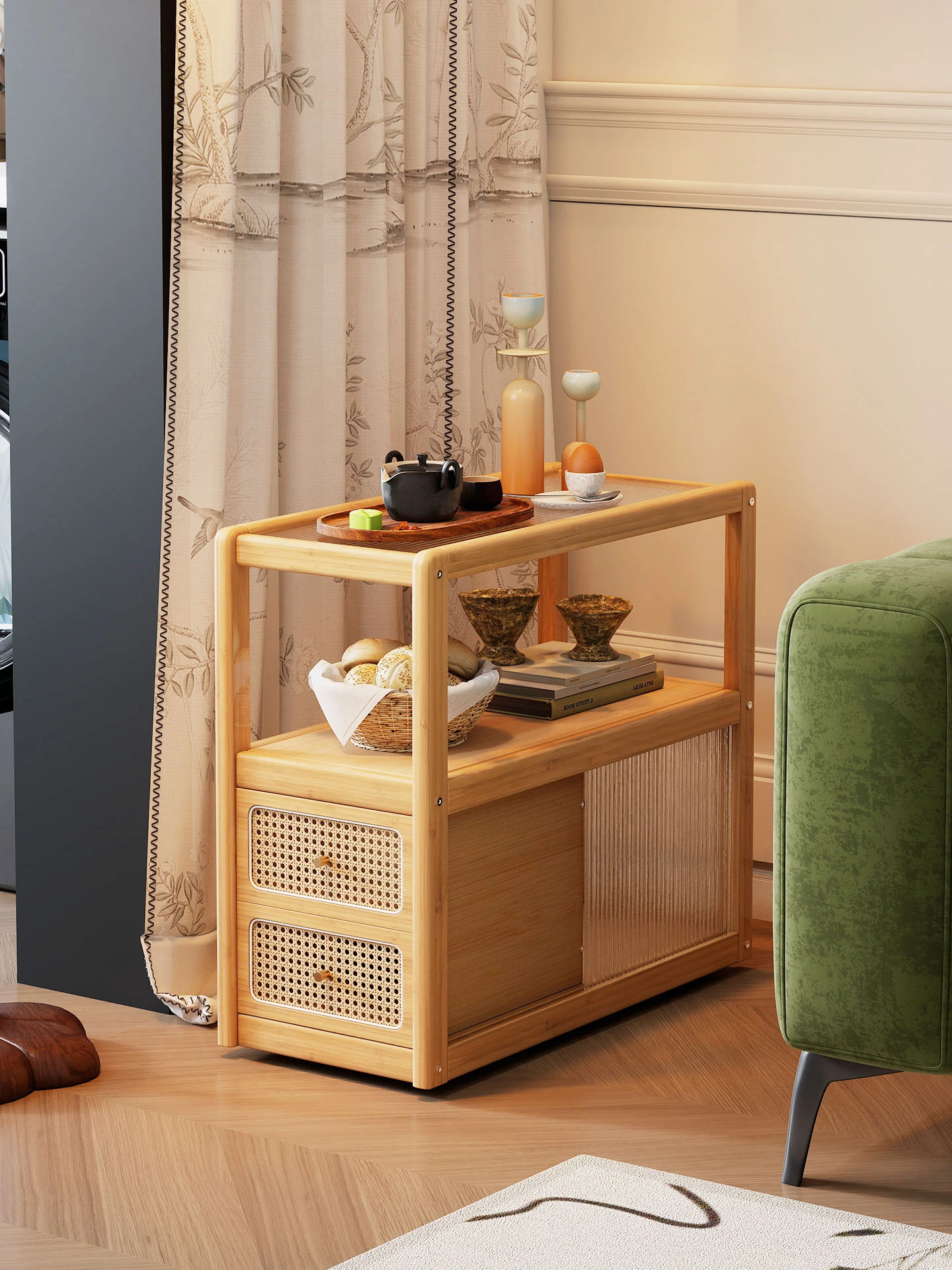 高品質な無垢材製のソファサイドテーブル、収納力抜群の移動式キャビネット!リビングに最適なサイドボードとして、手軽に使えるコンパクトなデザインで、スタイリッシュな空間を演出します。