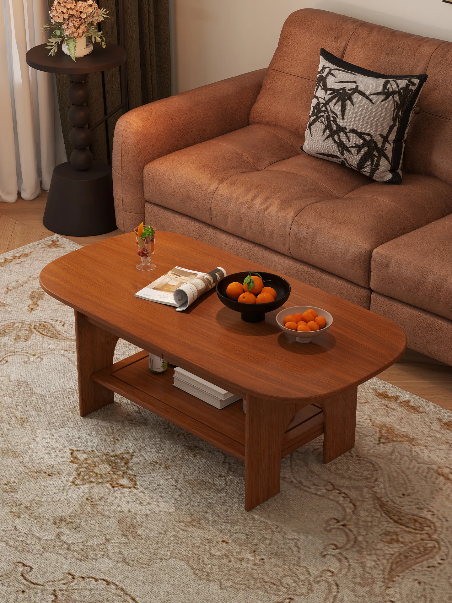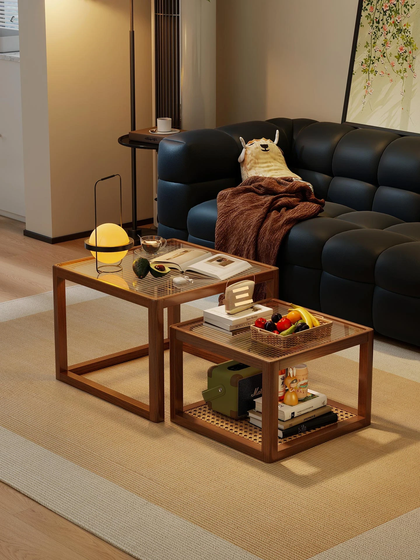 無垢材とラタン編みの長虹グラスコーヒーテーブル - 小さな家にぴったりのシンプルでモダンなデザイン。ウォールナットのレトロな侘び寂びスタイルの丸いエッジが魅力的です。おしゃれなリビング空間を演出します。