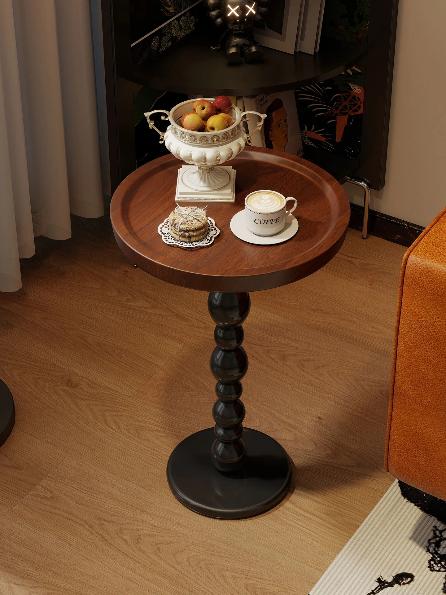 アメリカンヴィンテージの丸型サイドテーブル - 天然木製、リビングやバルコニーにぴったりのコンパクトサイズ。おしゃれで軽やかなデザインが、あなたの空間を一層魅力的に演出します。