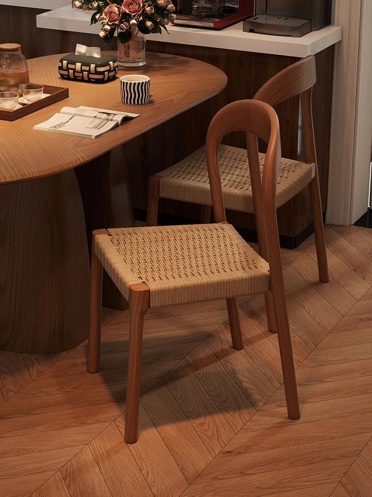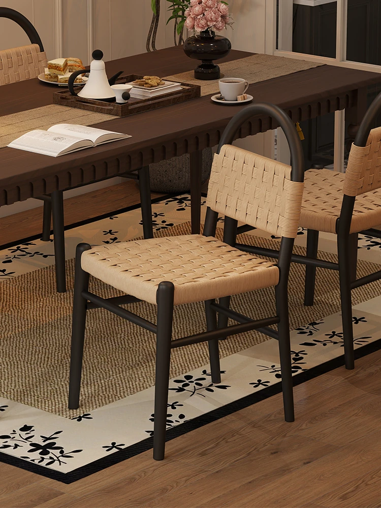Vintage French-Style Casual Dining Chair with Minimalist Solid Wood Frame and Soft Rattan Seat - Elegant and Comfortable Home Dining Experience