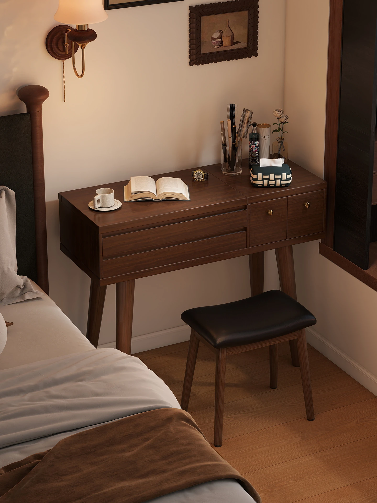 Modern Minimalist Small Dressing Table with Mirror - 2025 New Luxury Leather Design, Solid Wood Makeup Desk for Bedroom
