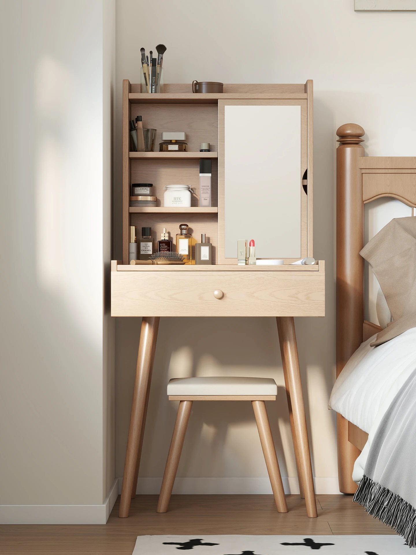 Compact Solid Wood Vanity Table with Mirror - Perfect for Small Bedrooms and Narrow Spaces, Stylish Makeup Desk for Cozy Homes