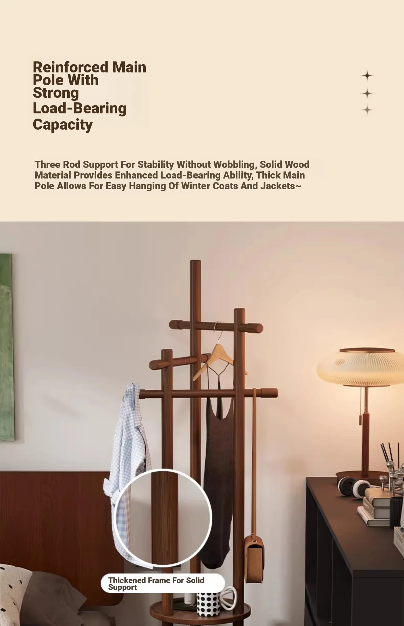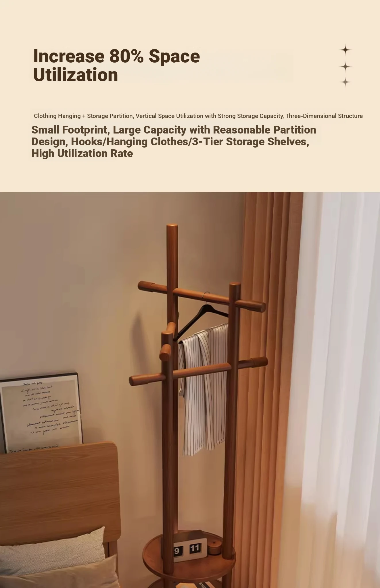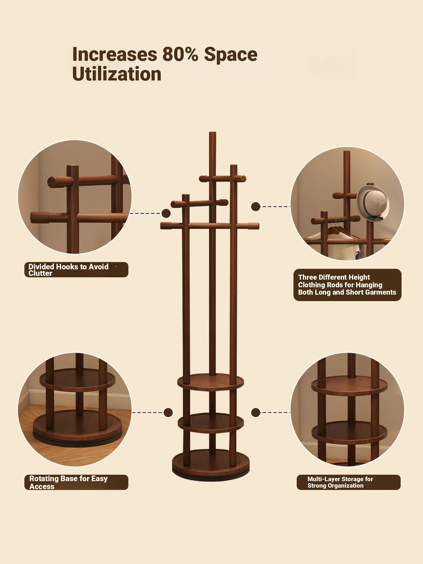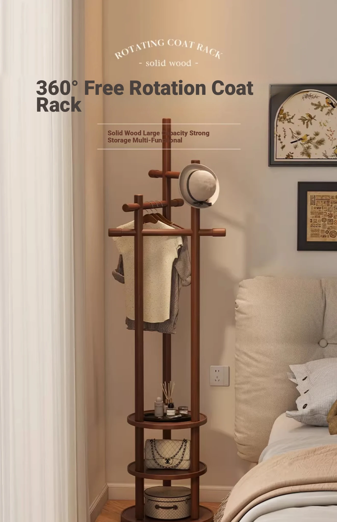 Compact Rotating Solid Wood Clothes Rack - Space-Saving Bedroom & Home Use Coat Stand, Perfect for Small Rooms and Bedside Storage