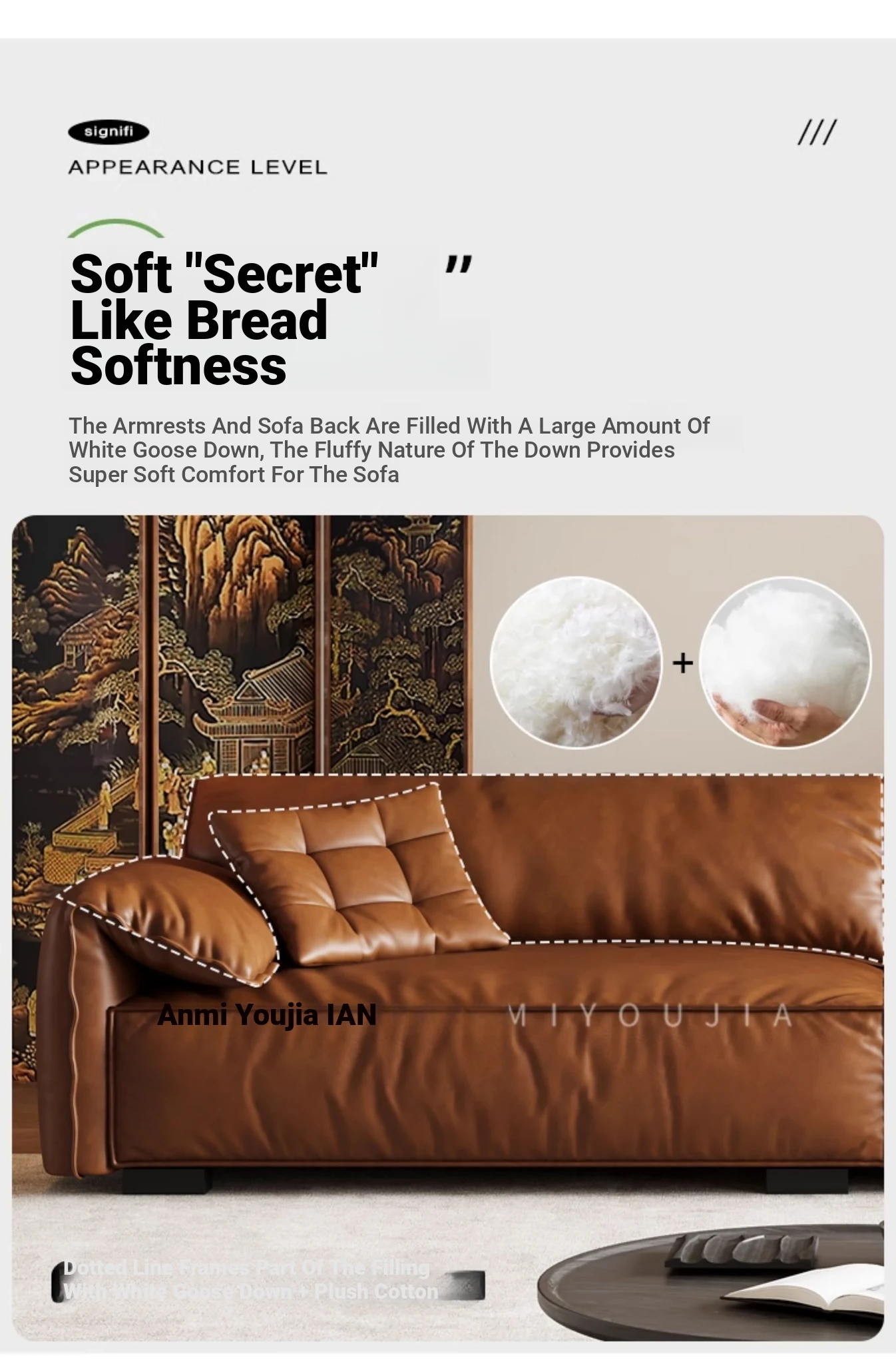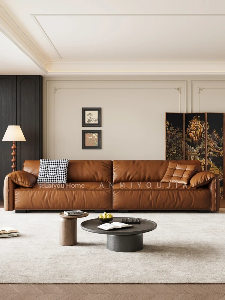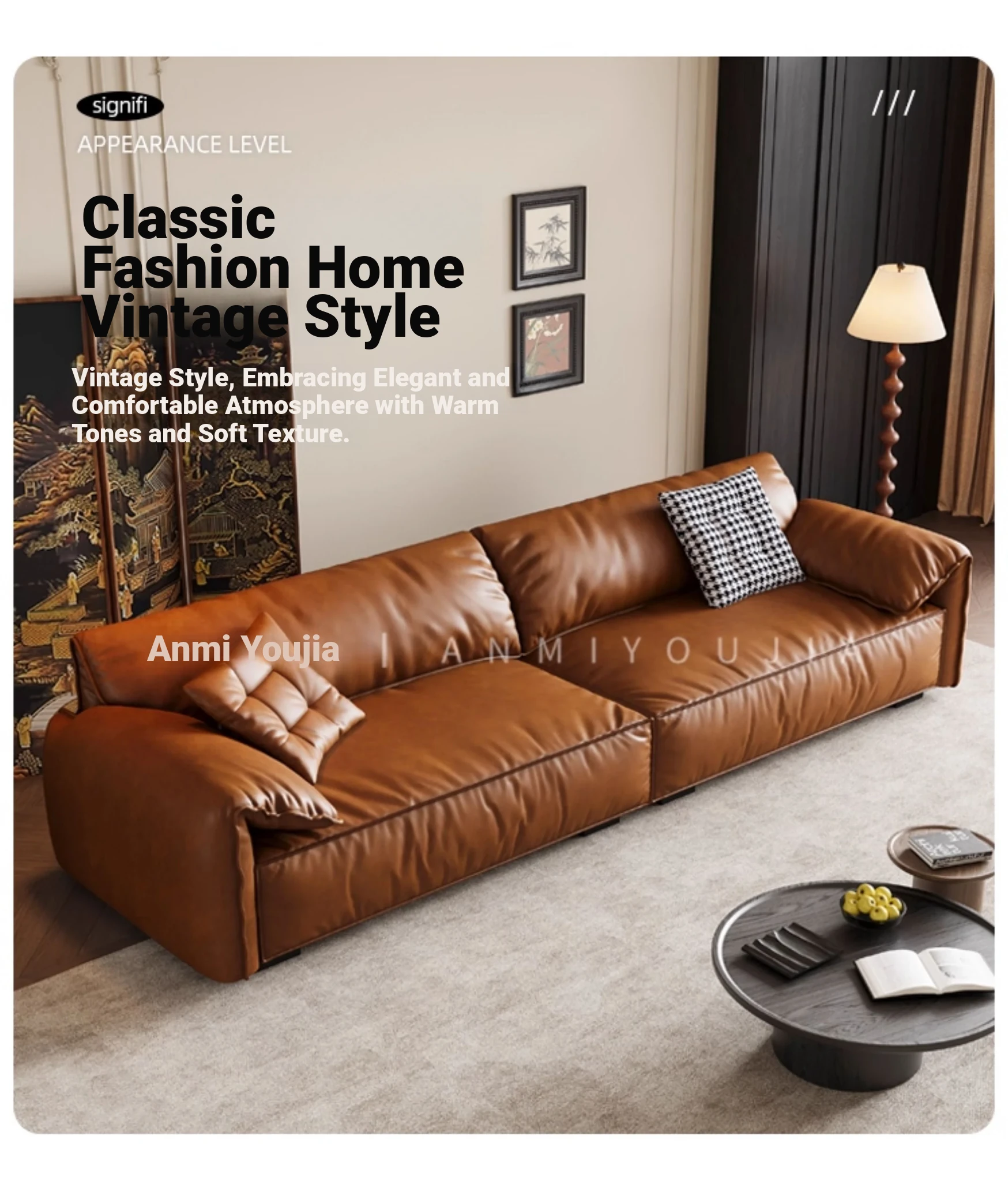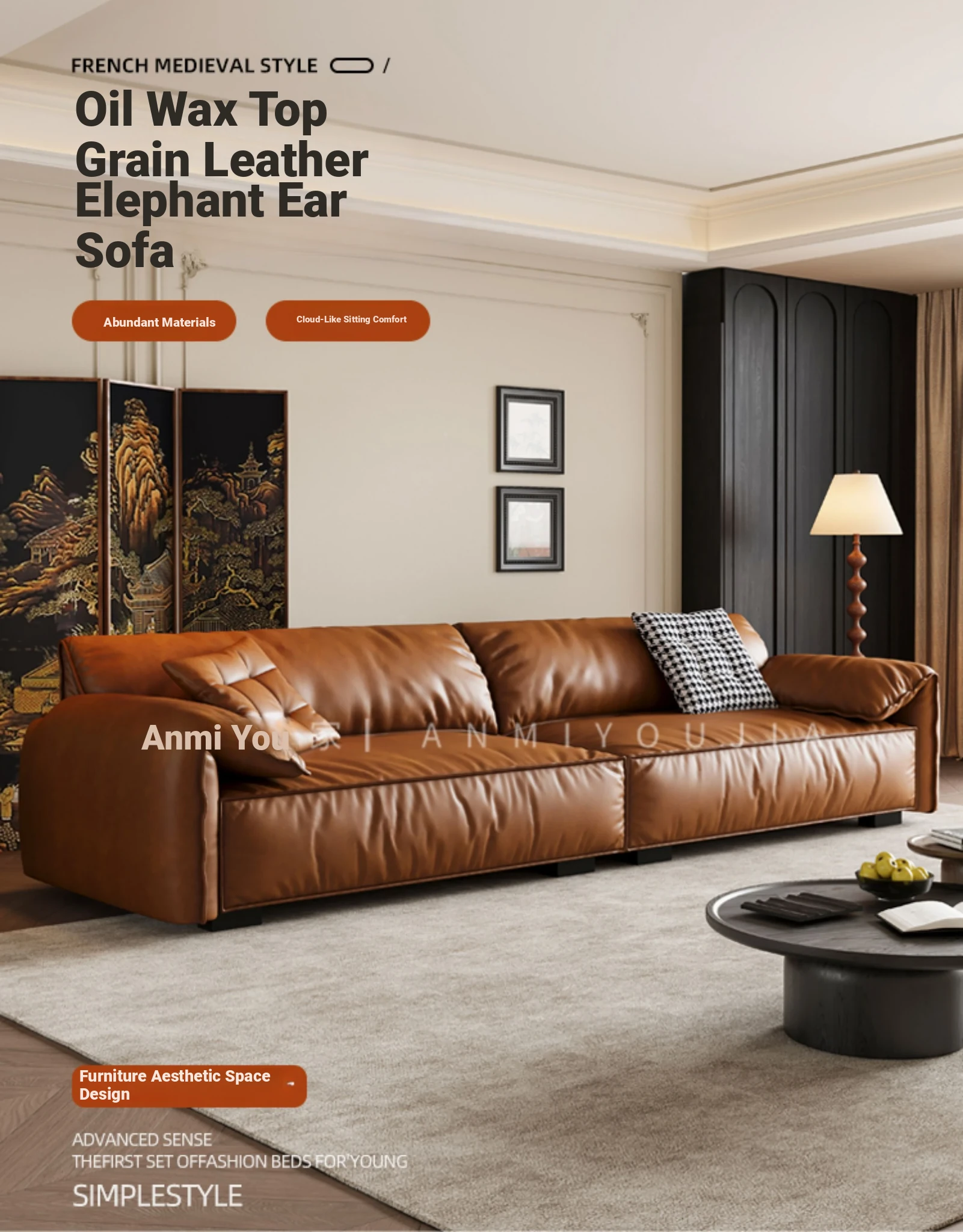 French Vintage Elephant Ear Real Leather Sofa - Oil Wax Eco-Friendly Leather for Small Living Rooms - Retro Straight Sofa Design