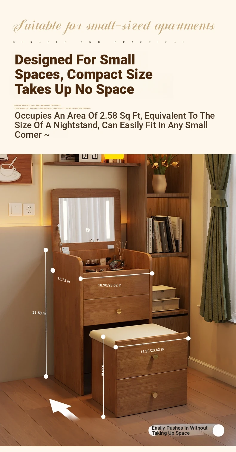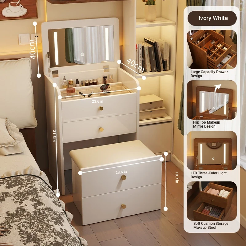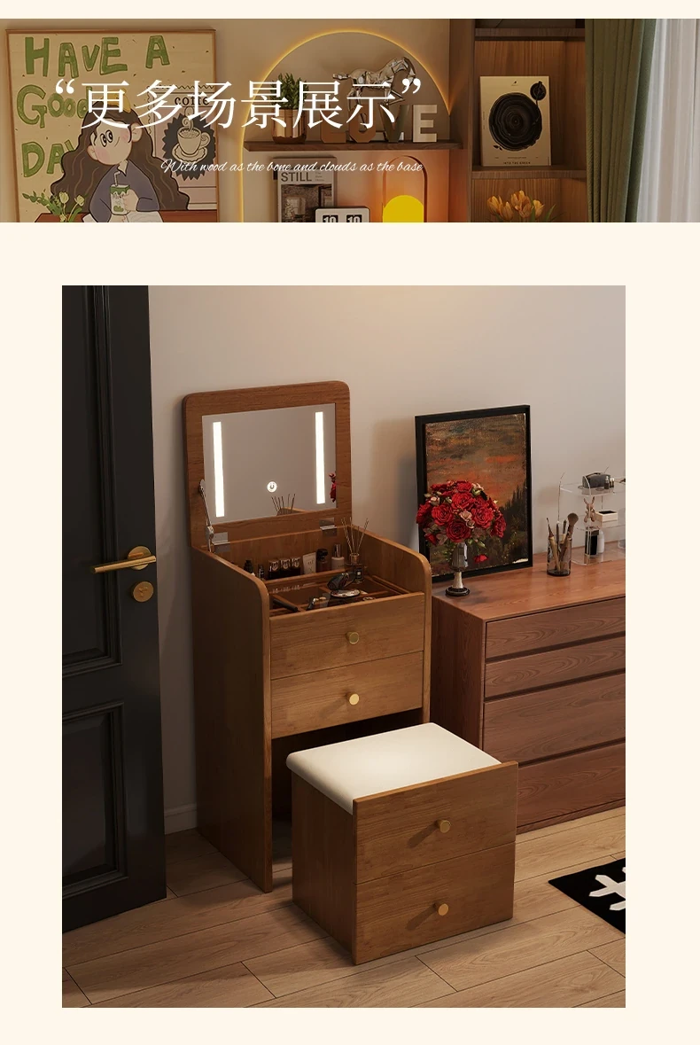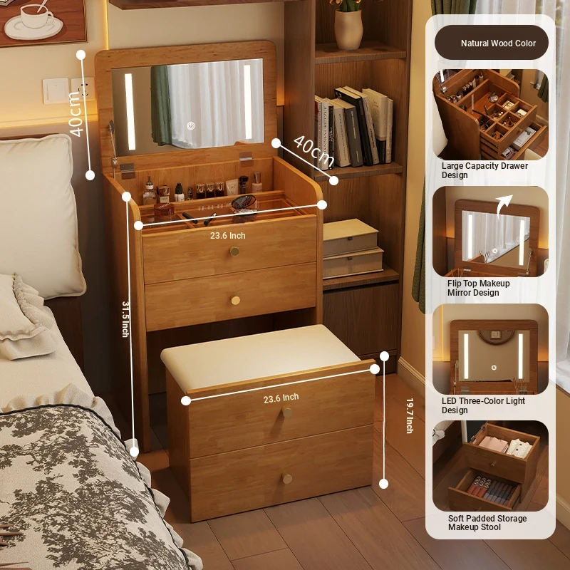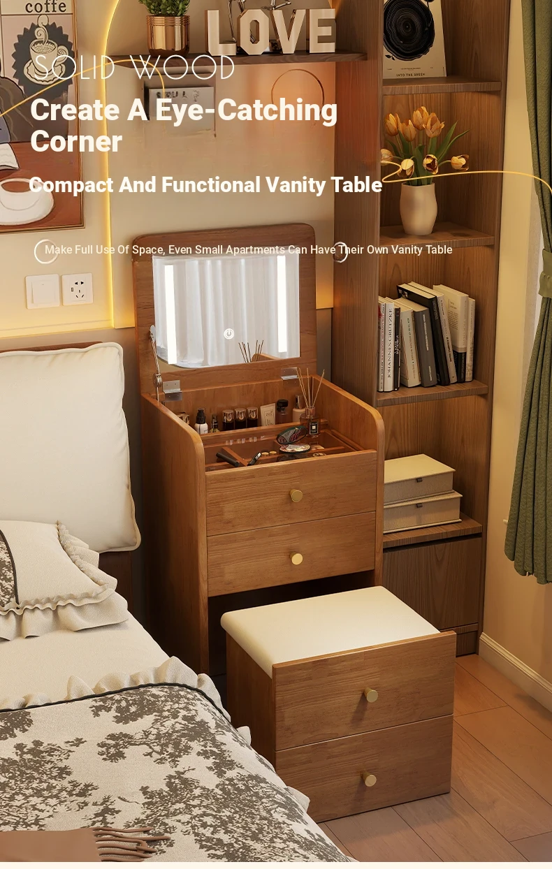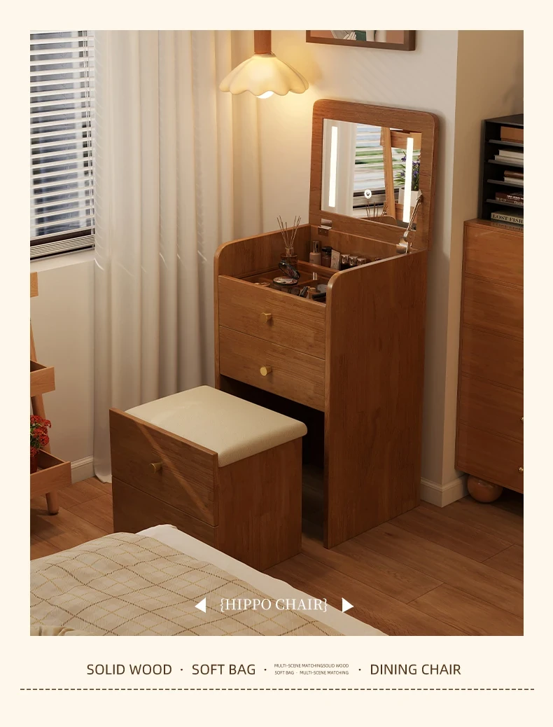 Modern Minimalist Solid Wood Flip-Top Vanity Table for Small Bedrooms - Multifunctional Makeup Desk with Storage Cabinet and Stool Combined