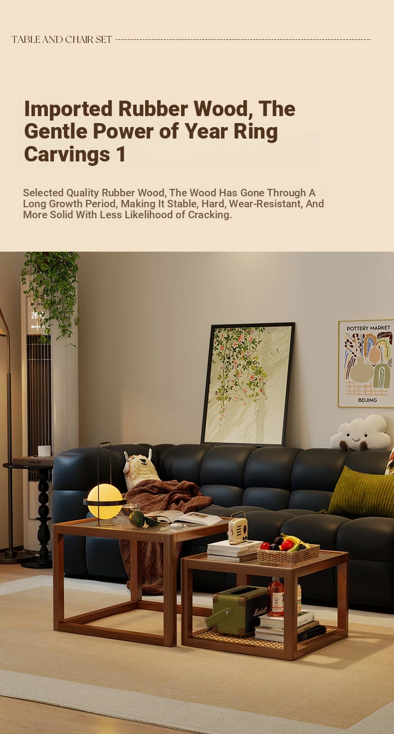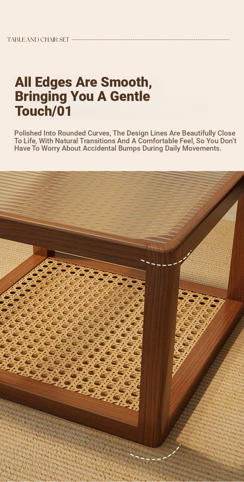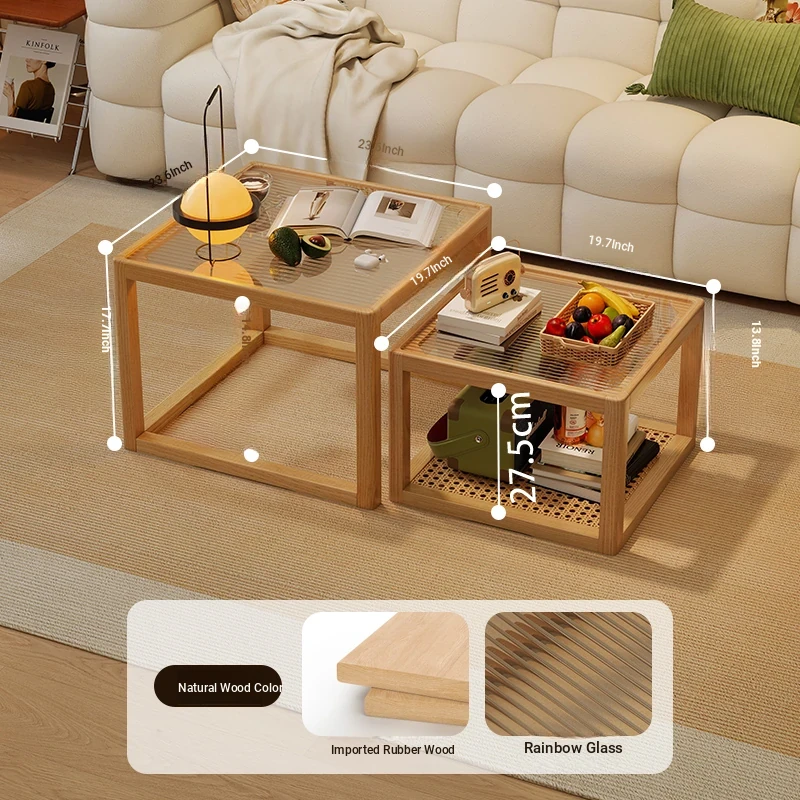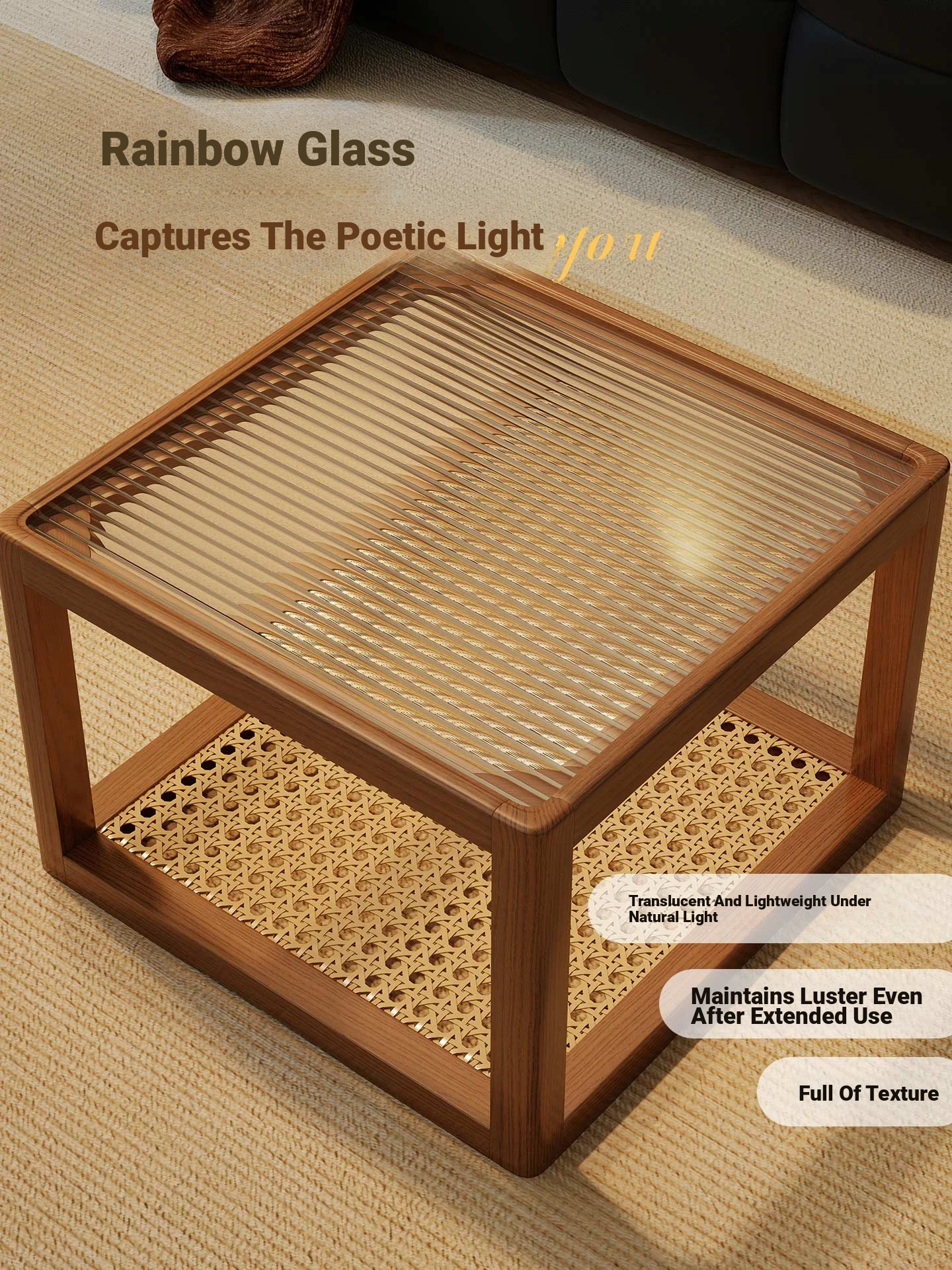 Modern Minimalist Solid Wood Tea Table with Rattan Weaving and Long Rainbow Glass - Perfect for Small Living Rooms, Retro Wabi-Sabi Style, Square Edges, Ideal for Home Use