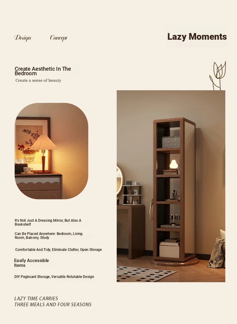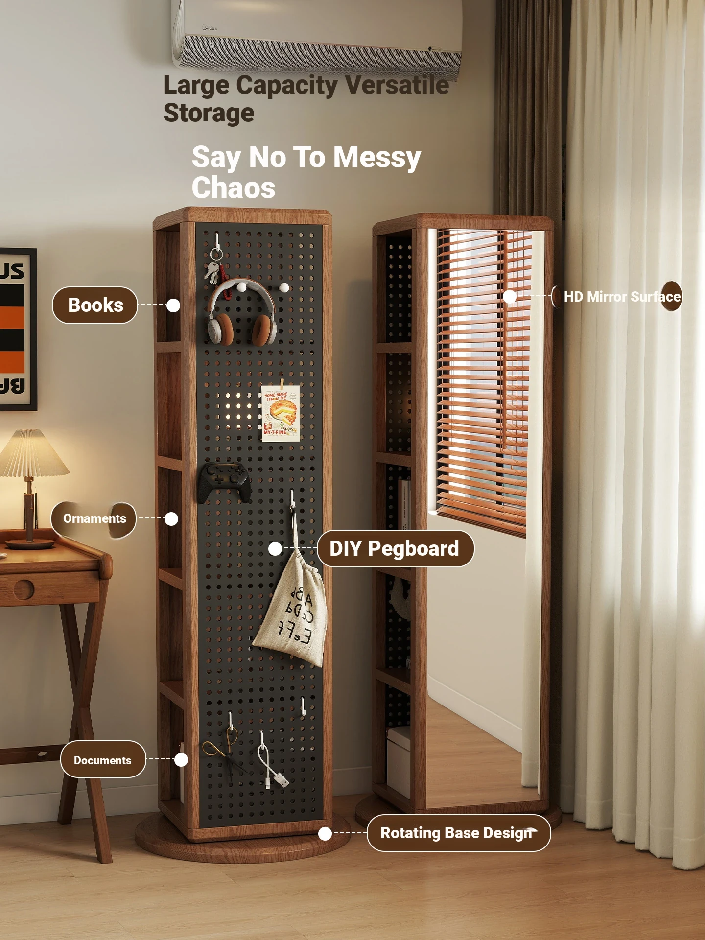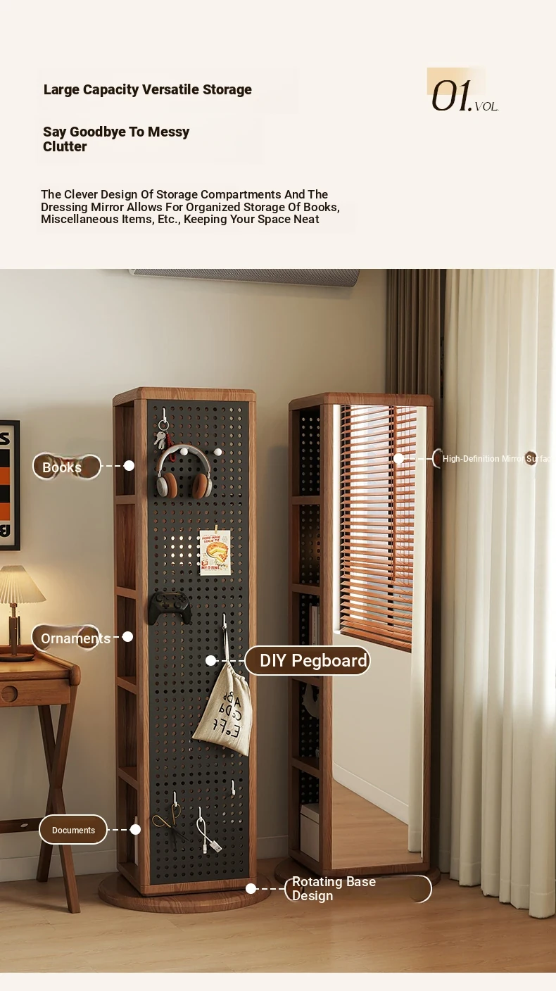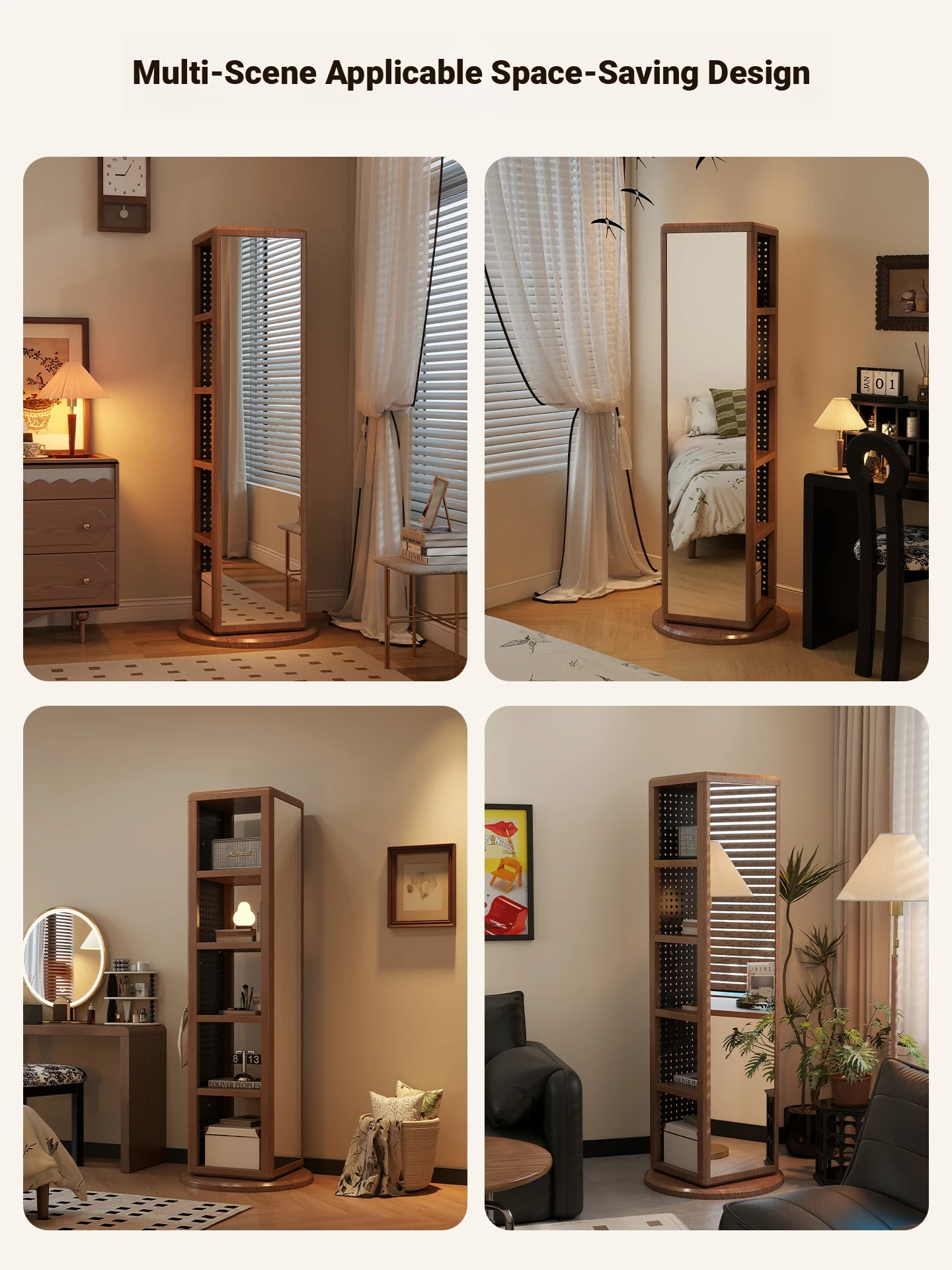 Multifunctional Wooden Full-Length Mirror with Rotating Bookshelf – Stylish Floor Storage Rack for Bedroom, Perfect for Organizing and Displaying Essentials!