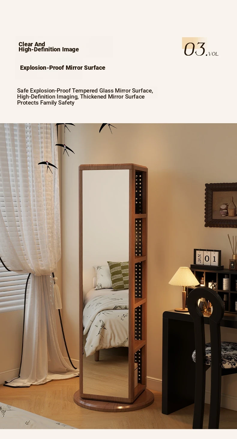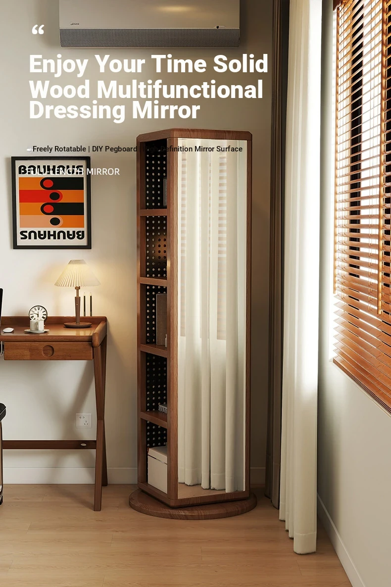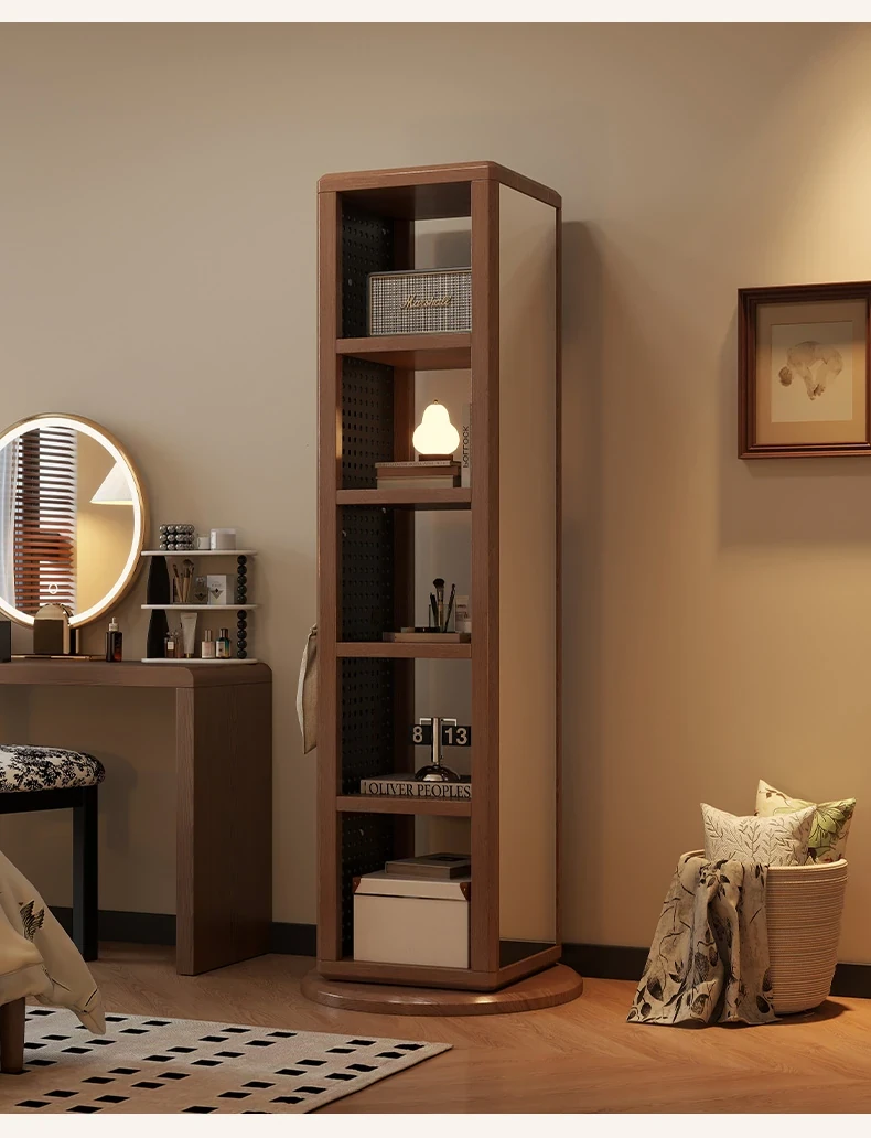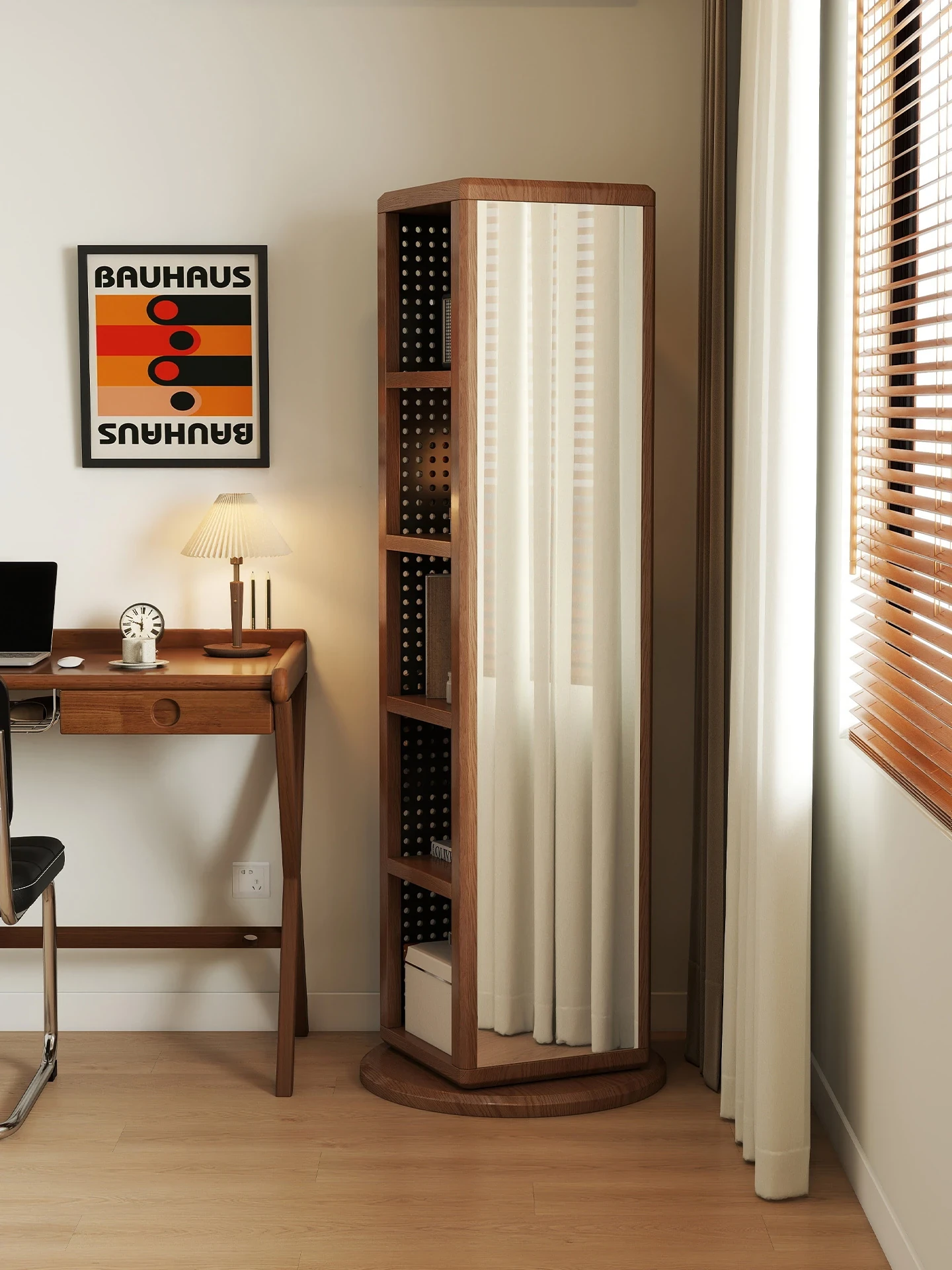 Multifunctional Wooden Full-Length Mirror with Rotating Bookshelf – Stylish Floor Storage Rack for Bedroom, Perfect for Organizing and Displaying Essentials!