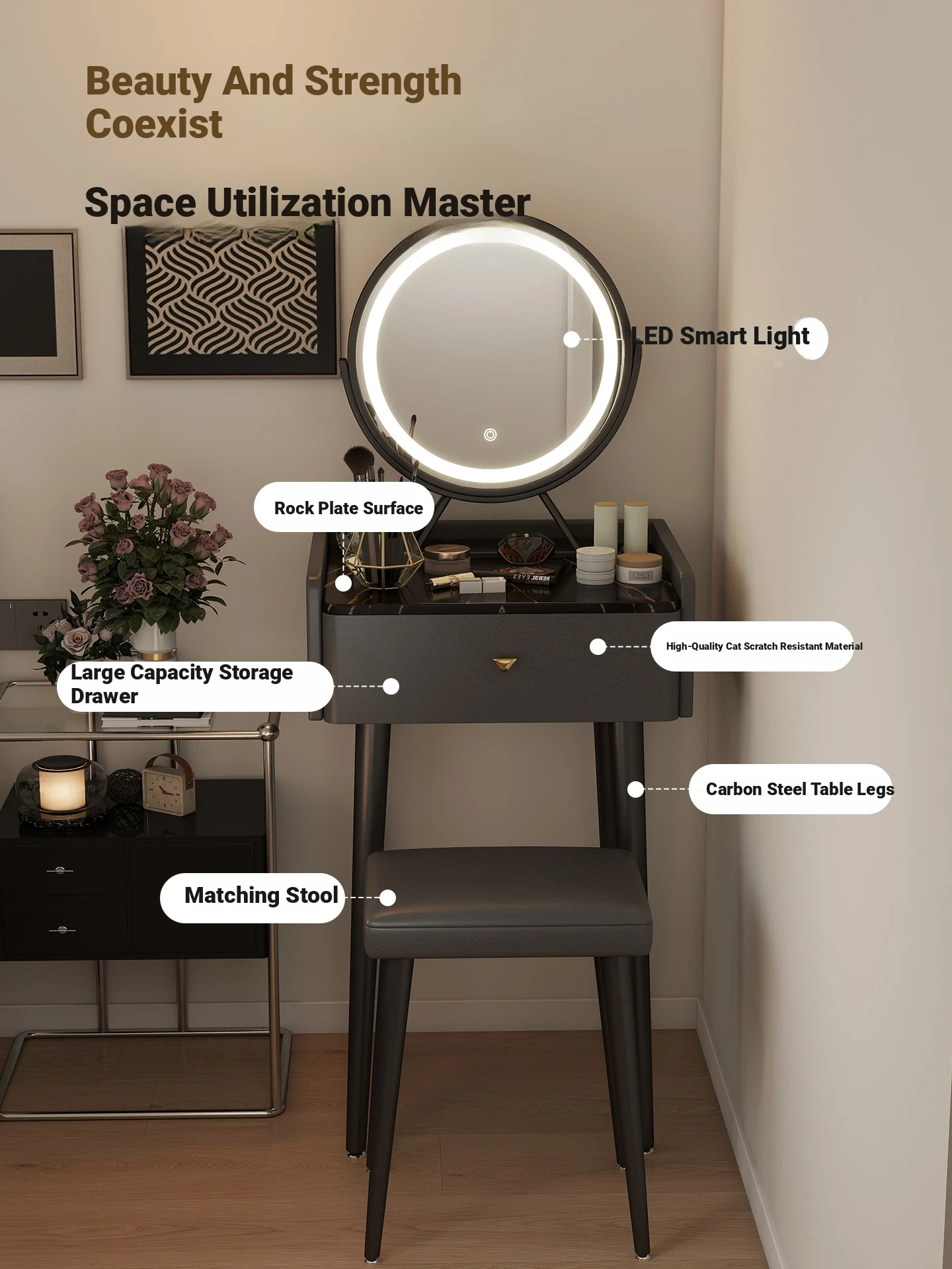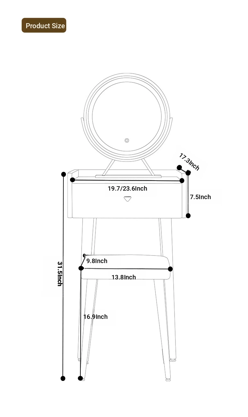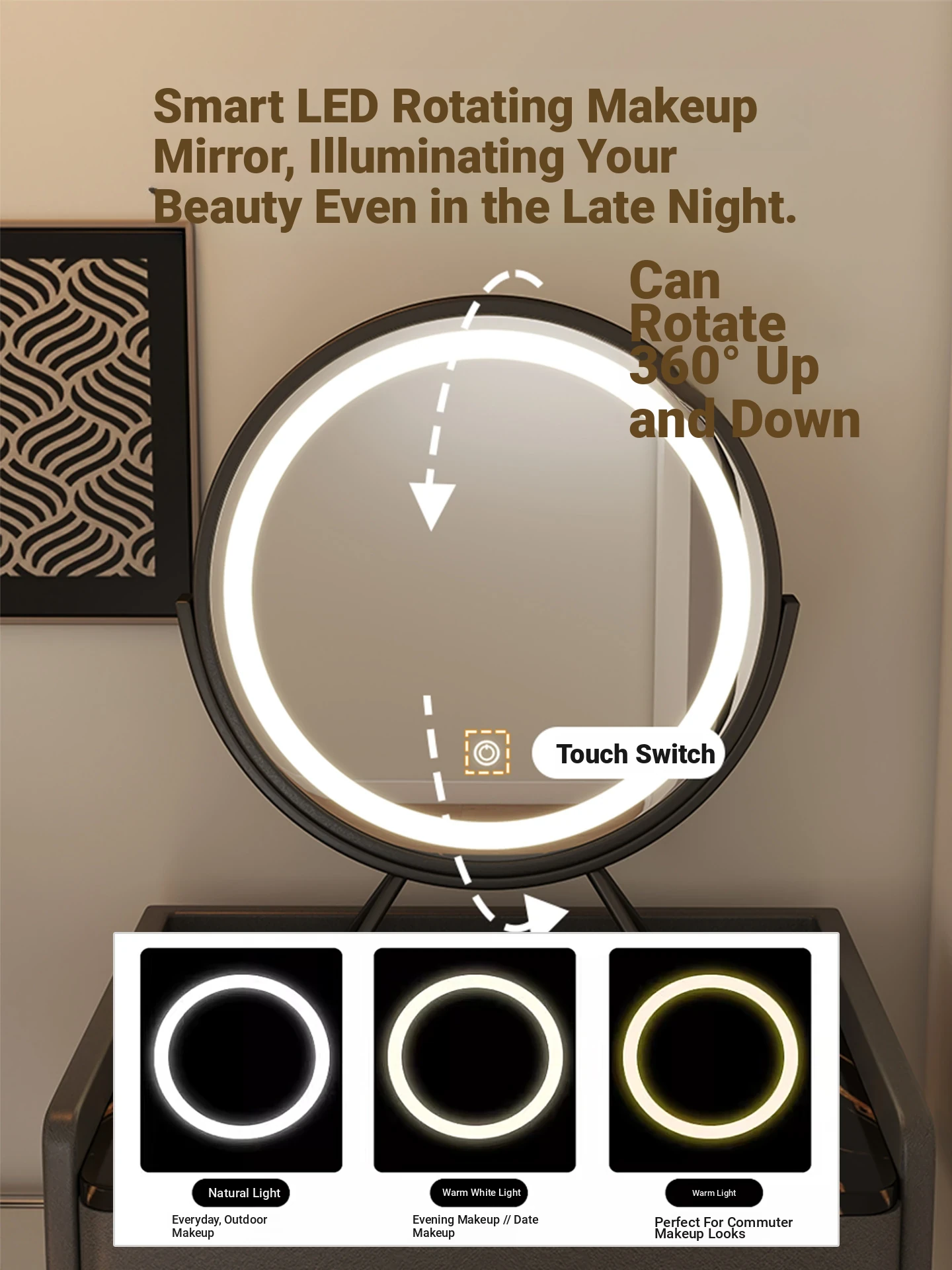 [with Stool] Khaki + Smart Led Rotating Makeup Mirror