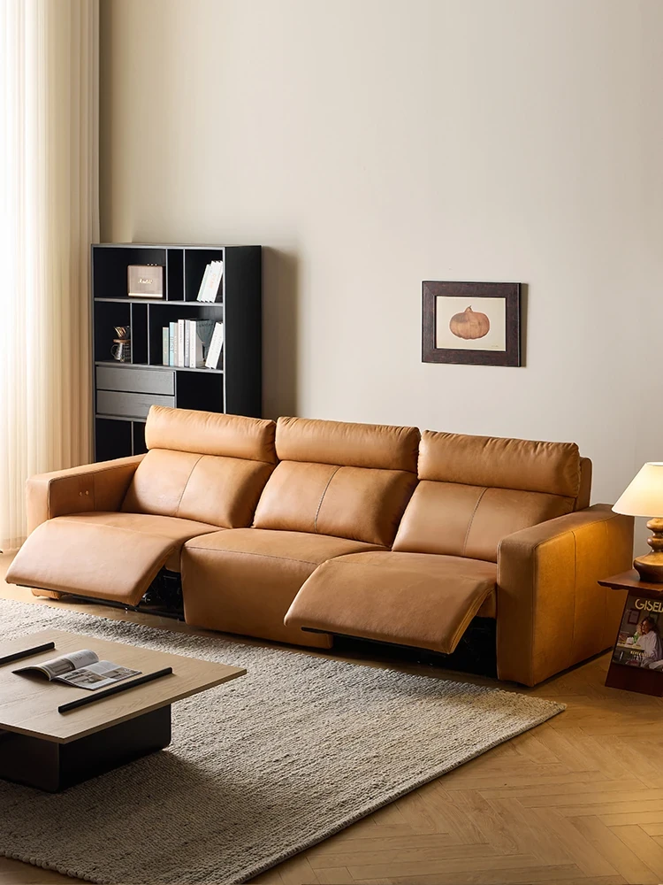 Luxury Genuine Leather Multifunctional Electric Sofa Bed – Adjustable & Expandable Retro Style Living Room Sofa in Top-Grain Cowhide