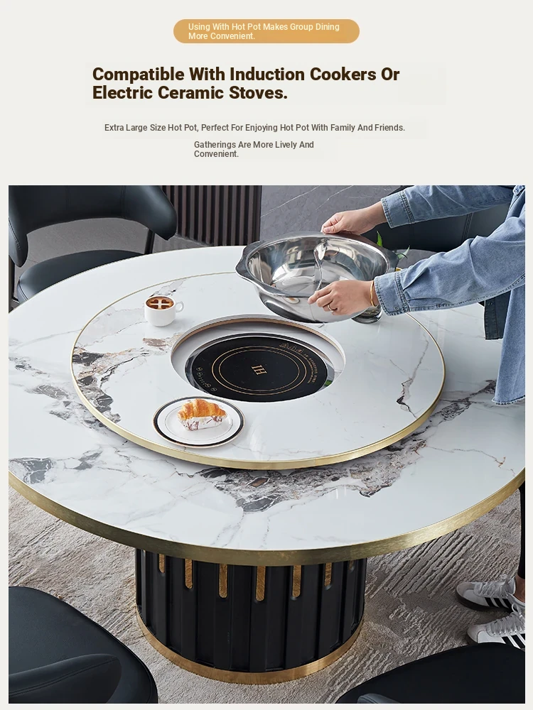 Electric Hot Pot Table with Integrated Induction Cooker and Rock Plate - Large Round Table with Electric Rotating Turntable for 10-Person Banquets in Hotels and Private Rooms