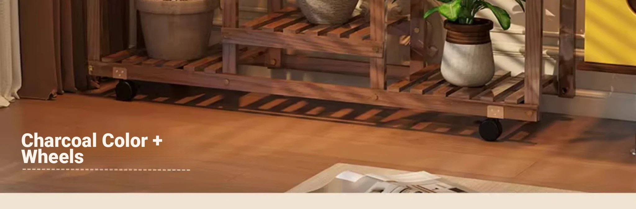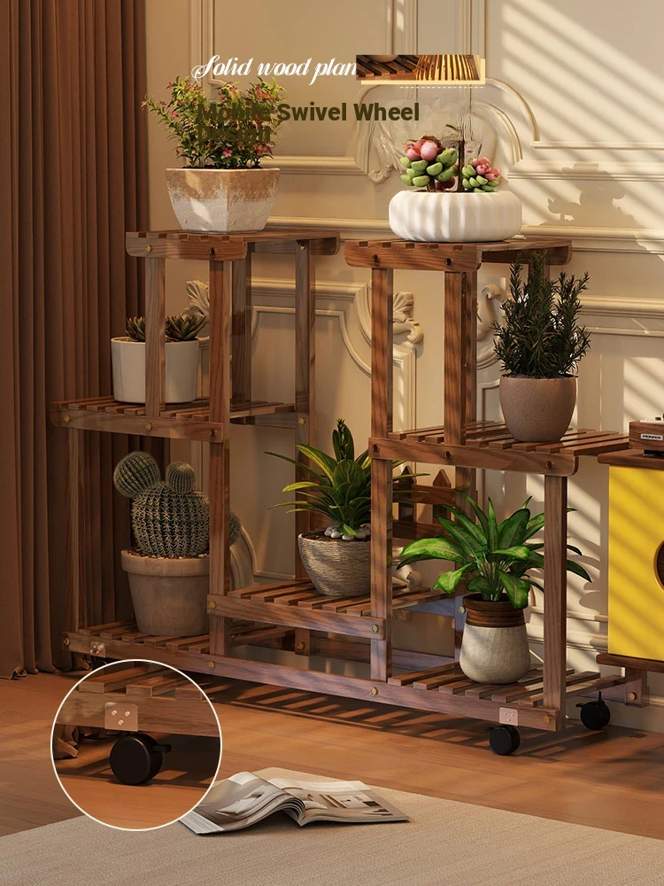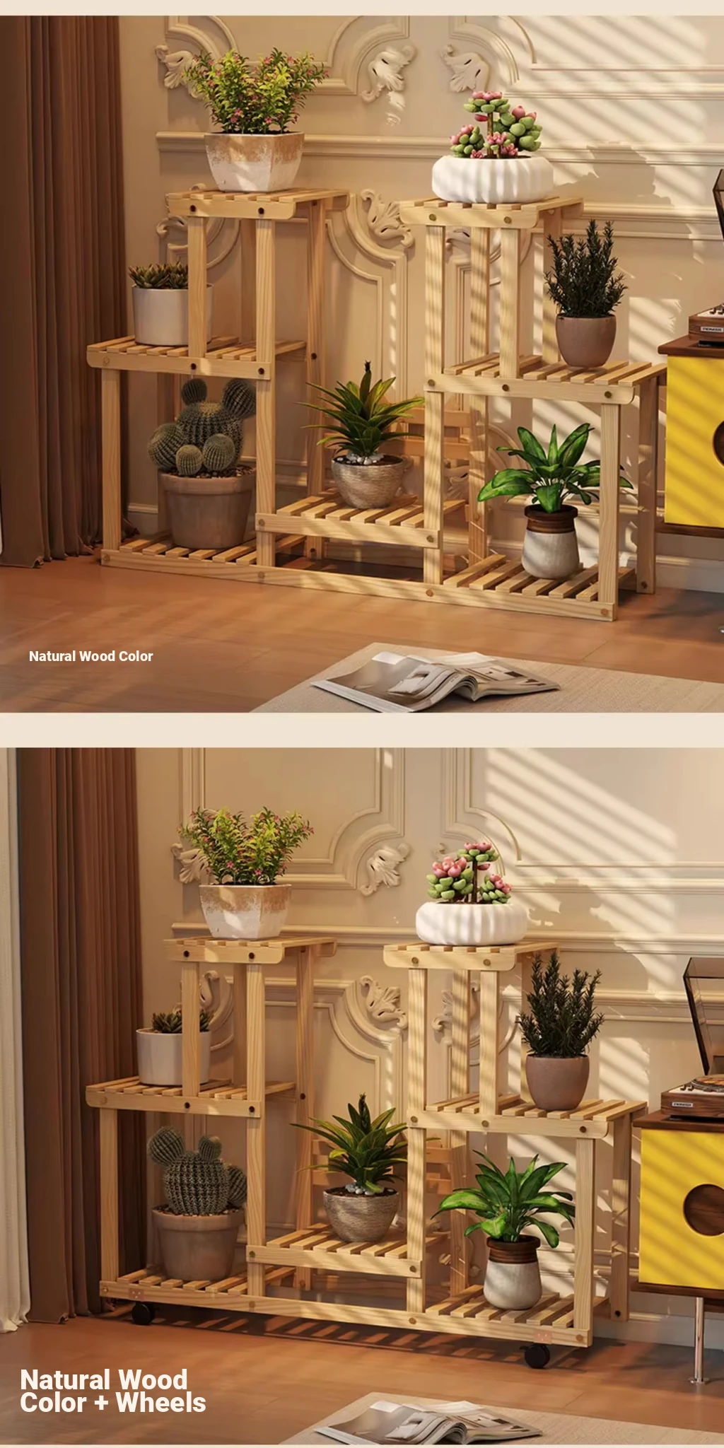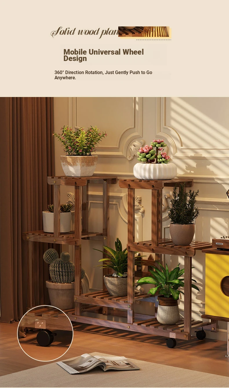 Natural Wood Color + Universal Wheels - Style C Plant Stand