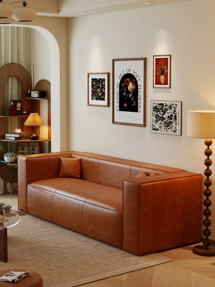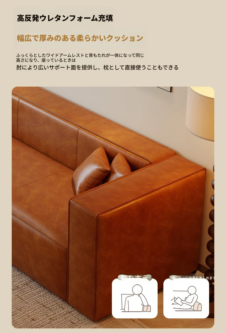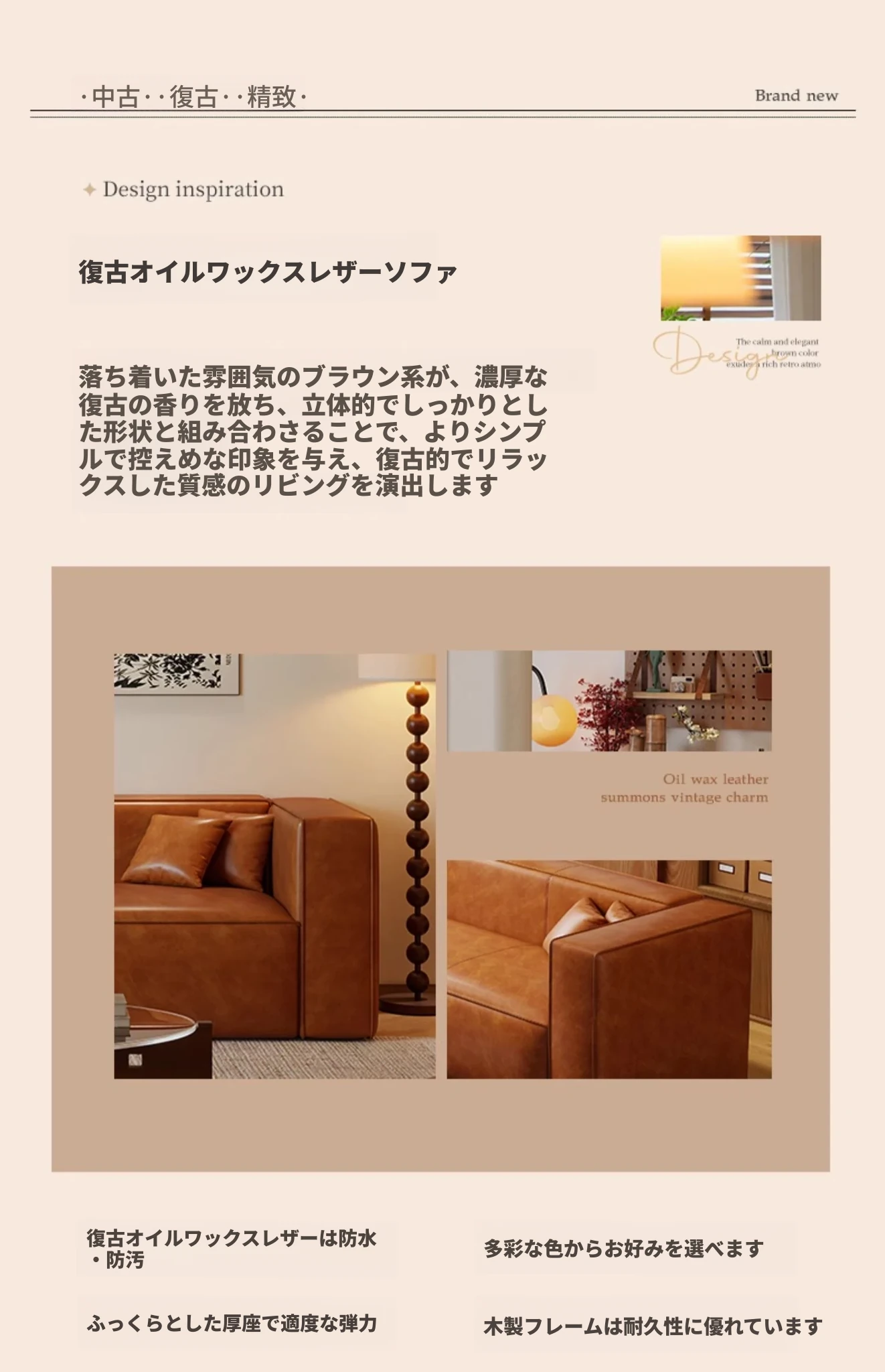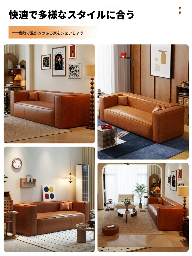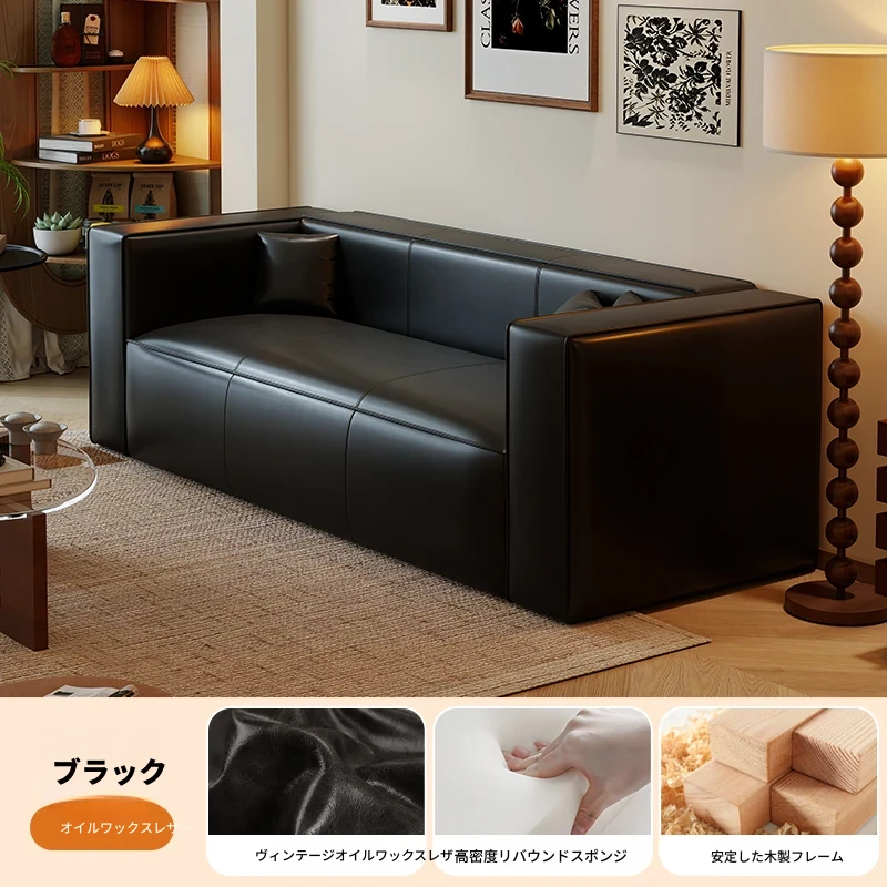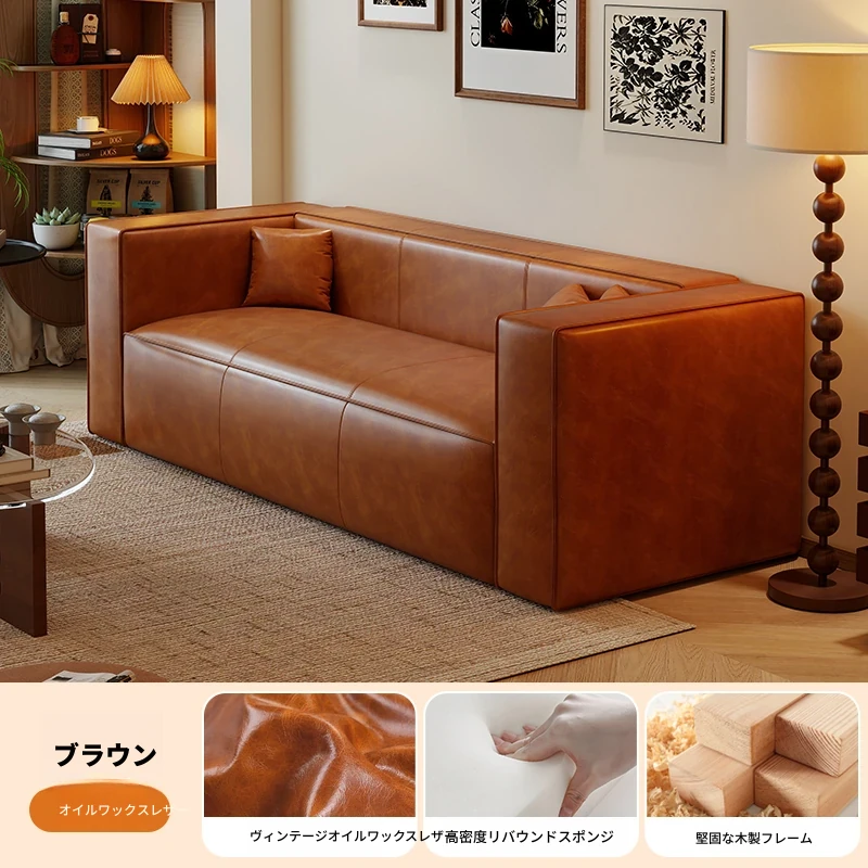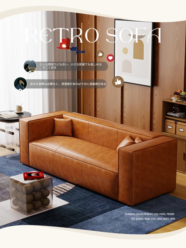 2025年新作!レトロオイルワックスレザー豆腐ブロックソファ - シンプルでおしゃれなミニマルデザイン、中古風の小型アパートにぴったり!リビングをスタイリッシュに演出します。