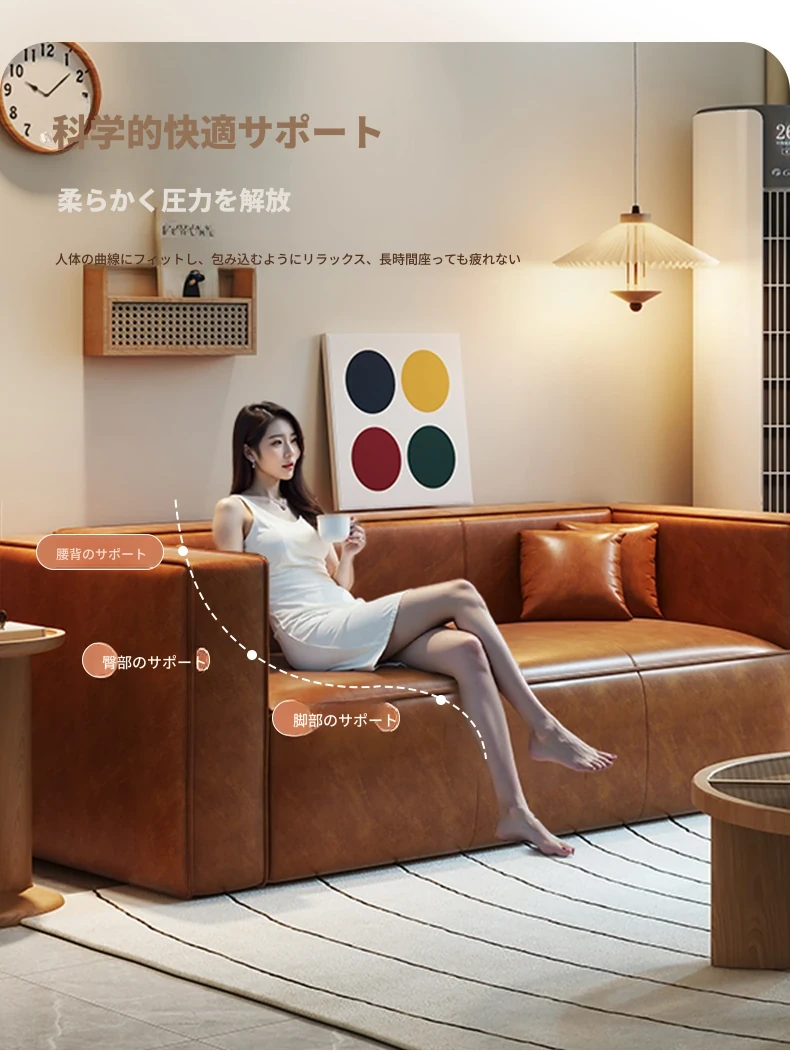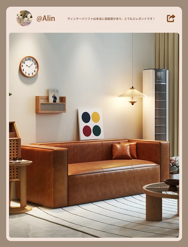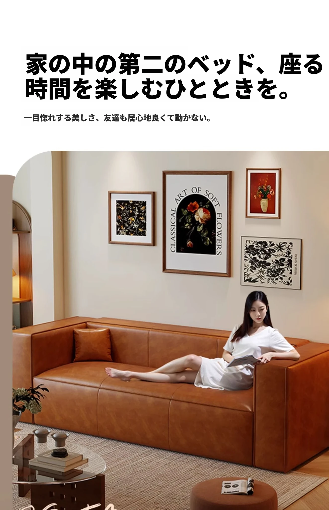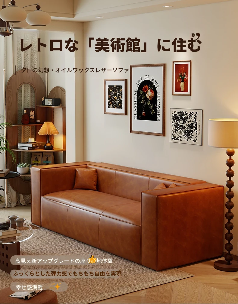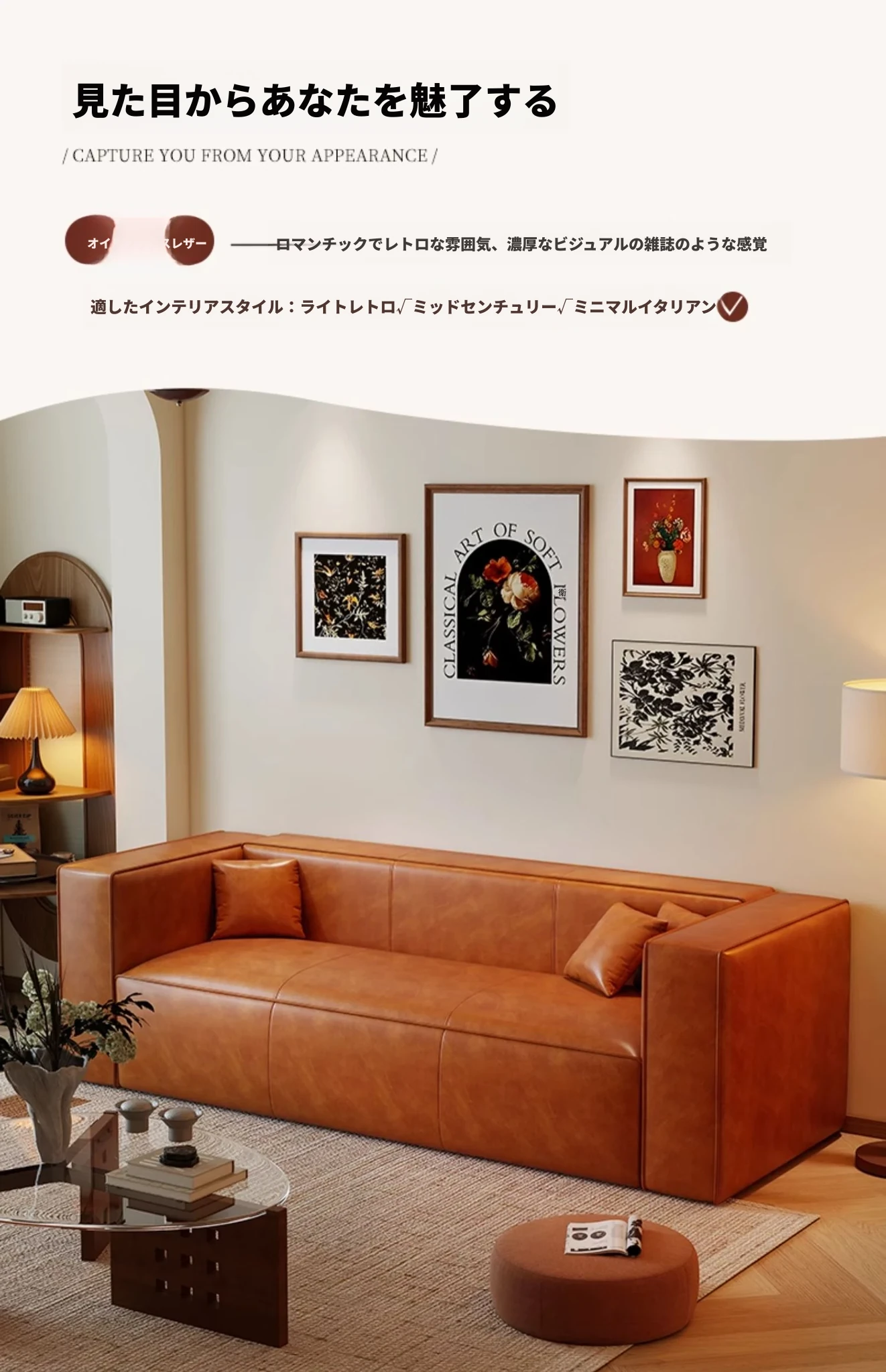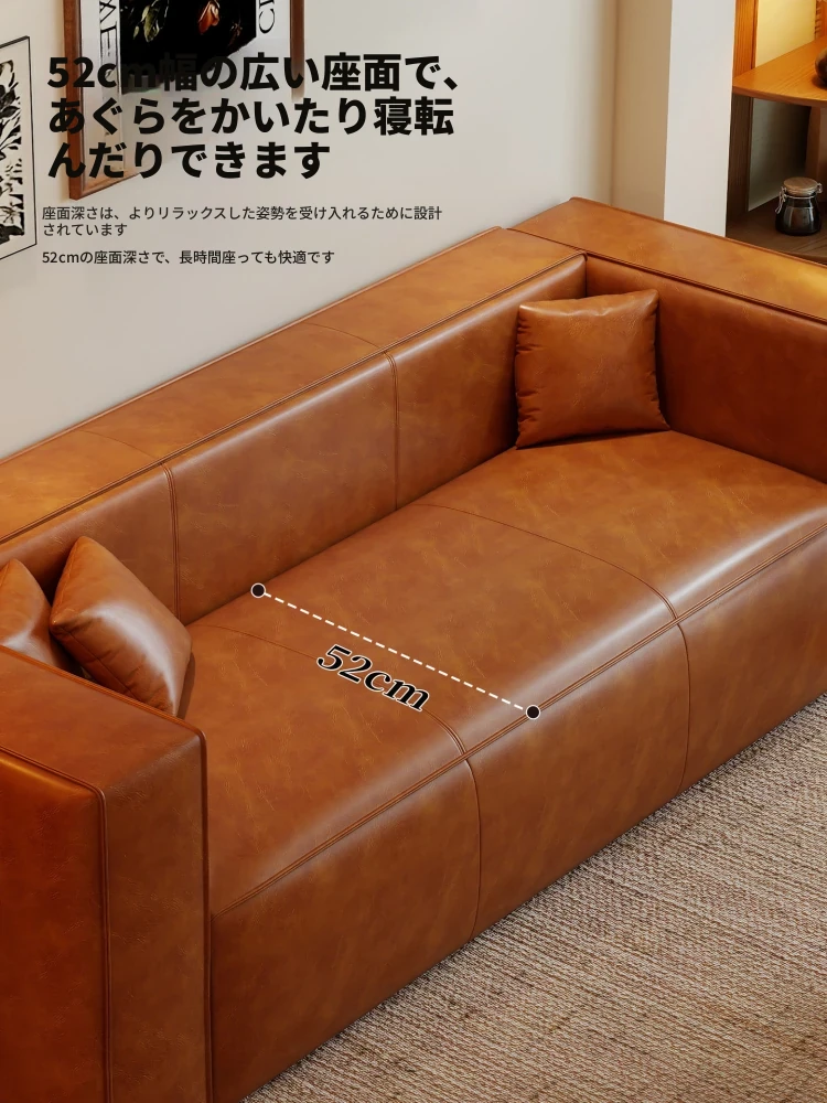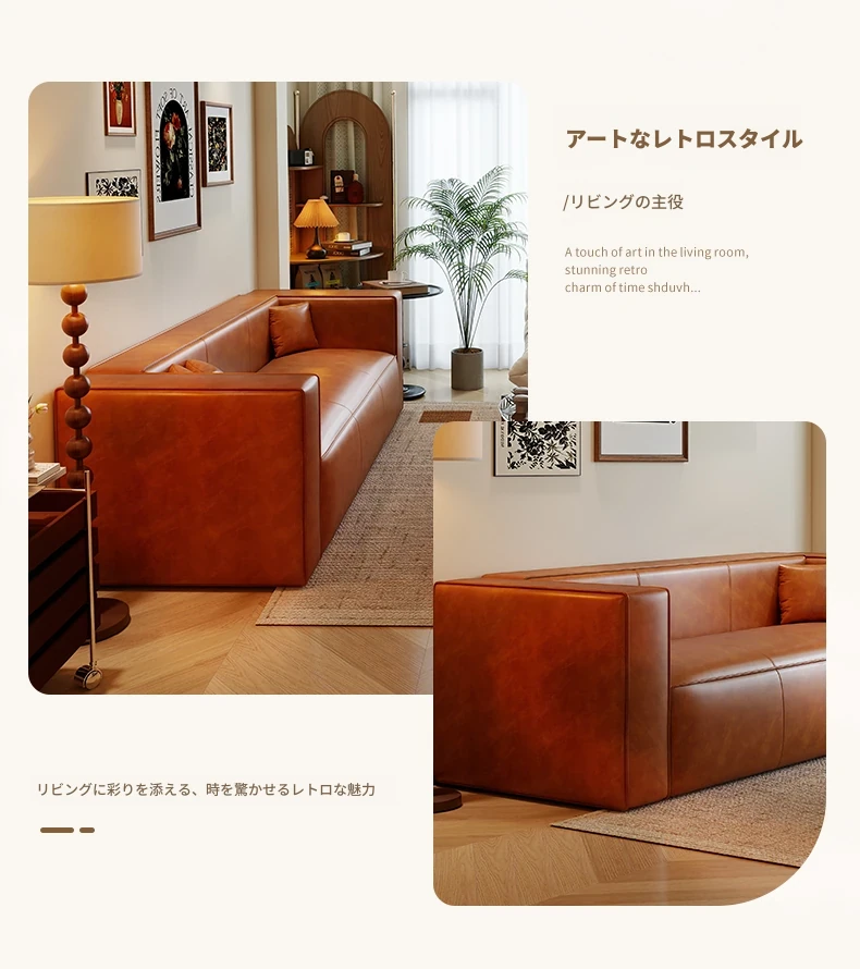 2025年新作!レトロオイルワックスレザー豆腐ブロックソファ - シンプルでおしゃれなミニマルデザイン、中古風の小型アパートにぴったり!リビングをスタイリッシュに演出します。