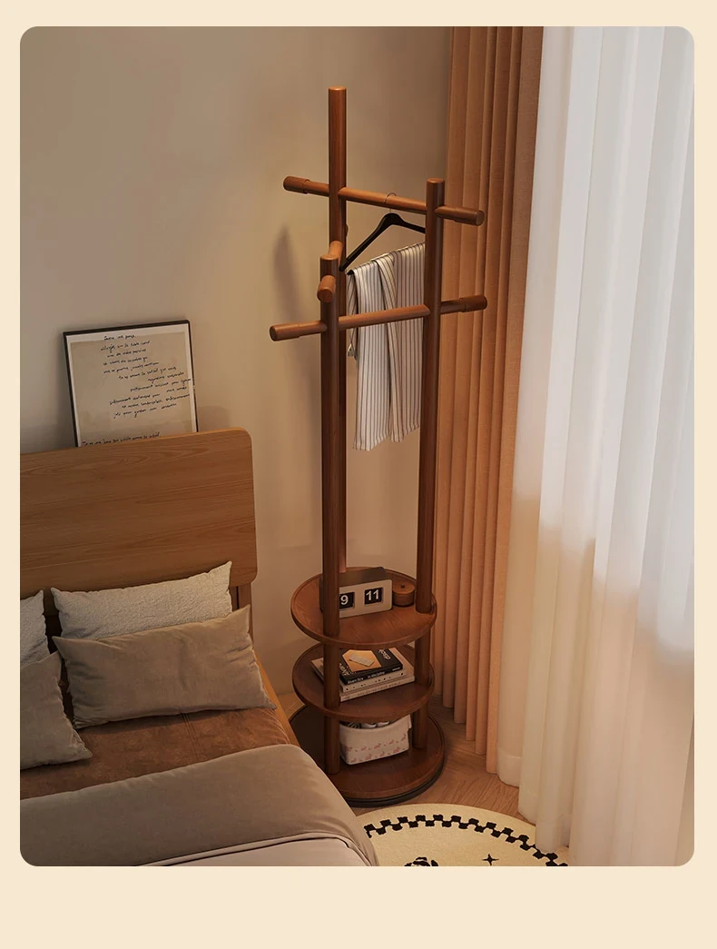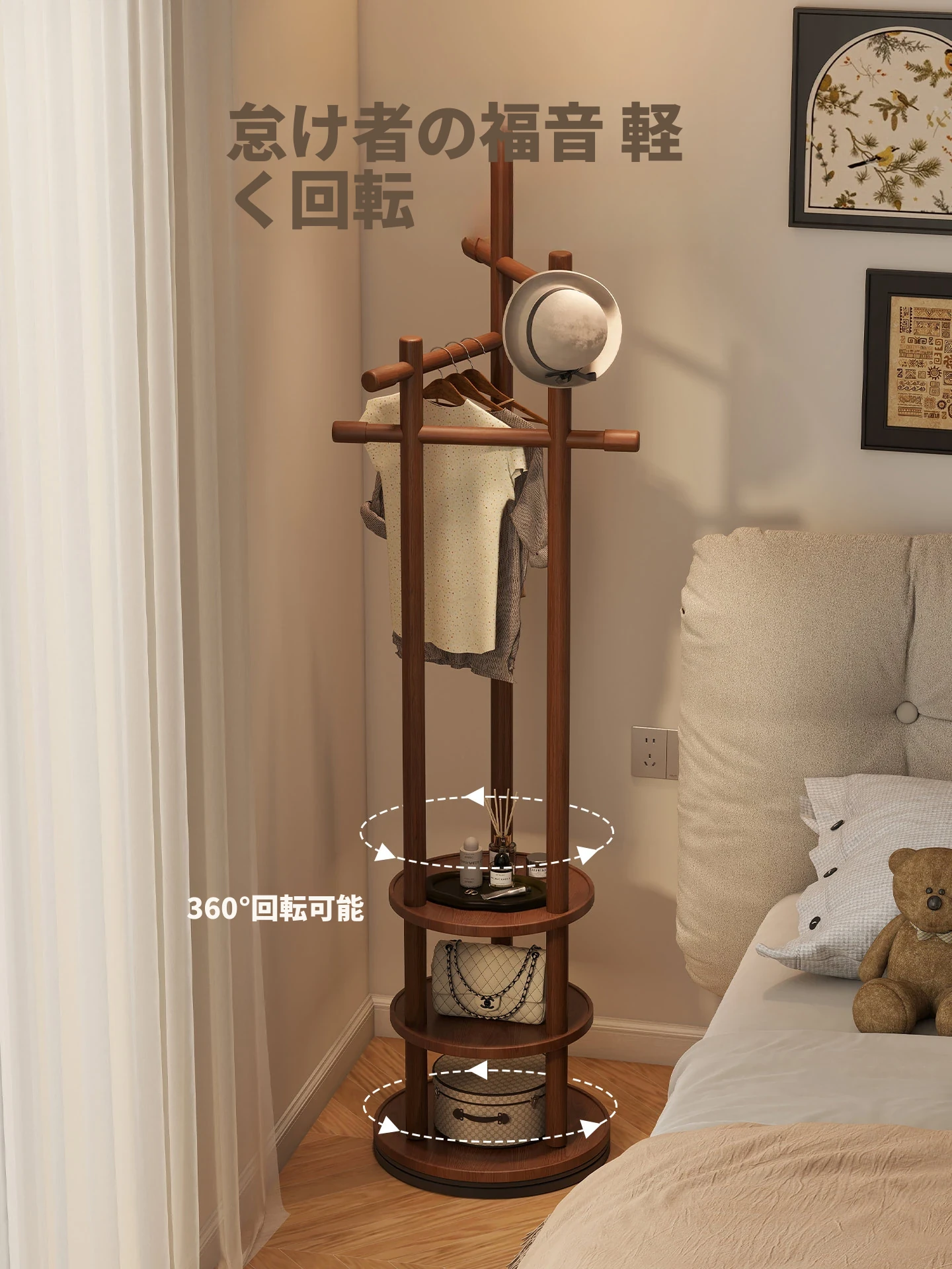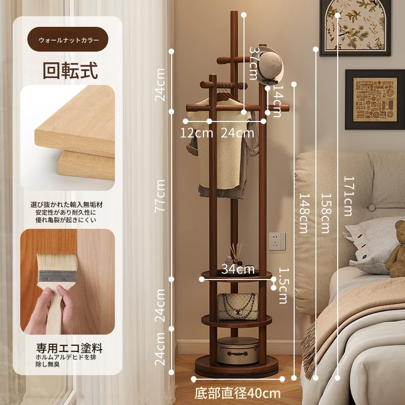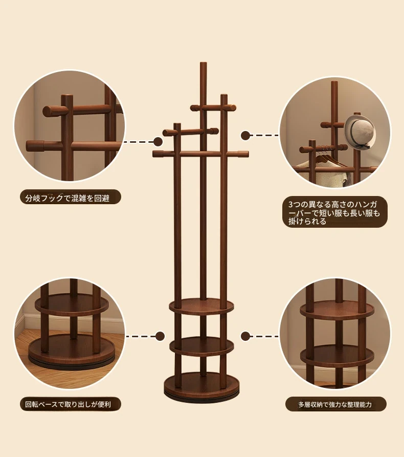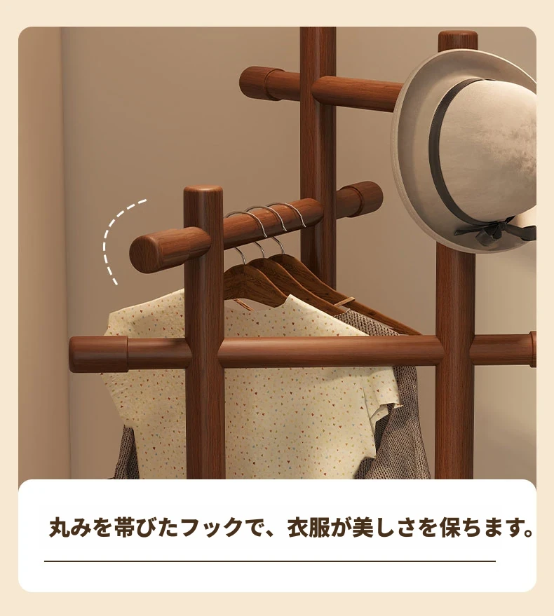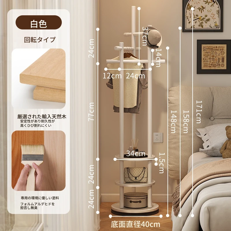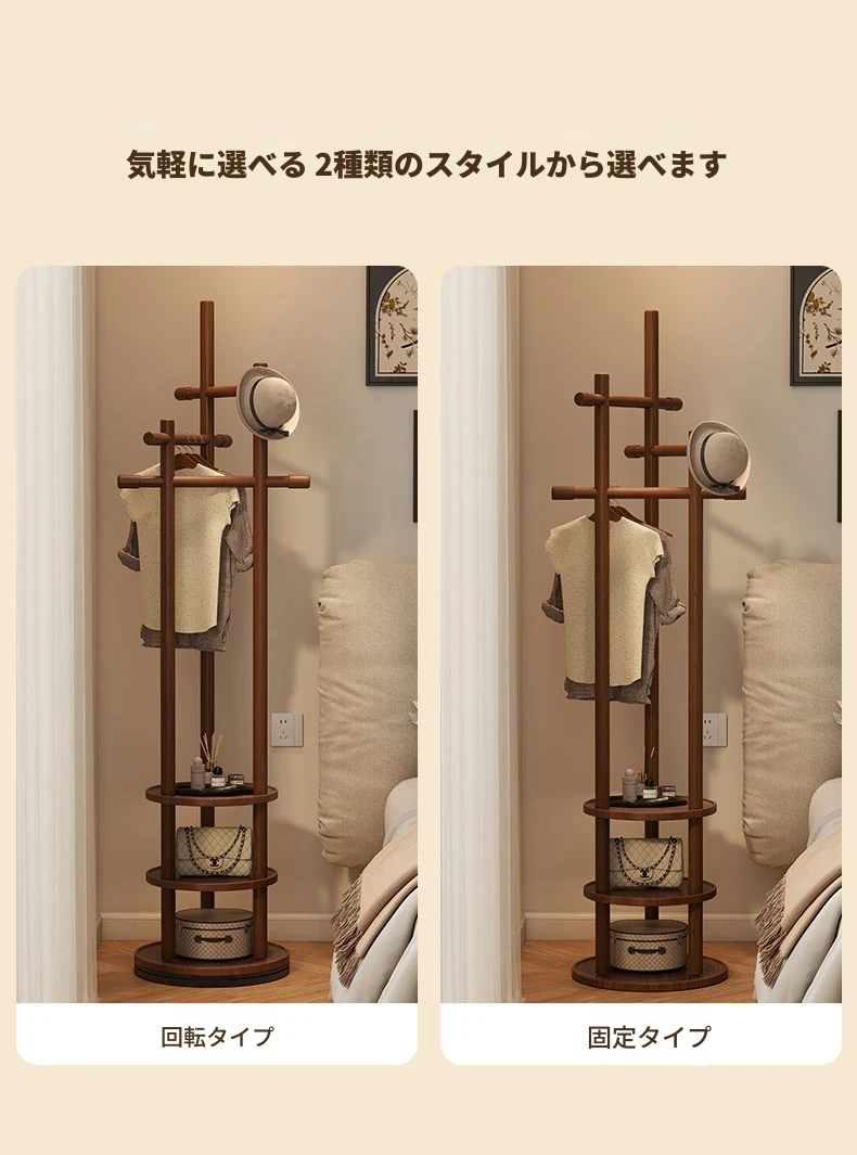スリムでスペースを取らない、実木製の回転式ハンガーラック - 寝室やリビングに最適な小型の衣類収納!ベッドサイドにぴったり、スタイリッシュで機能的な衣類掛け。