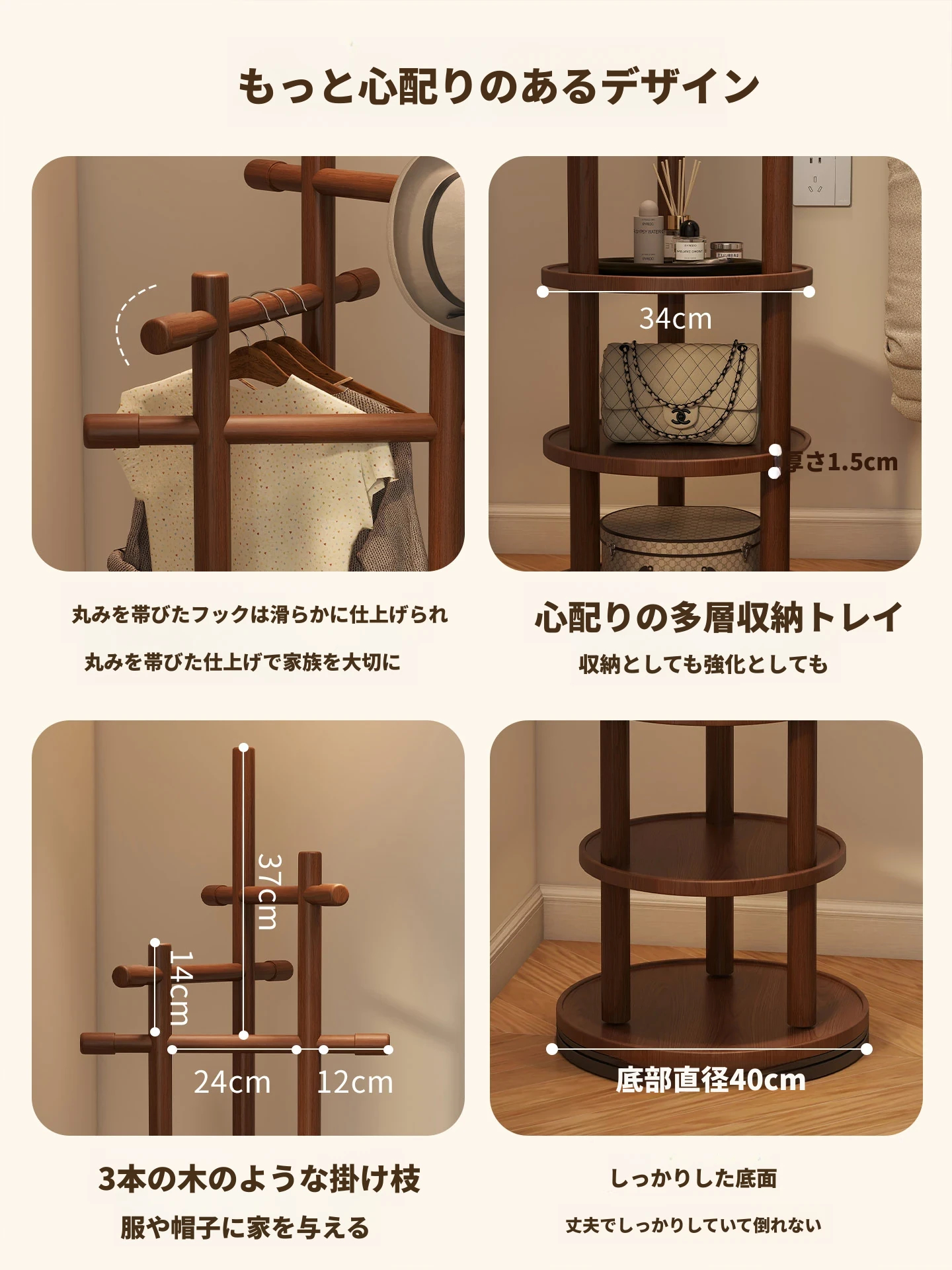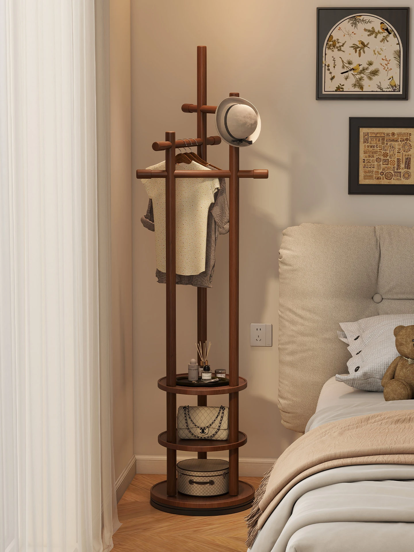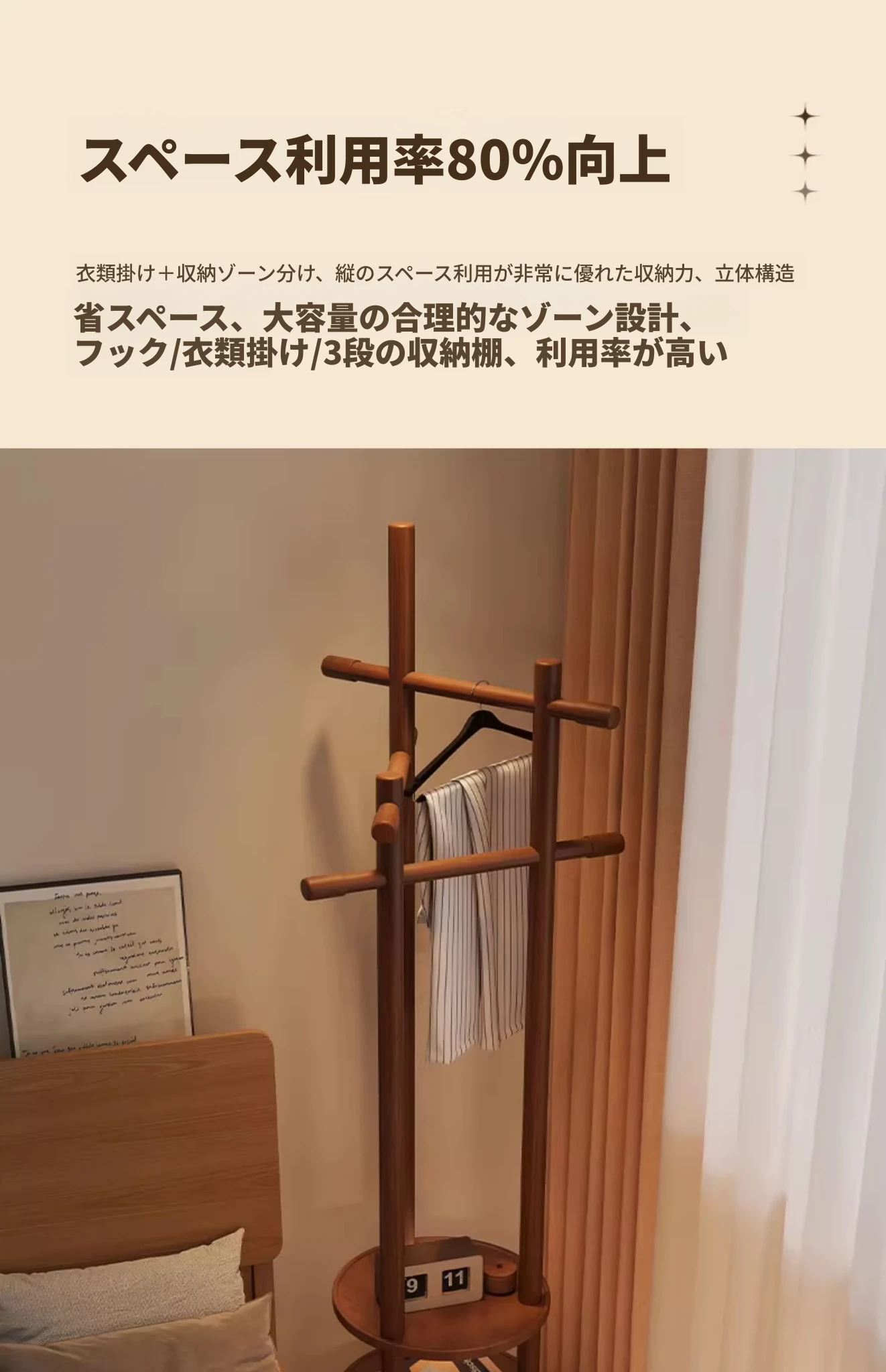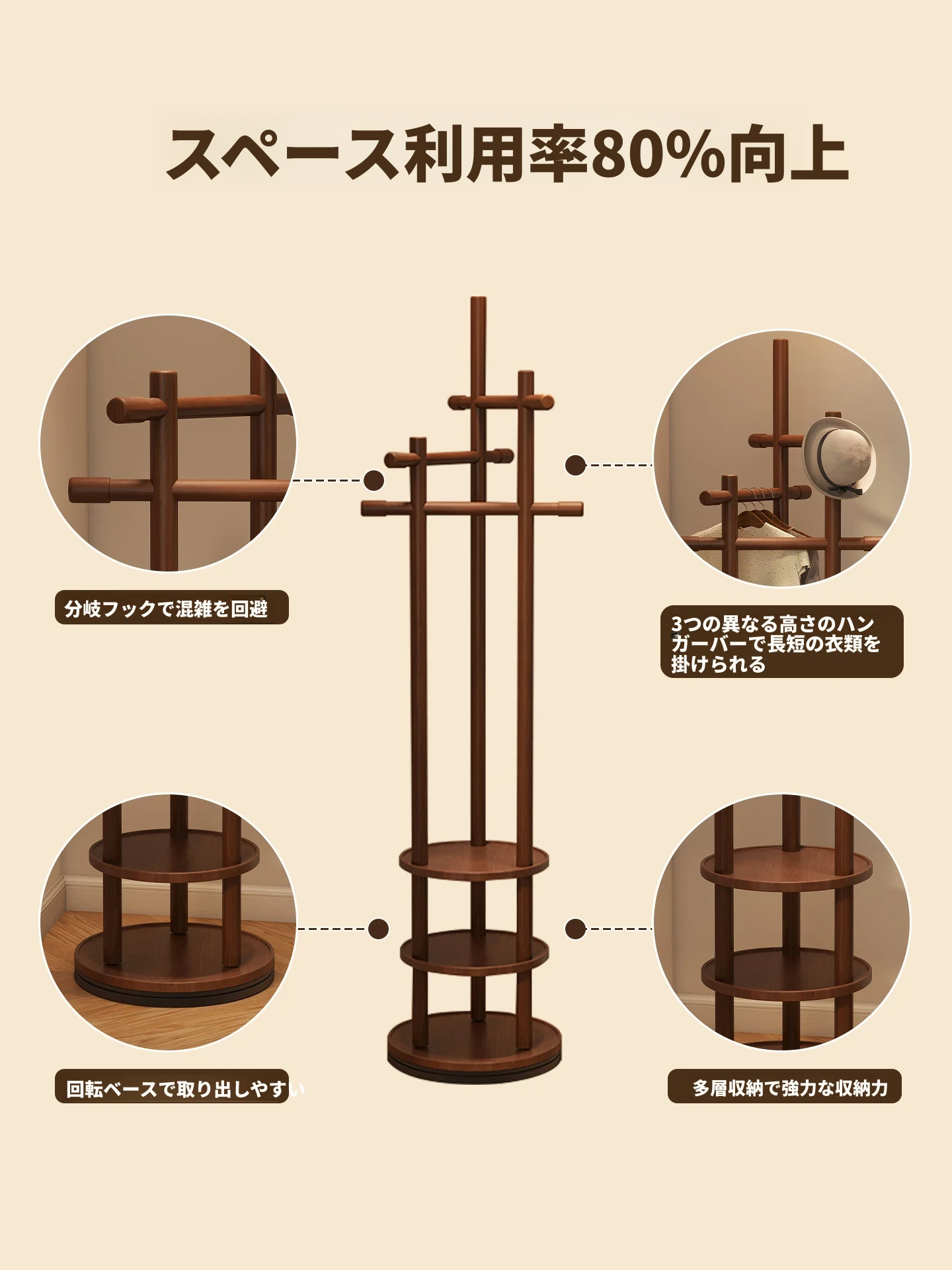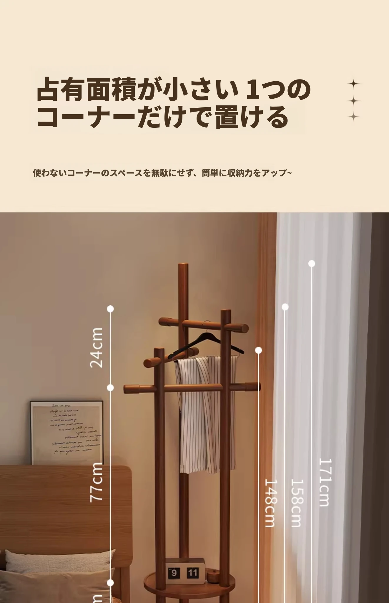 スリムでスペースを取らない、実木製の回転式ハンガーラック - 寝室やリビングに最適な小型の衣類収納!ベッドサイドにぴったり、スタイリッシュで機能的な衣類掛け。