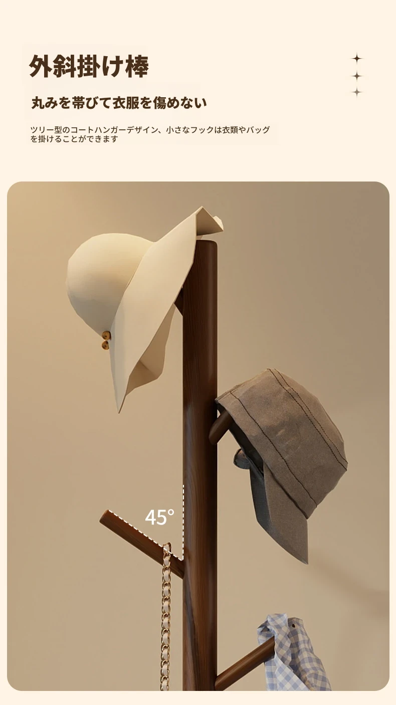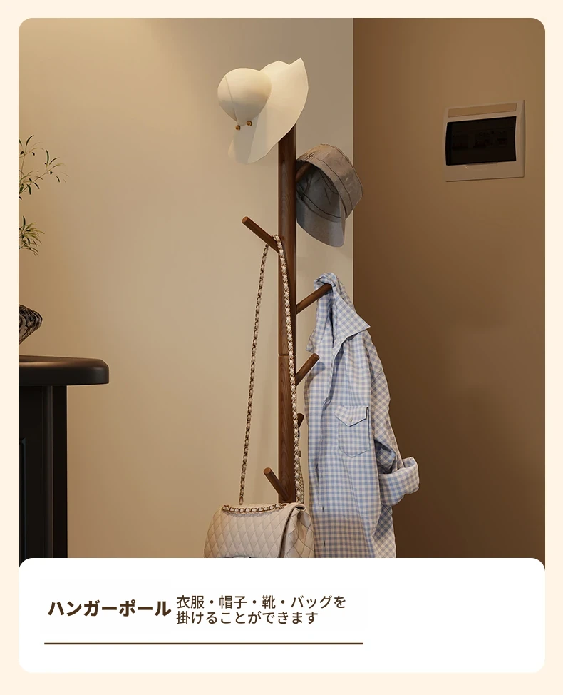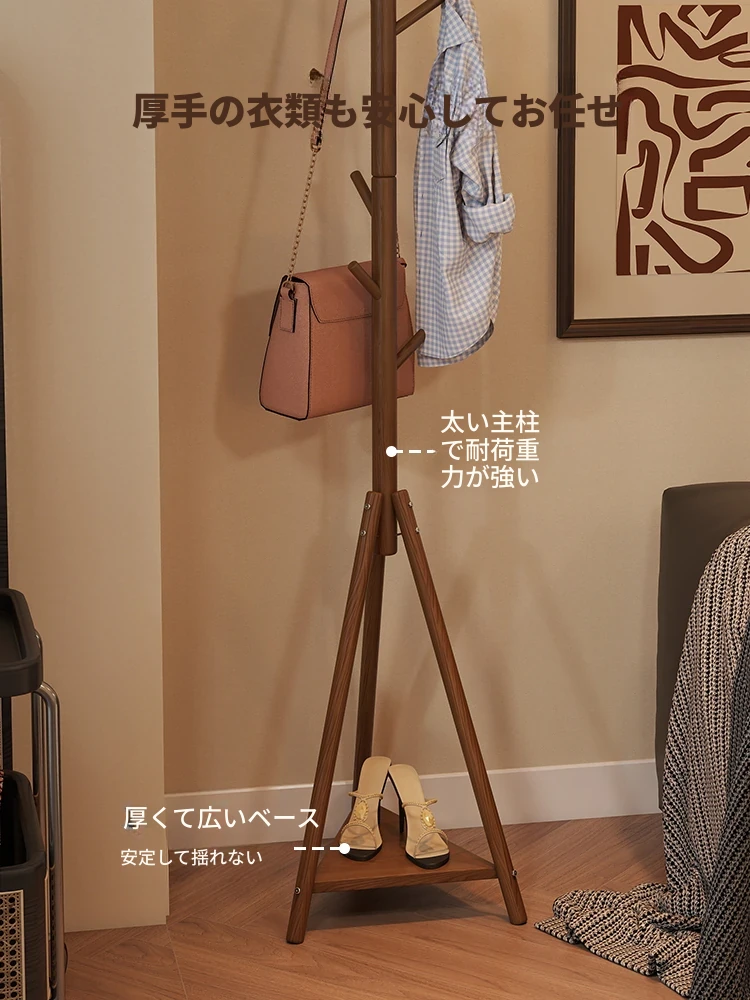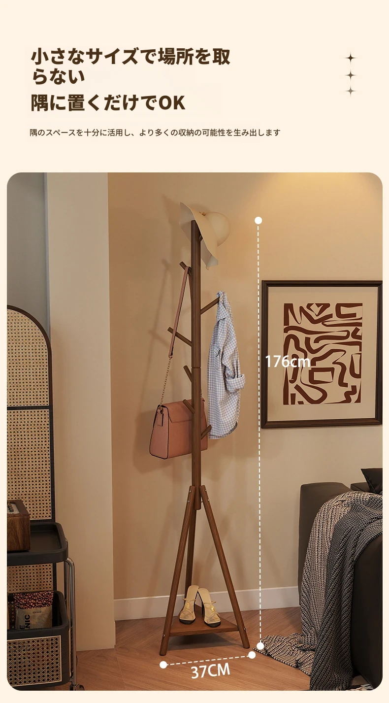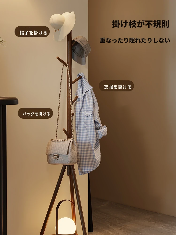 天然木材使用のスタイリッシュなフロアコートハンガー - おしゃれな枝のデザインで、寝室やリビングに最適!シンプルなスタンド式でバッグや帽子も掛けられる、家での便利な収納アイテム。