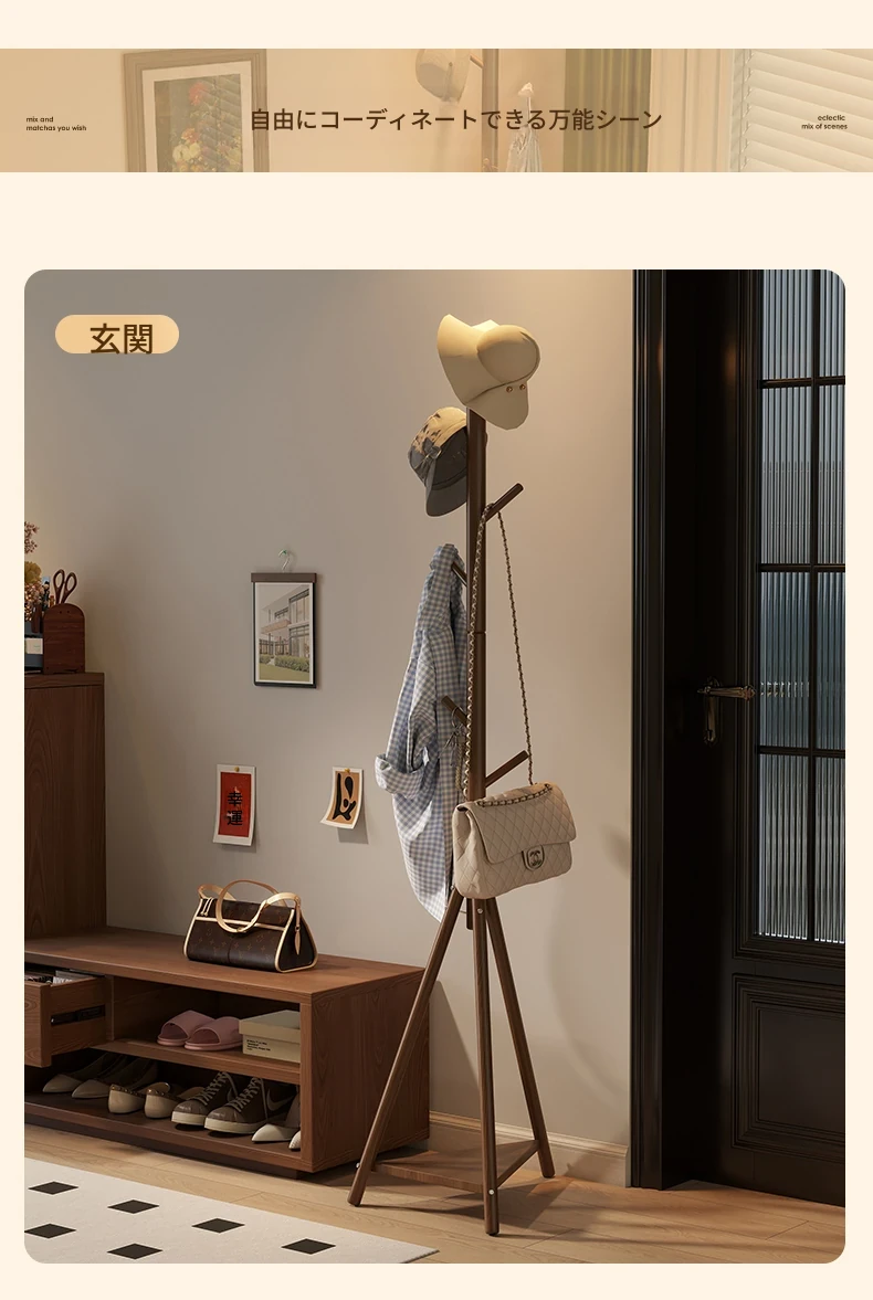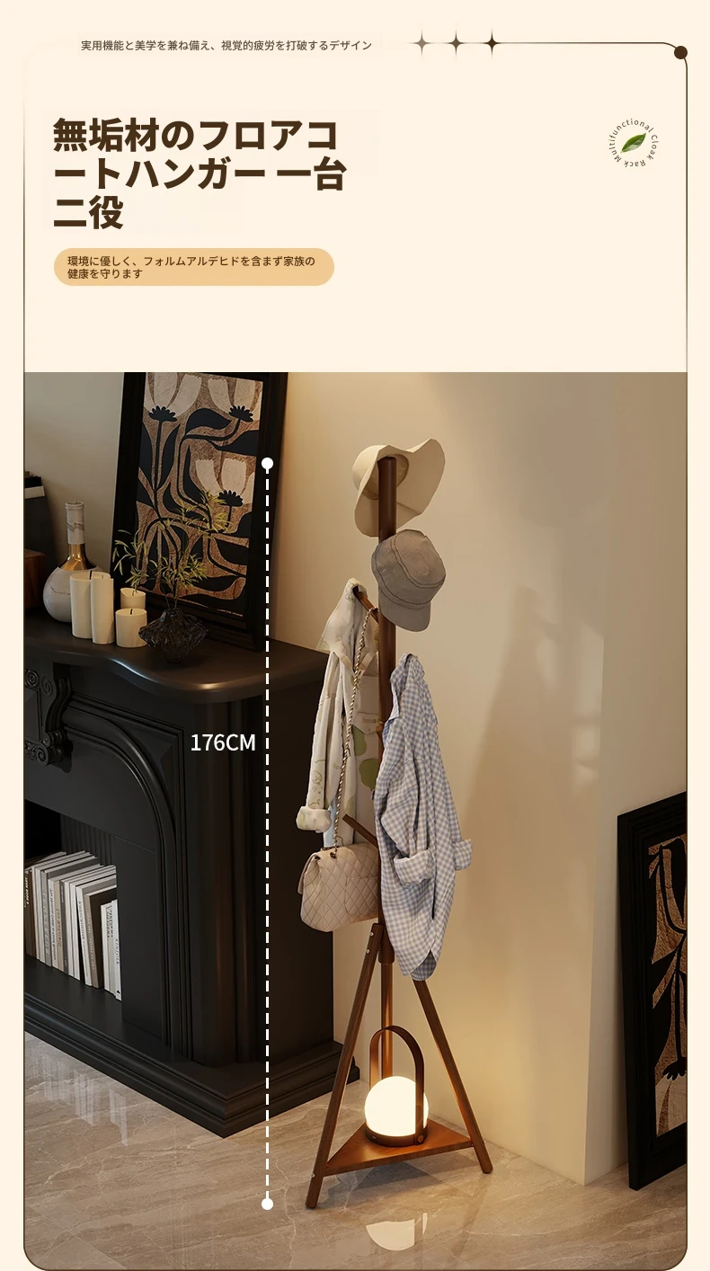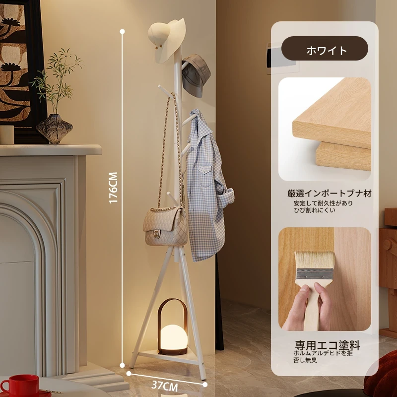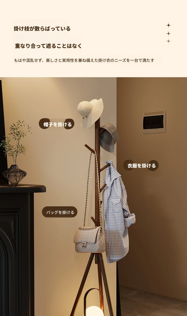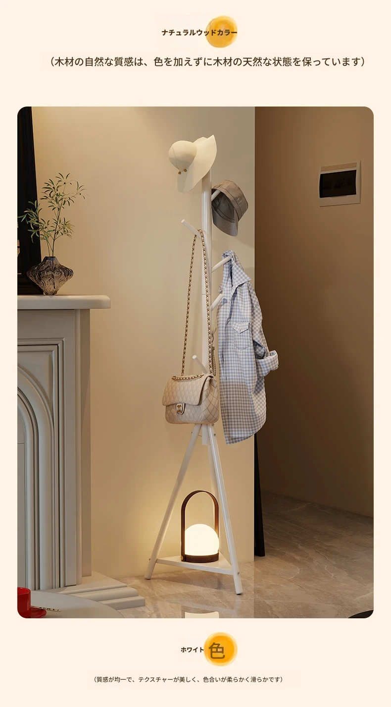 天然木材使用のスタイリッシュなフロアコートハンガー - おしゃれな枝のデザインで、寝室やリビングに最適!シンプルなスタンド式でバッグや帽子も掛けられる、家での便利な収納アイテム。