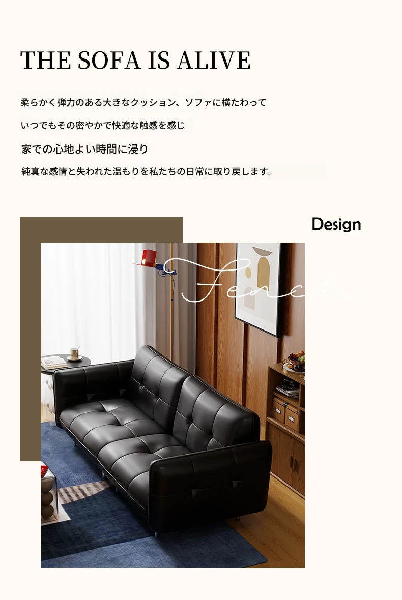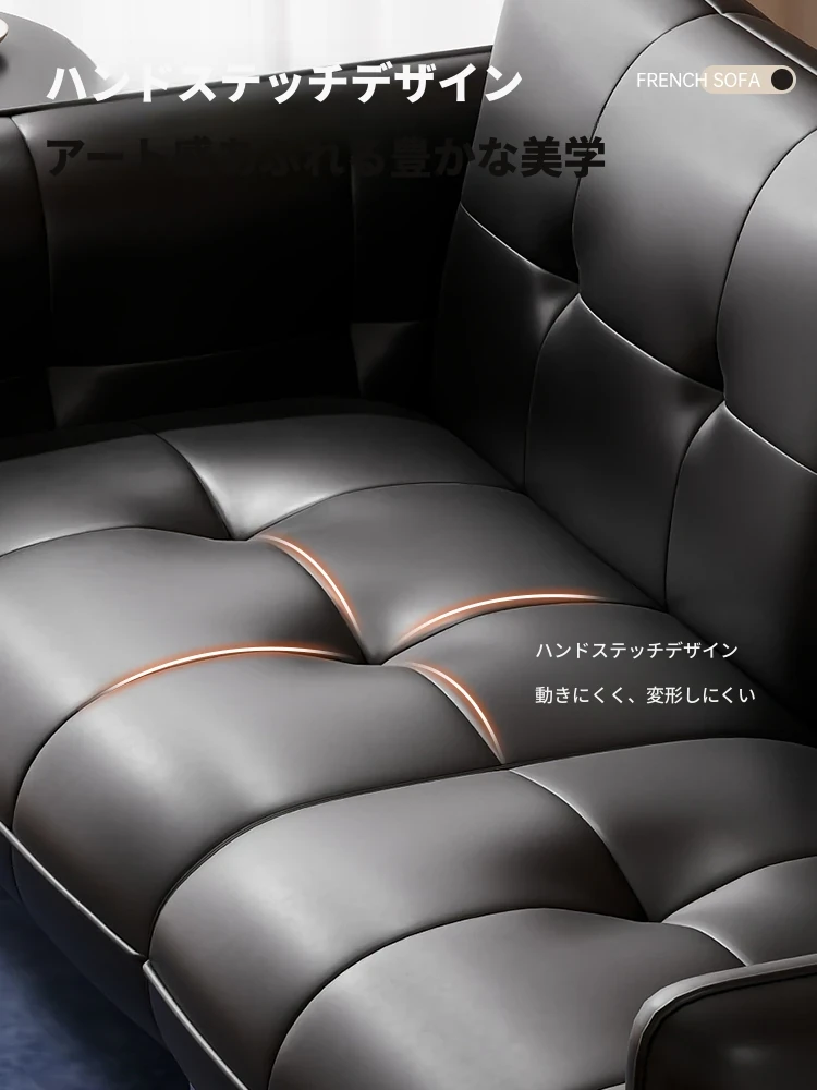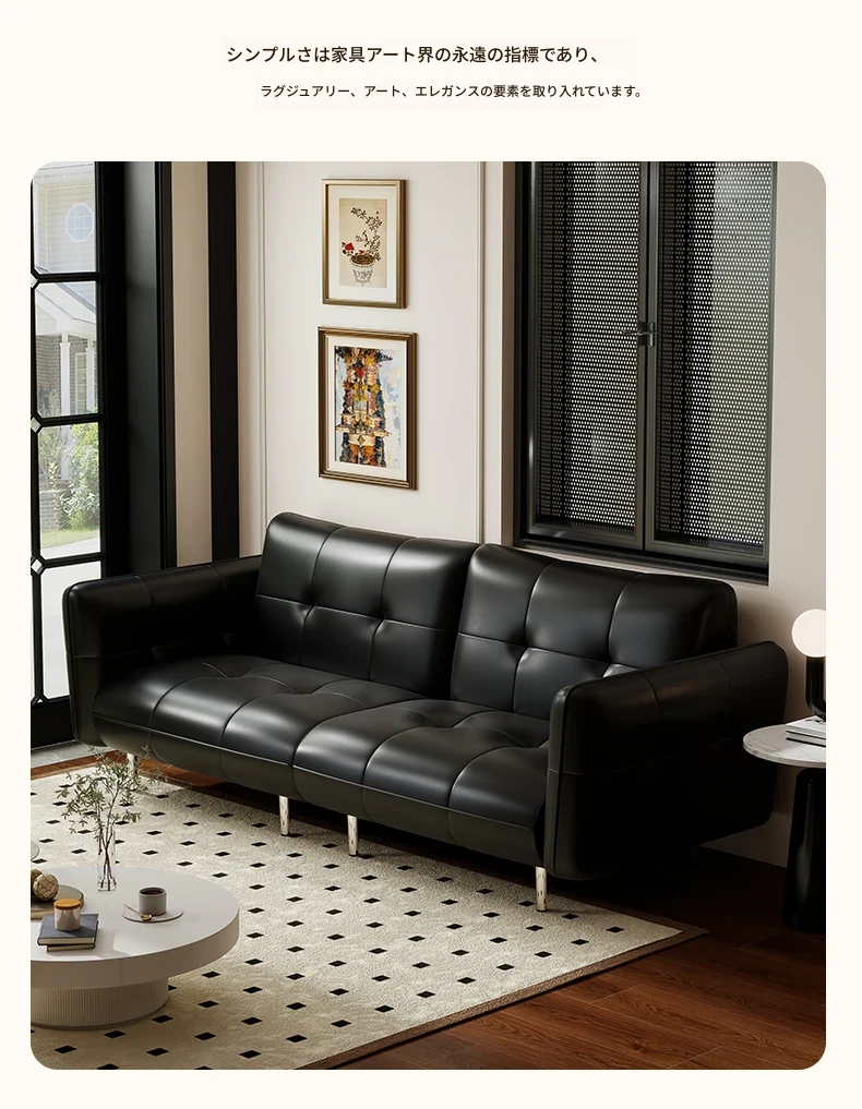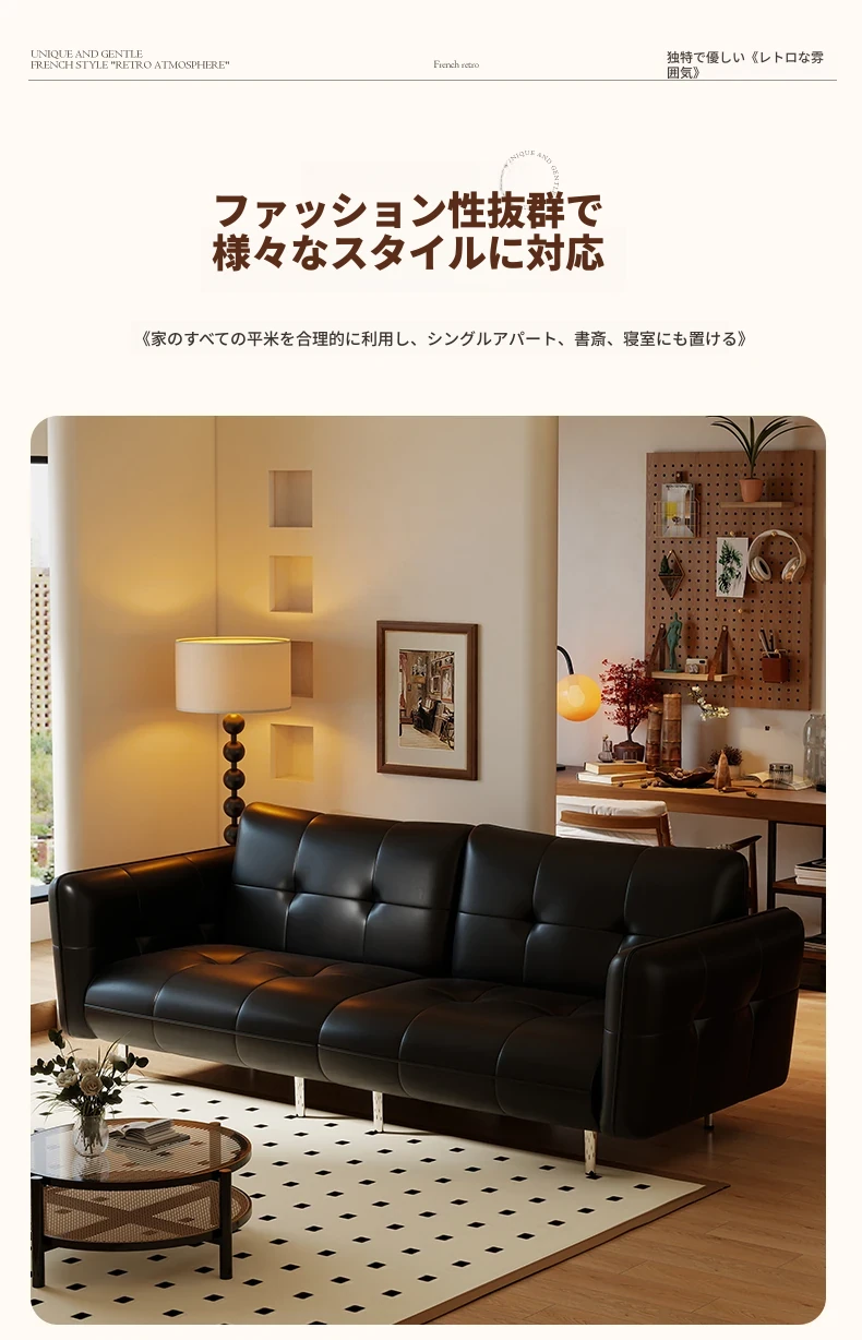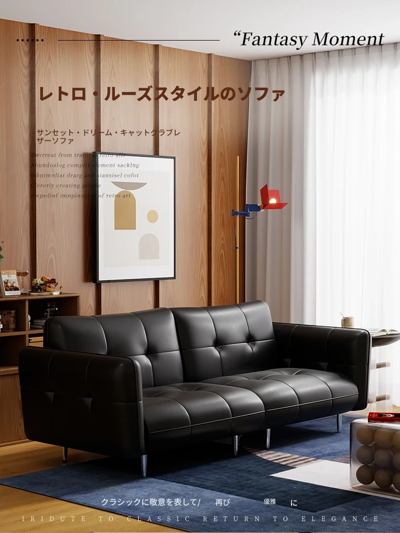 フレンチレトロスタイルの革製ソファ - 中古風の直線デザインで、小型住宅やモデルルームに最適!高級感あふれるアメリカンラグジュアリー、シックなブラックソファで、あなたのリビングを華やかに演出します。