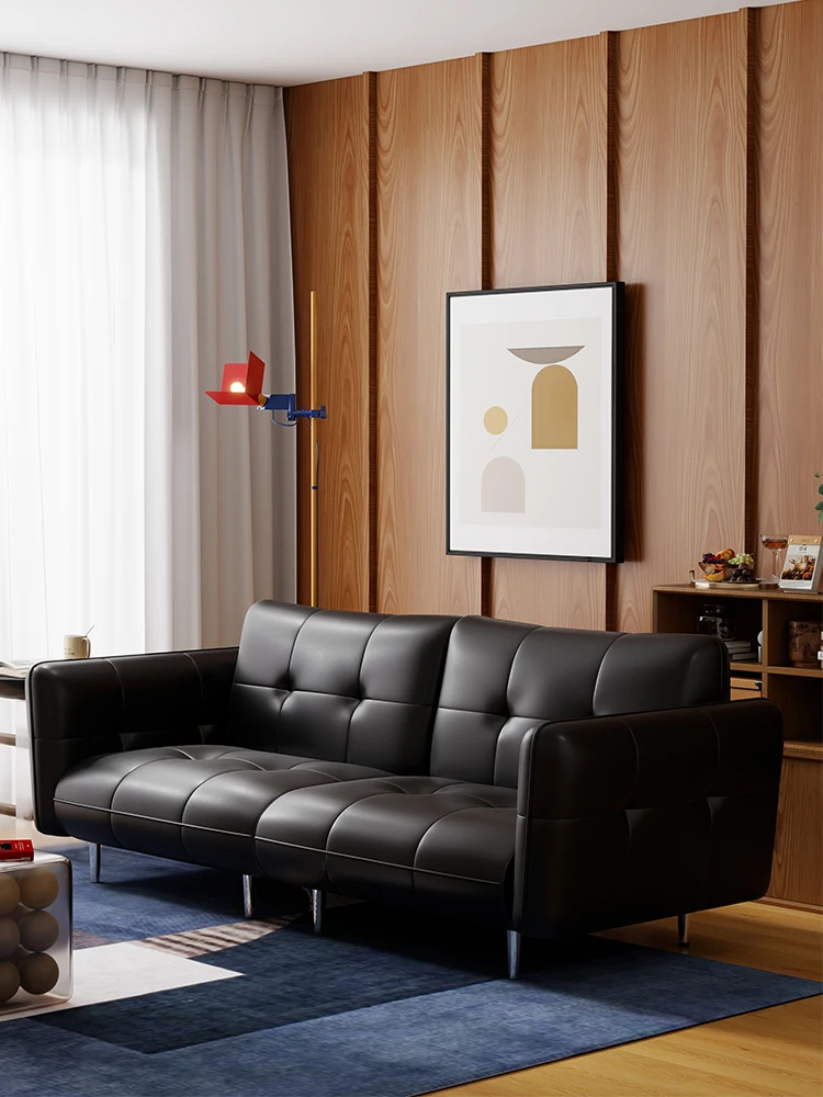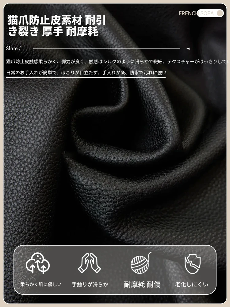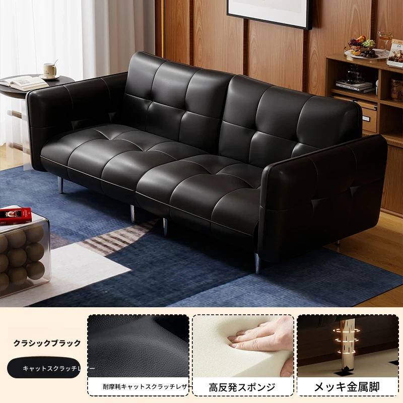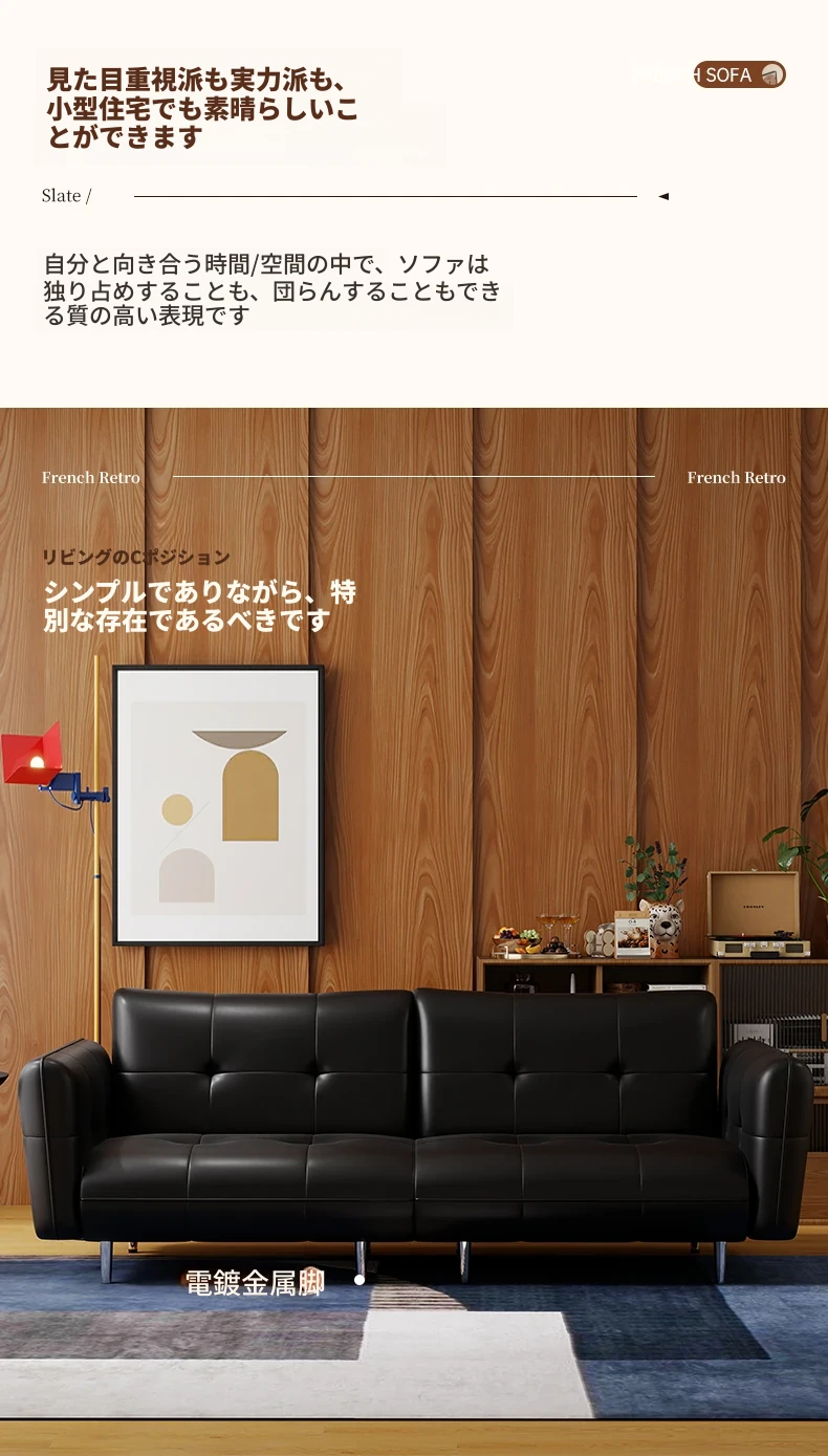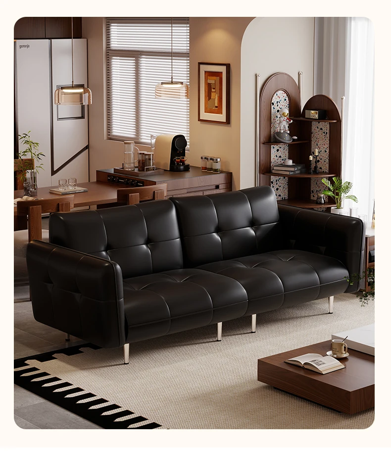 フレンチレトロスタイルの革製ソファ - 中古風の直線デザインで、小型住宅やモデルルームに最適!高級感あふれるアメリカンラグジュアリー、シックなブラックソファで、あなたのリビングを華やかに演出します。