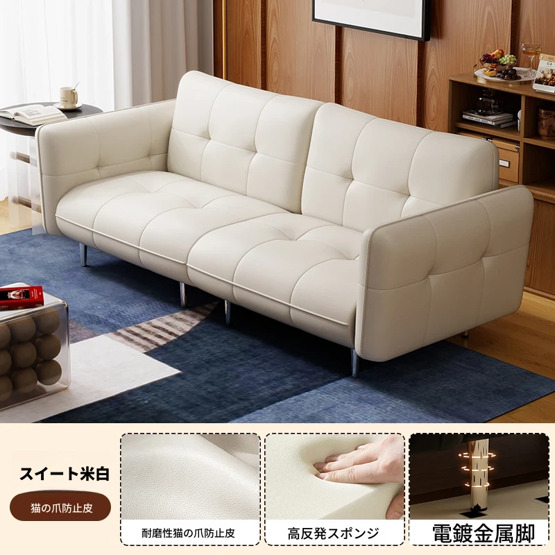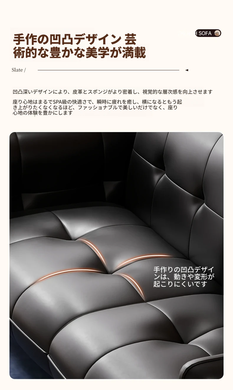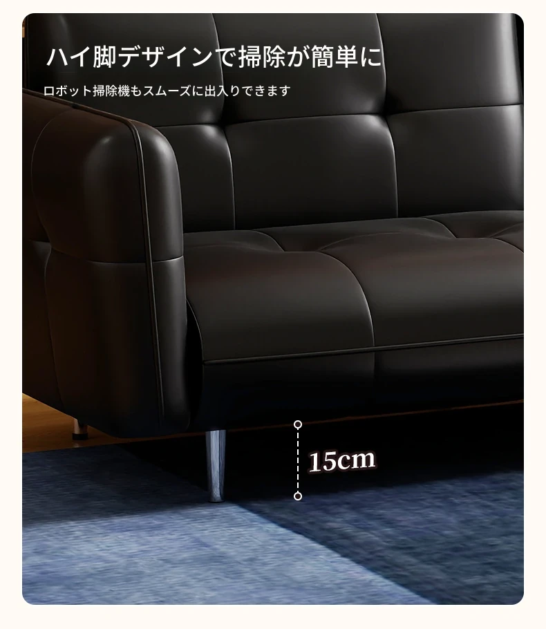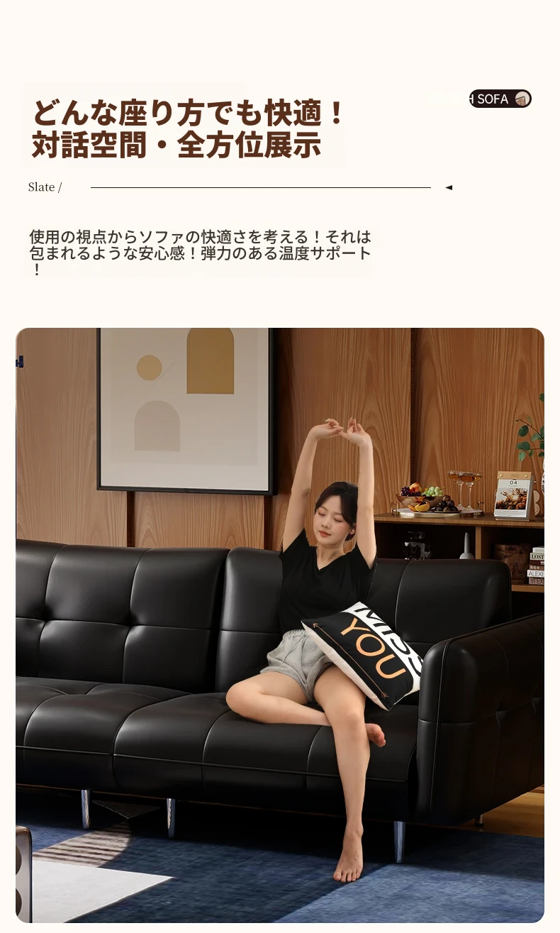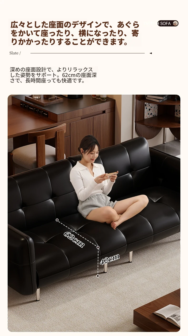 フレンチレトロスタイルの革製ソファ - 中古風の直線デザインで、小型住宅やモデルルームに最適!高級感あふれるアメリカンラグジュアリー、シックなブラックソファで、あなたのリビングを華やかに演出します。