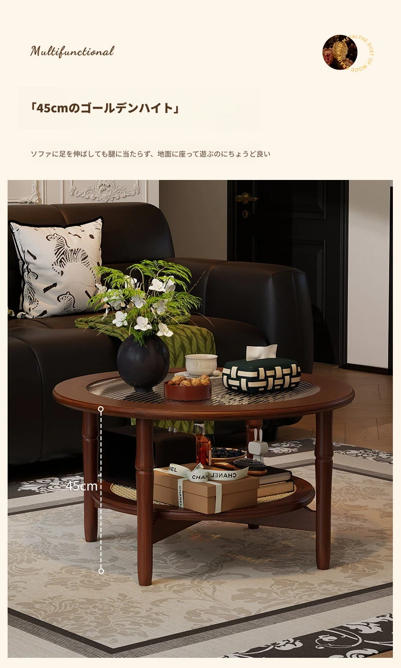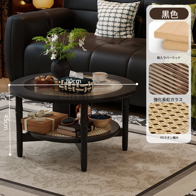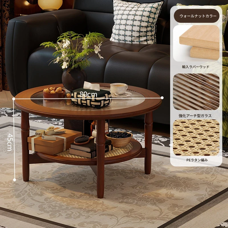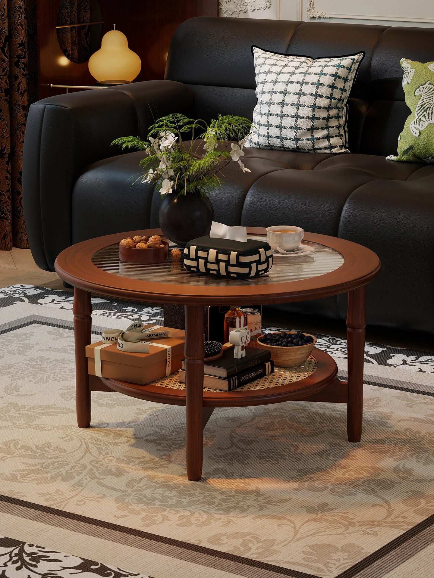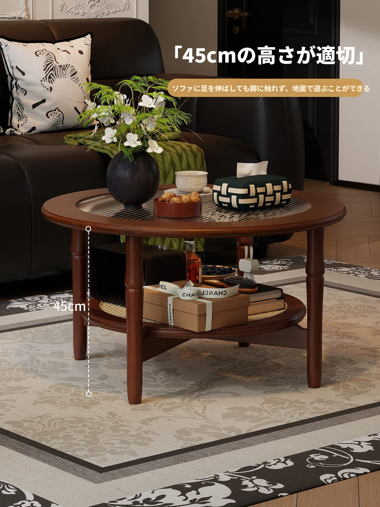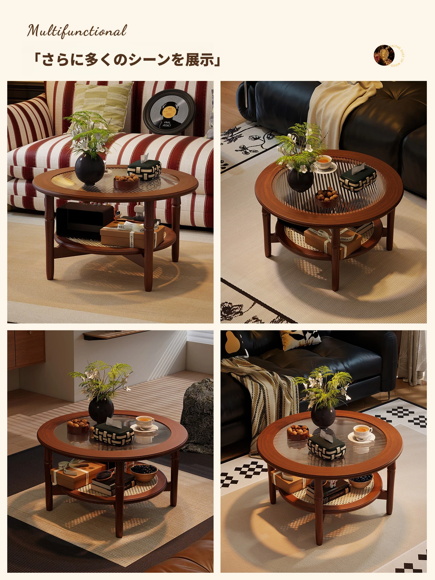 フランス風レトロ実木製ラウンドコーヒーテーブル - 中古のリビングルームにぴったり!ガラス2段式のティーテーブル、小さなスペースにも最適な籐製のコンパクトデザイン。おしゃれな空間を演出します!