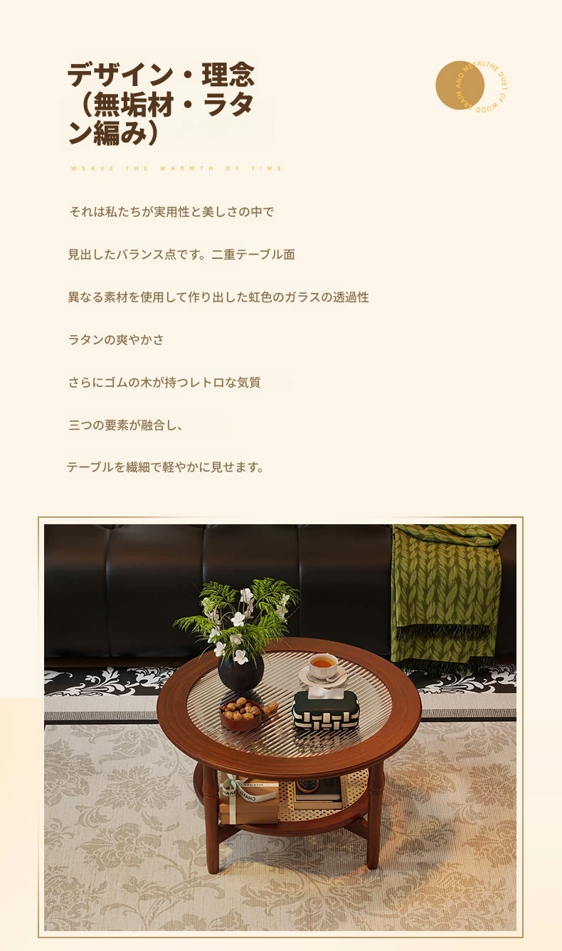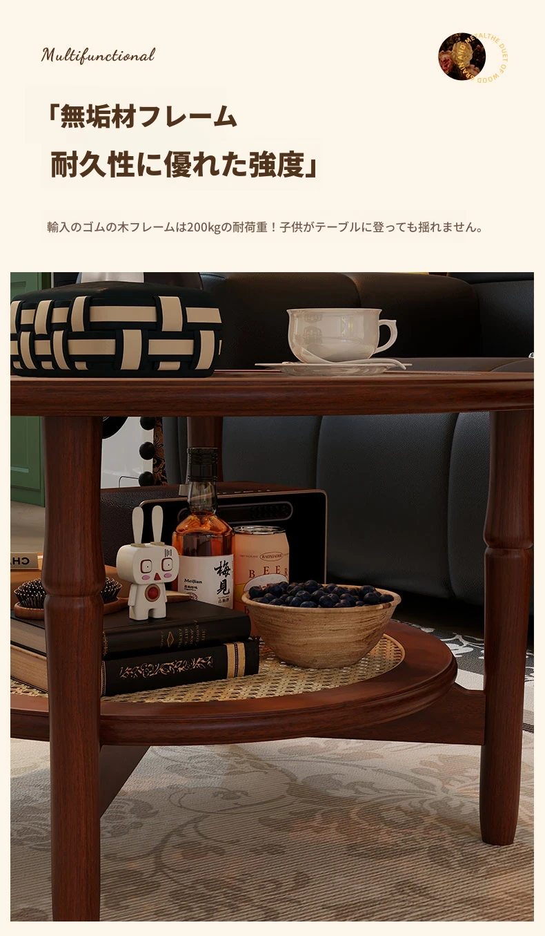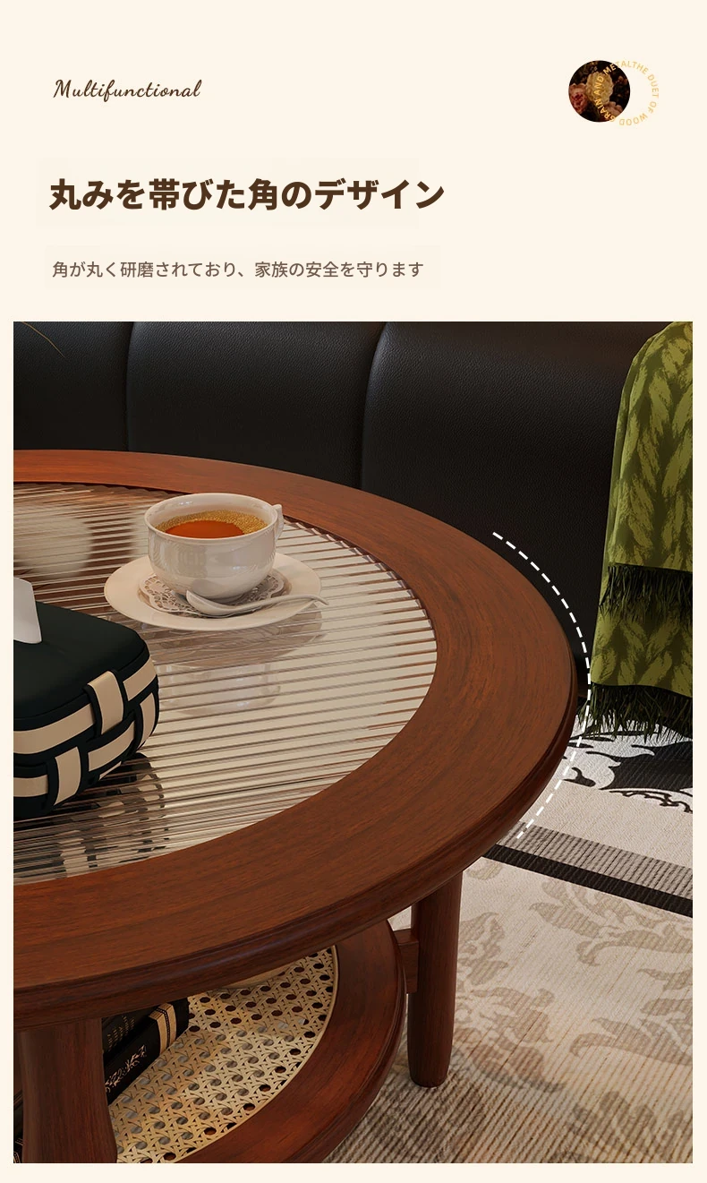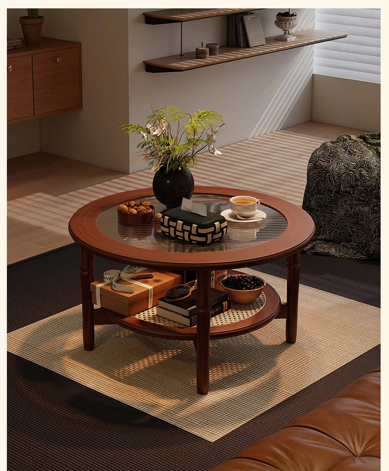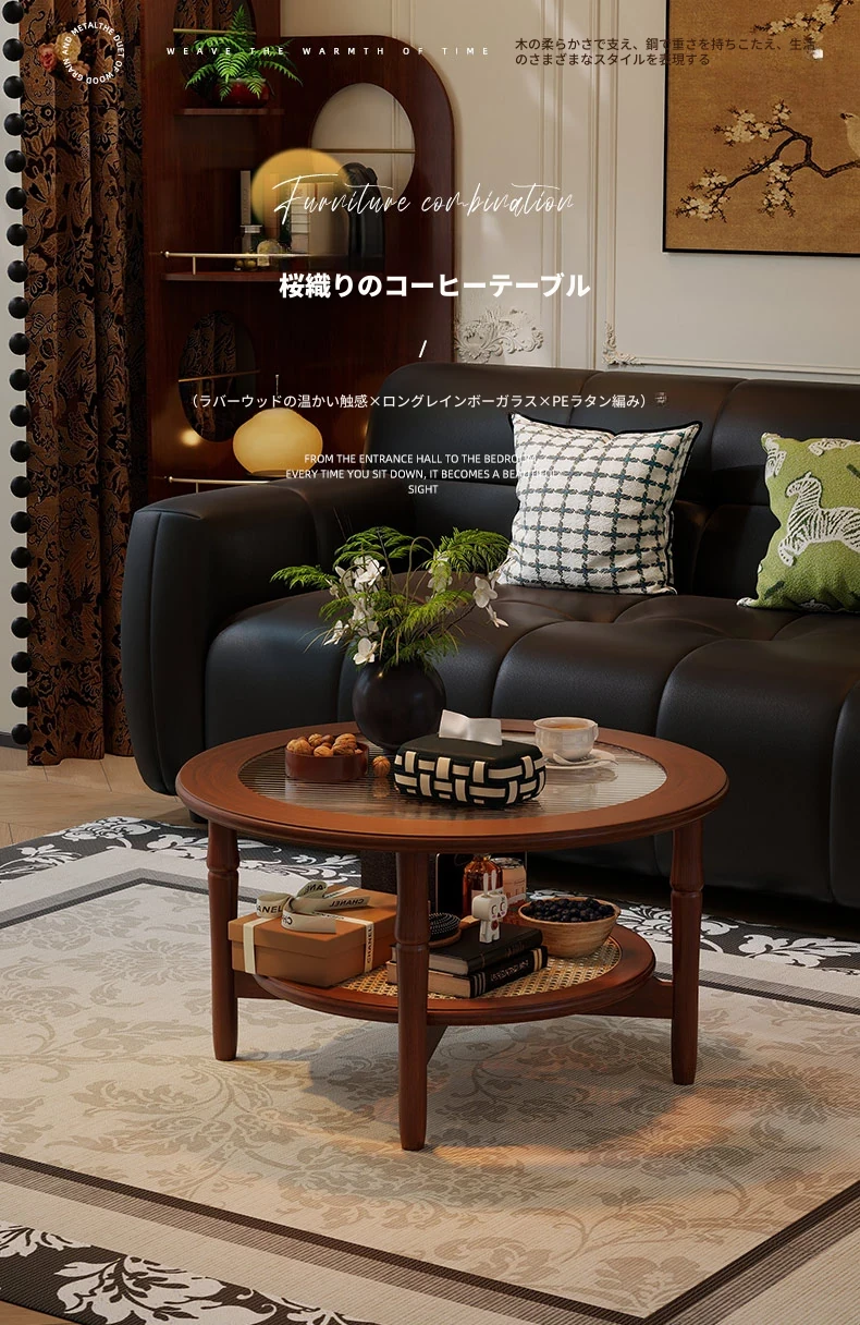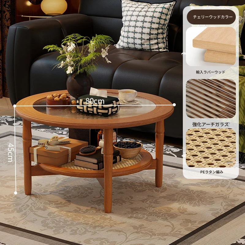 フランス風レトロ実木製ラウンドコーヒーテーブル - 中古のリビングルームにぴったり!ガラス2段式のティーテーブル、小さなスペースにも最適な籐製のコンパクトデザイン。おしゃれな空間を演出します!