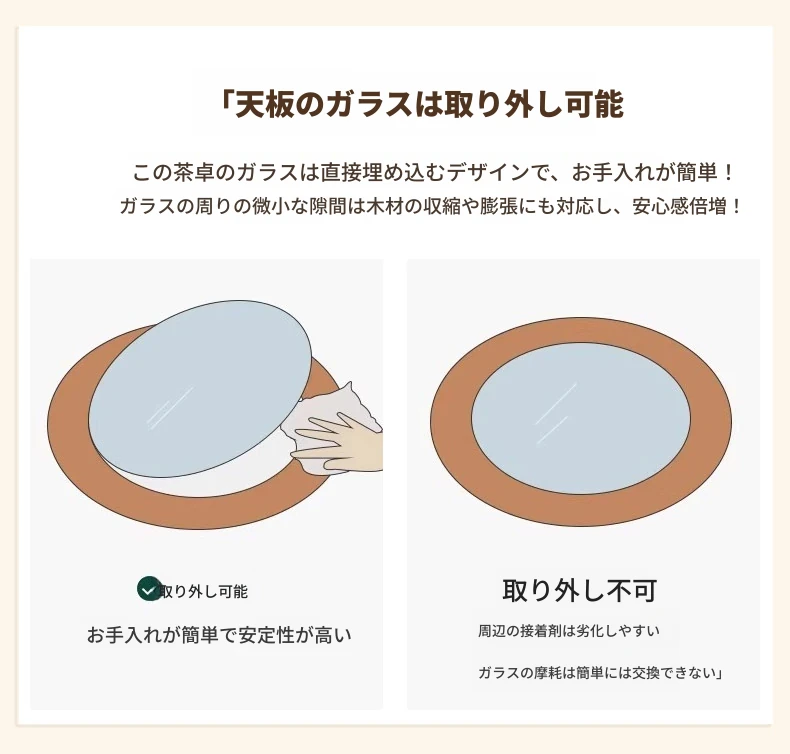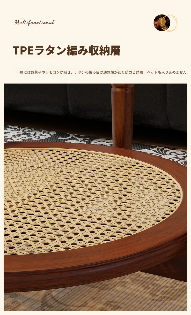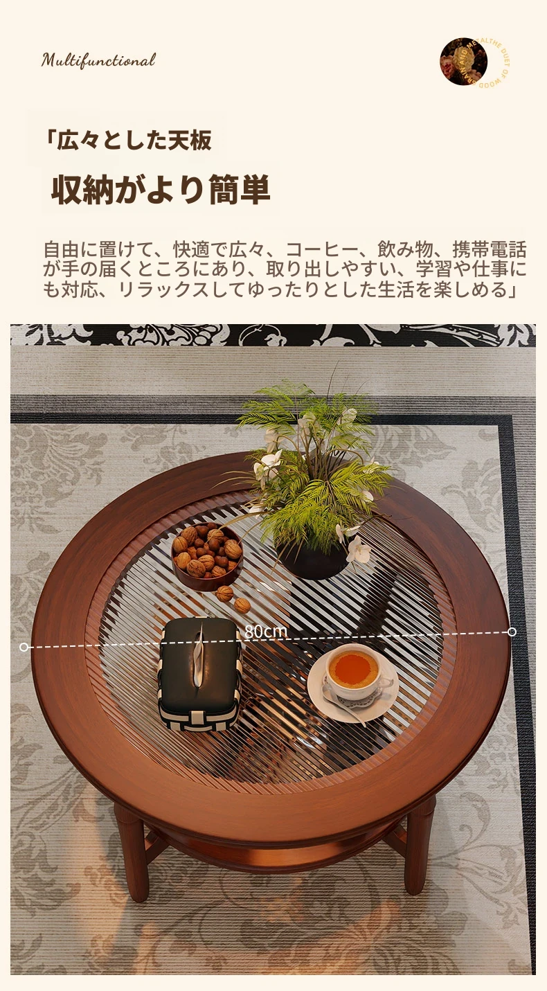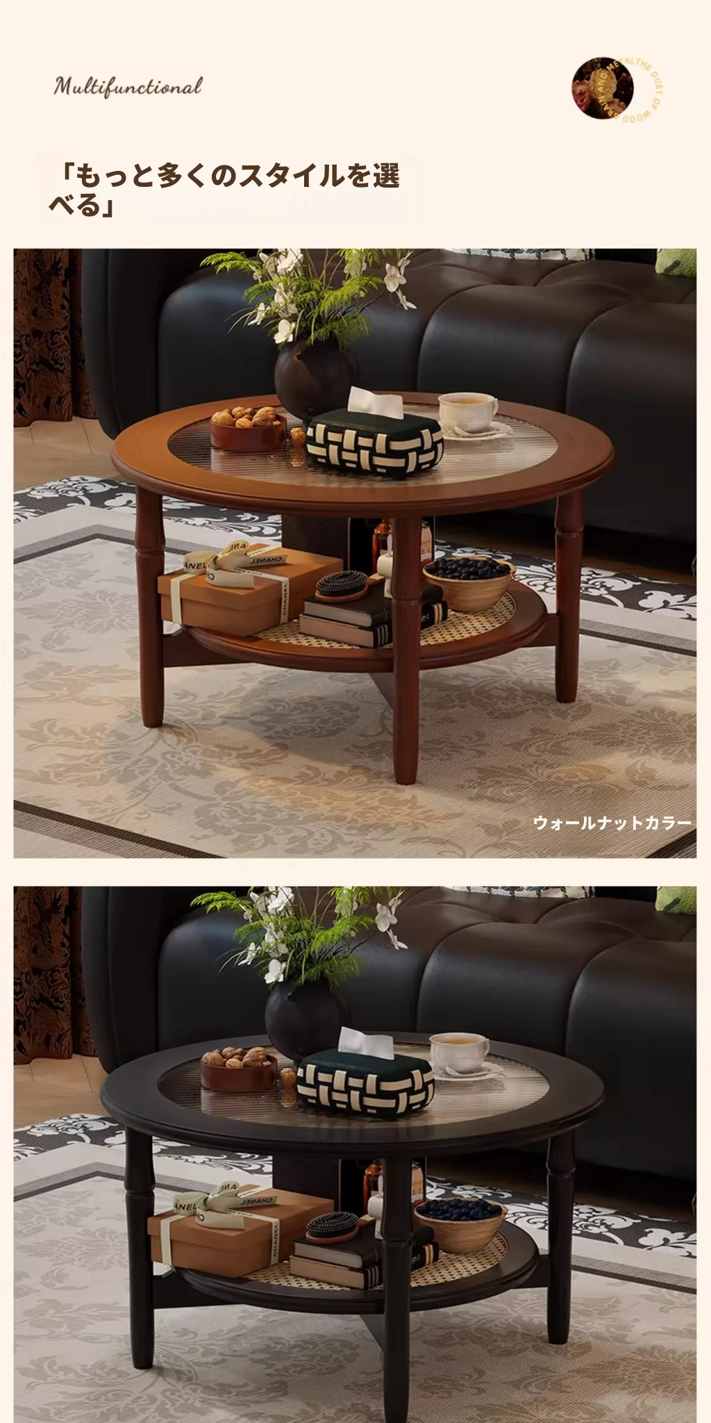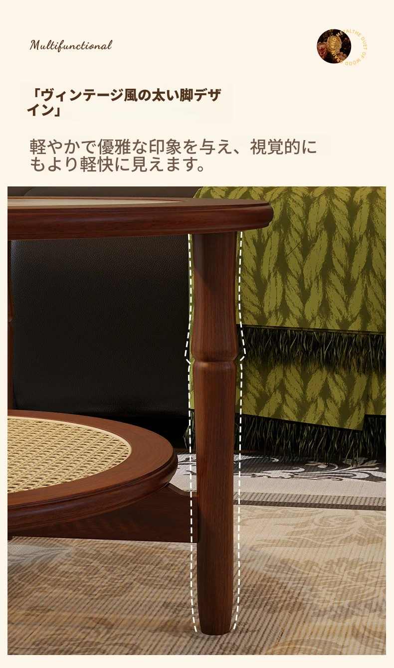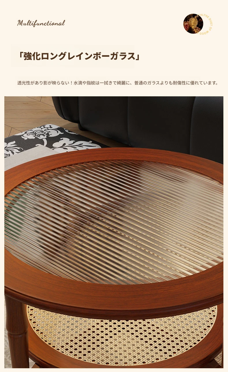 フランス風レトロ実木製ラウンドコーヒーテーブル - 中古のリビングルームにぴったり!ガラス2段式のティーテーブル、小さなスペースにも最適な籐製のコンパクトデザイン。おしゃれな空間を演出します!