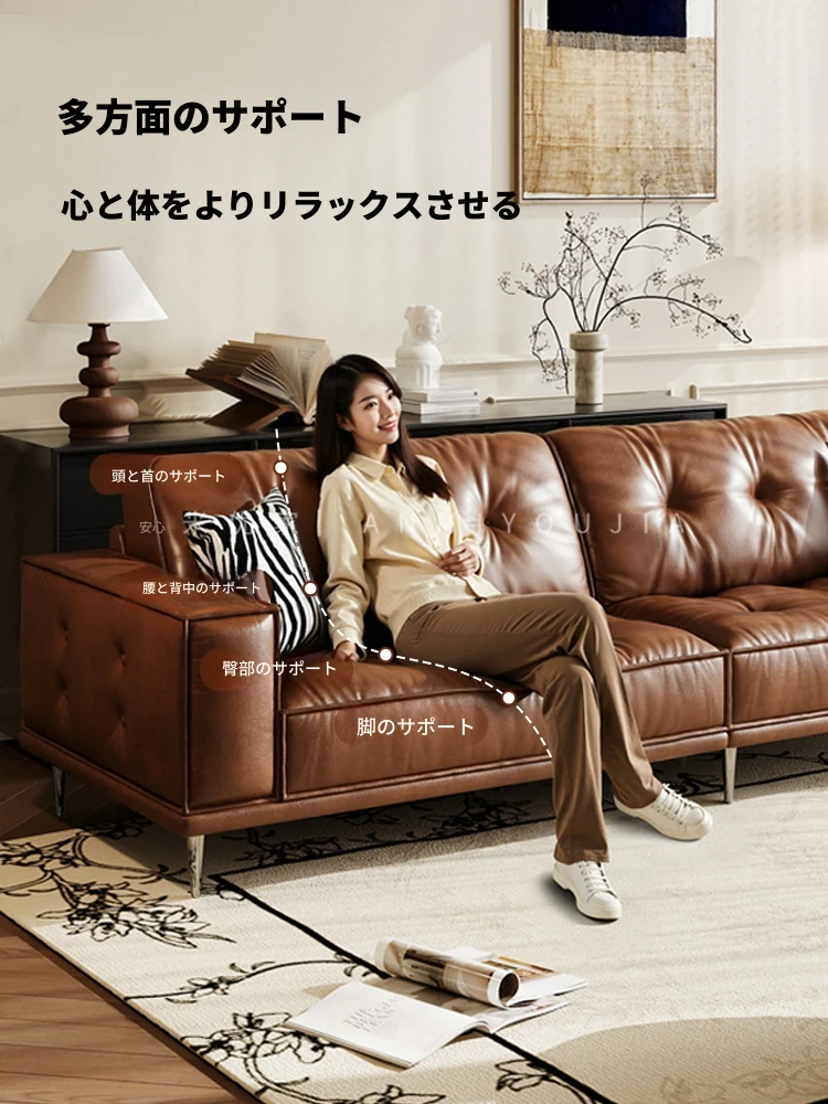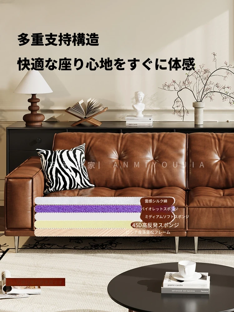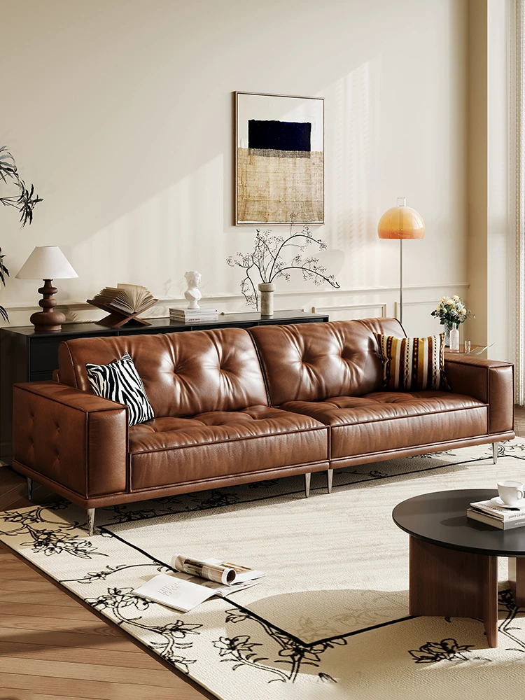 フレンチレトロオイルワックスレザー豆腐ブロックソファ - 小型リビングに最適、イタリアンストレートデザインのヴィンテージ本革ハイバックソファ。スタイリッシュな空間を演出し、快適な座り心地を提供します!