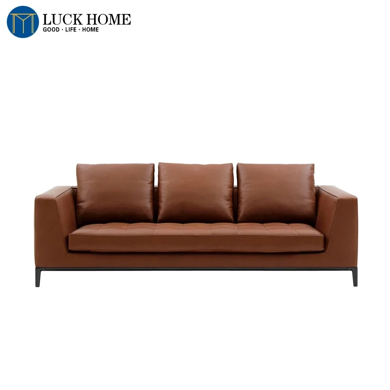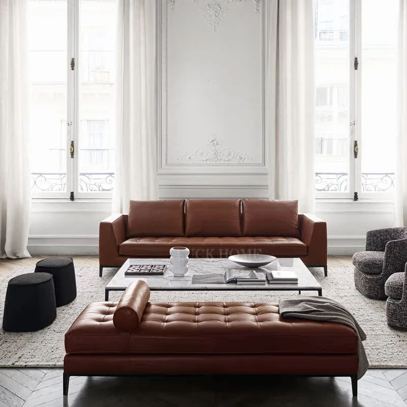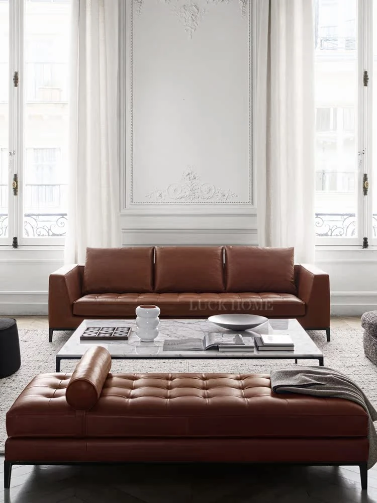 アメリカンスタイル本革スナップ付きブラウン3人掛けソファ|ラグジュアリーな別荘のリビングに最適!高級トップグレイン牛革使用、デザイナー油蜡皮仕上げで、洗練された空間を演出します。