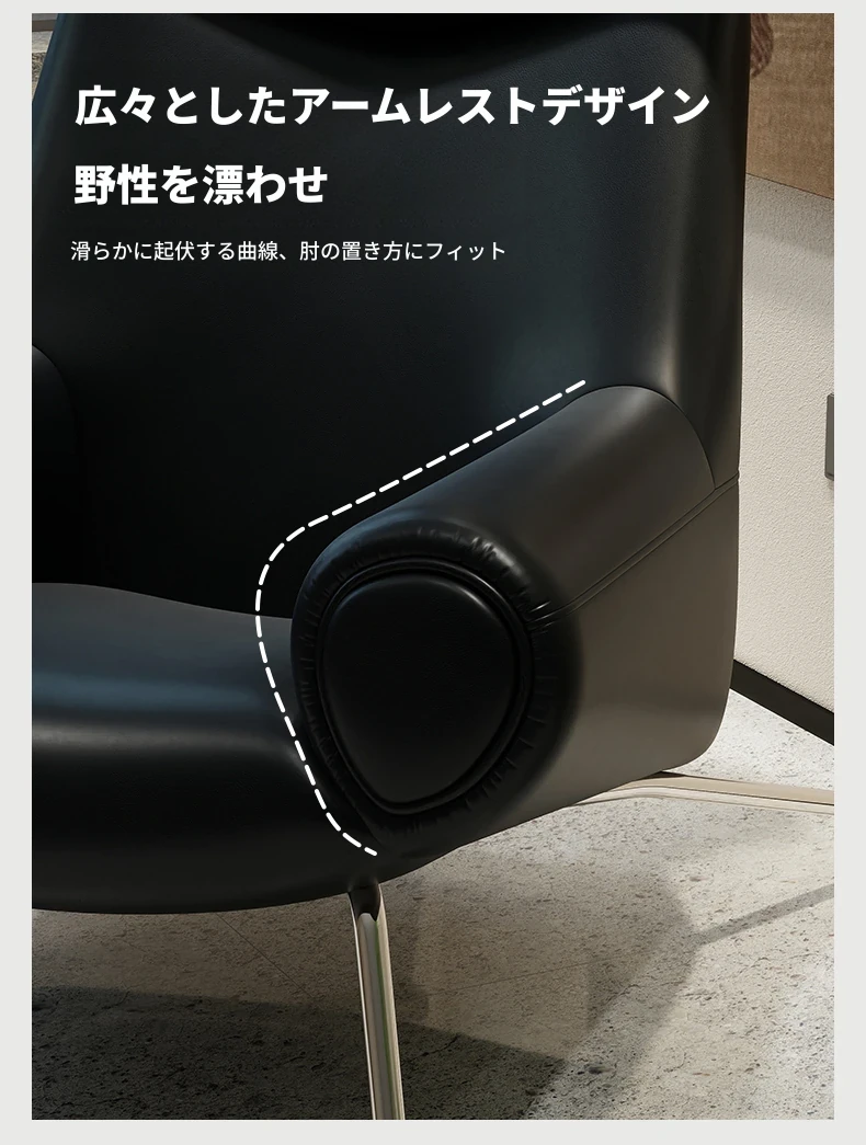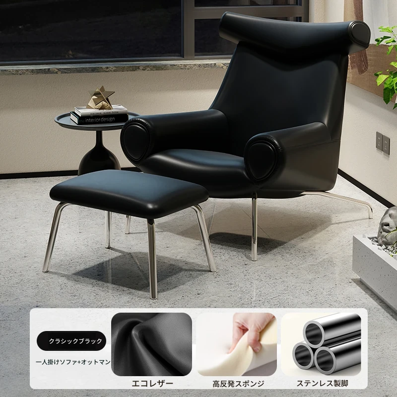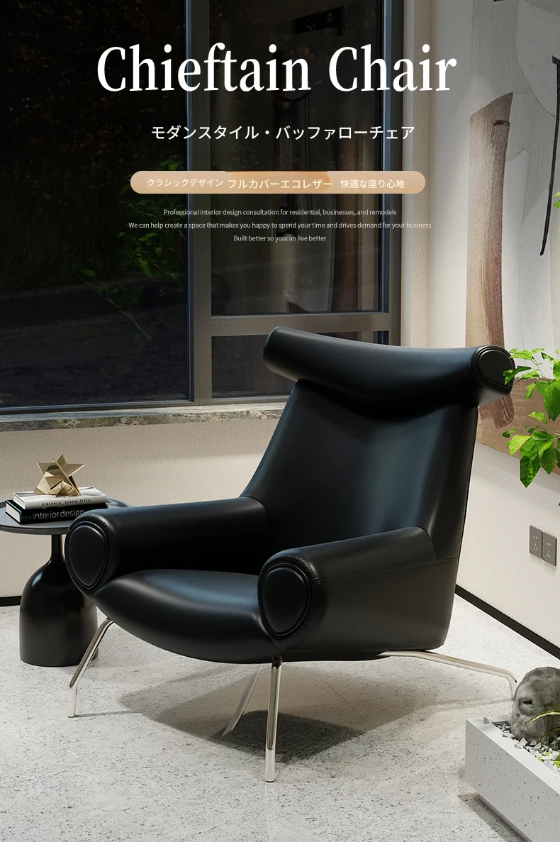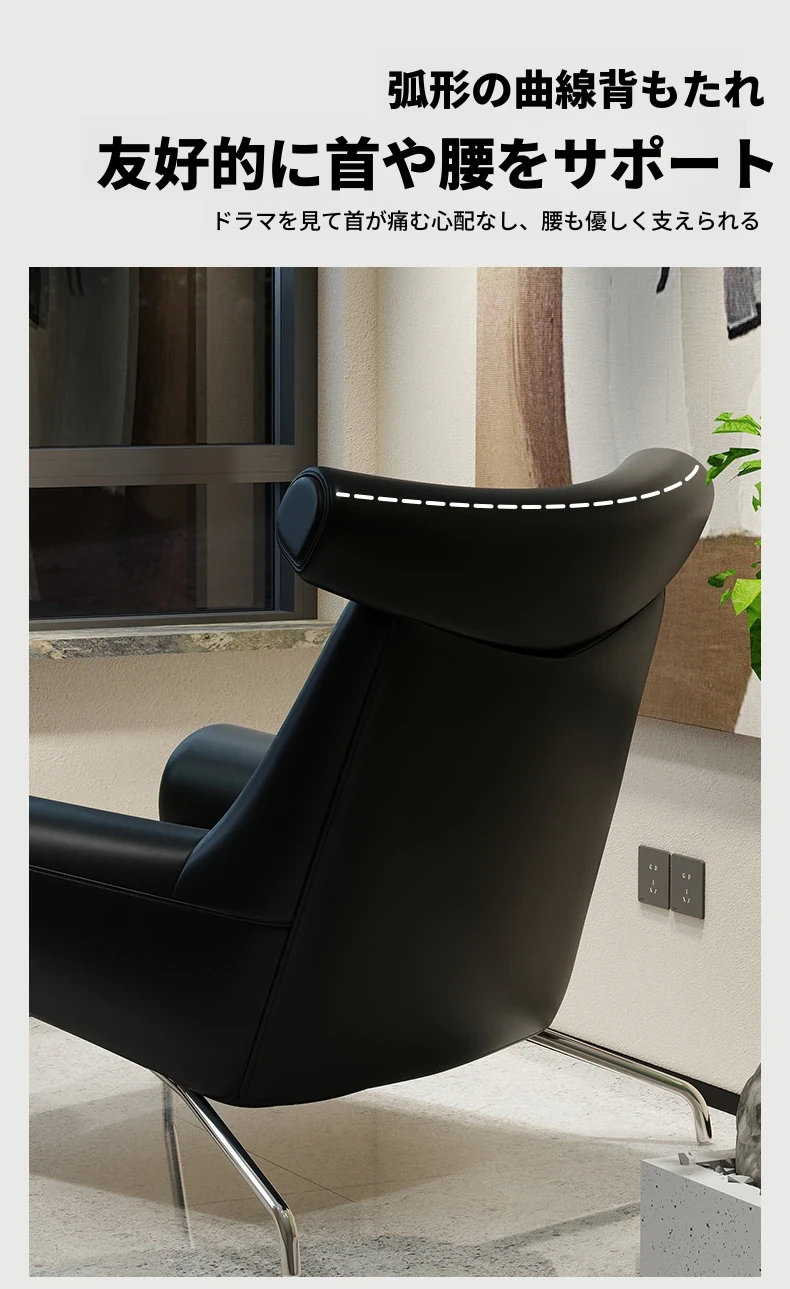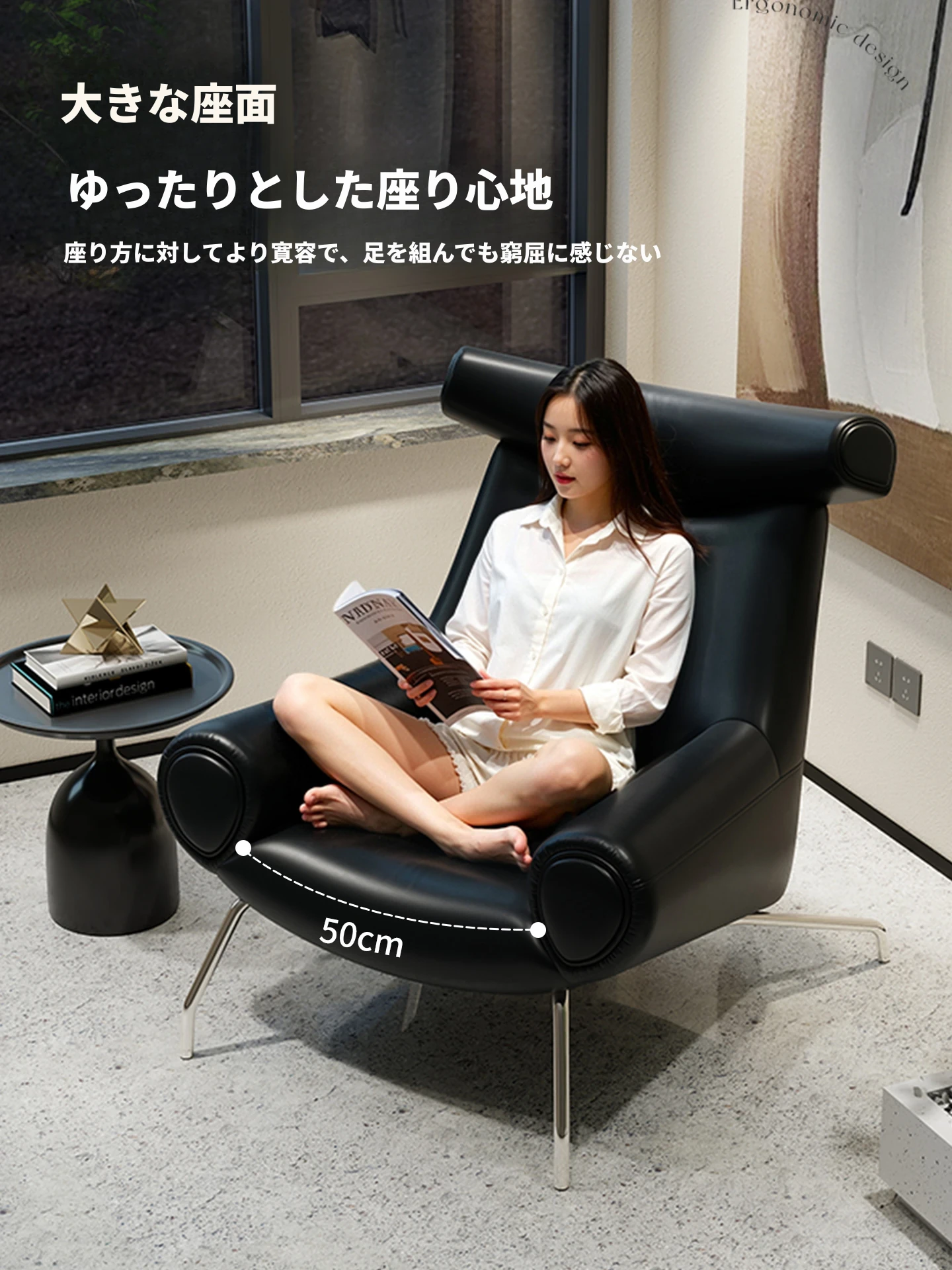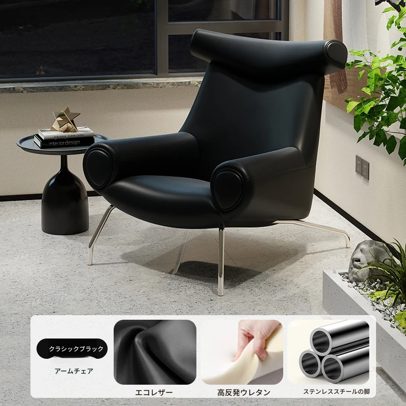 現代的ミニマリストデザイン!ブラックレザーの一人掛けソファチェア。イタリアンスタイルのシンプルなホテル用リビングルームのリラックスチェア。牛革使用で高級感溢れる一品!