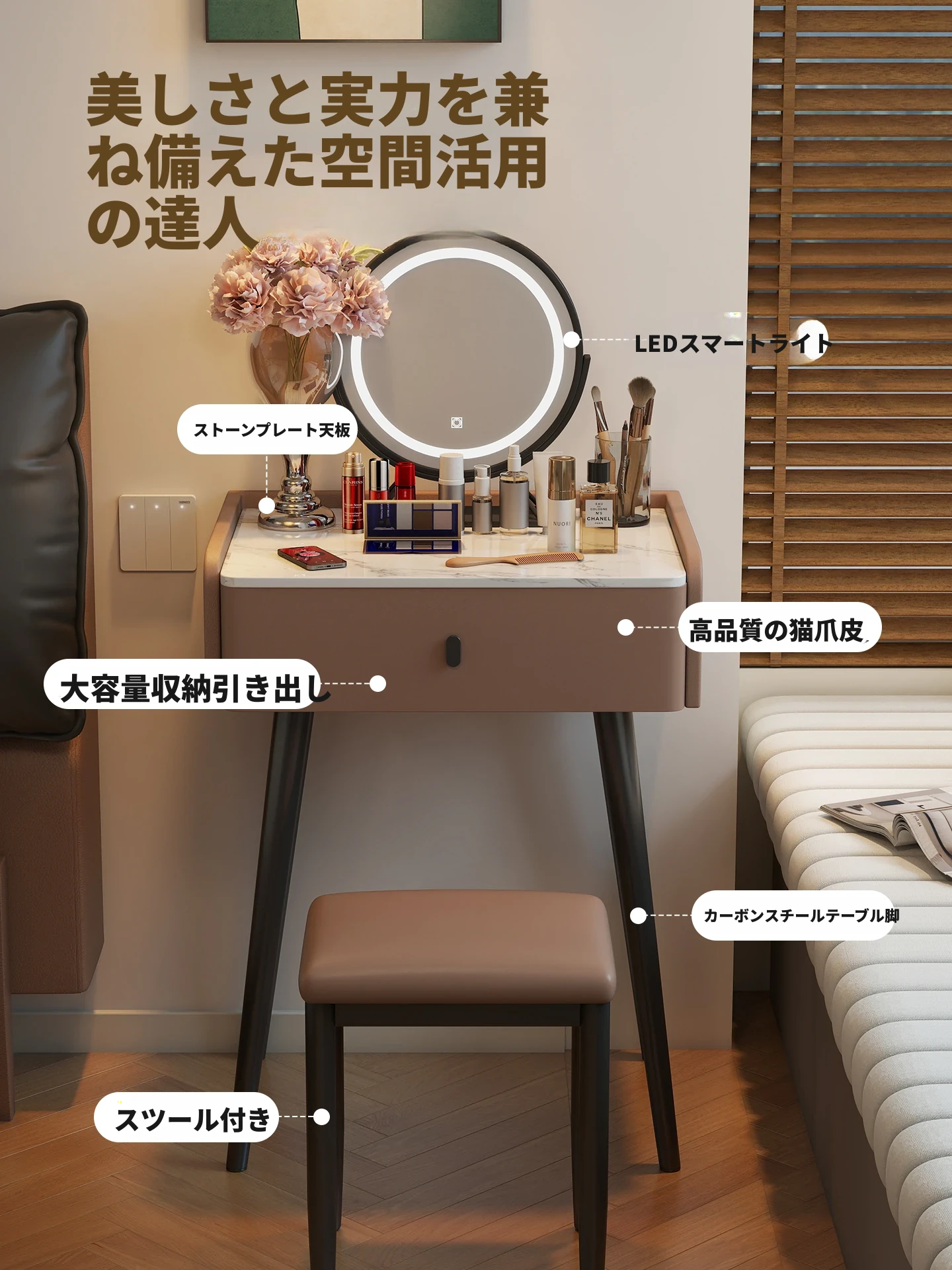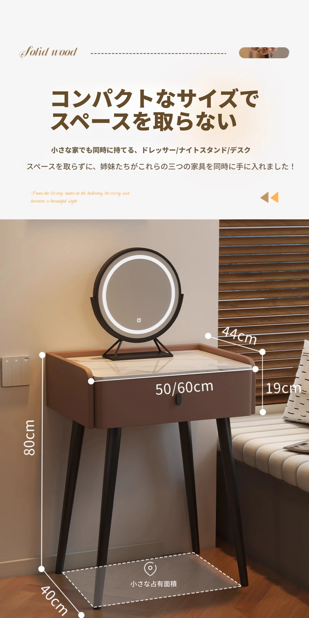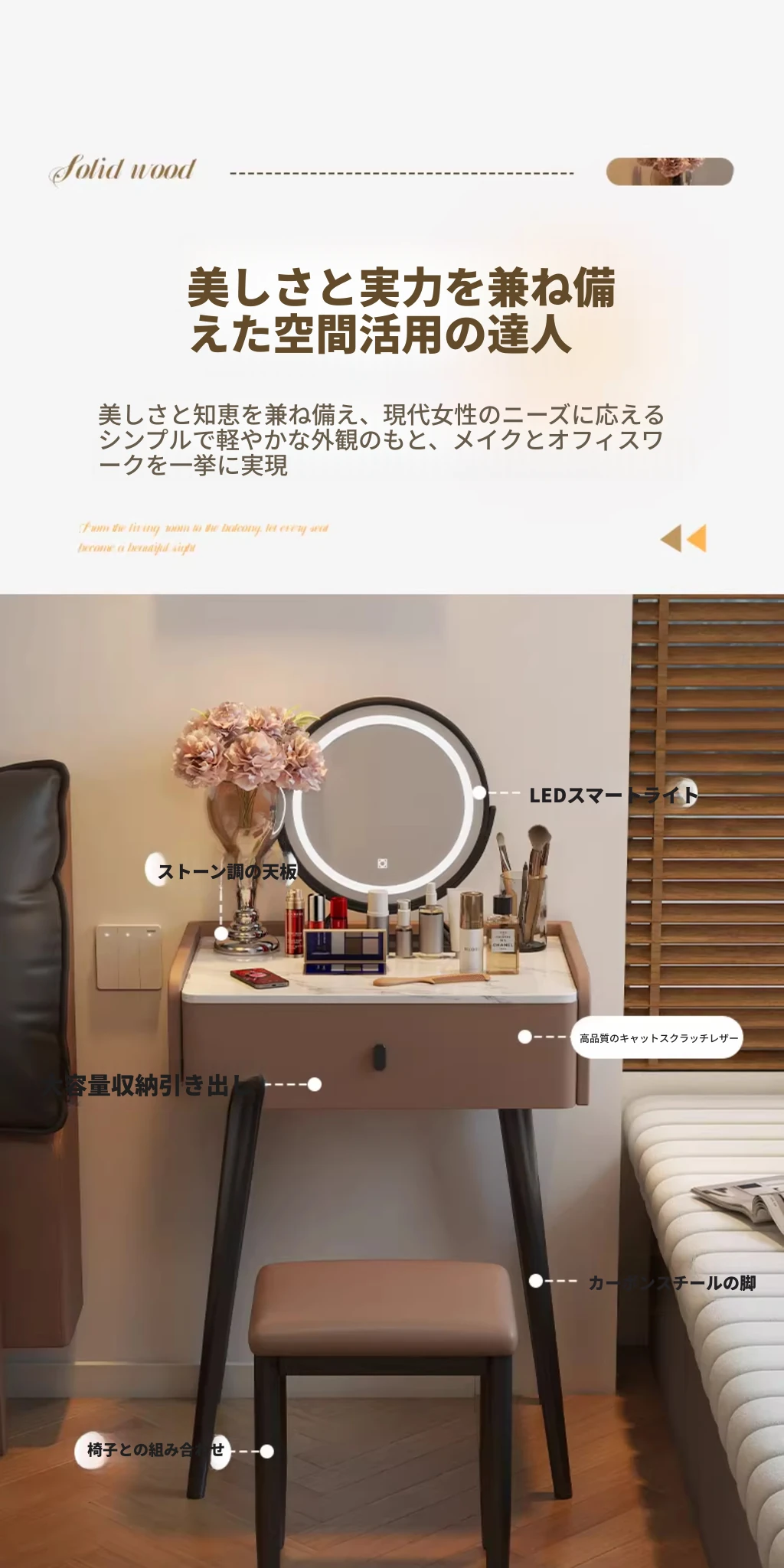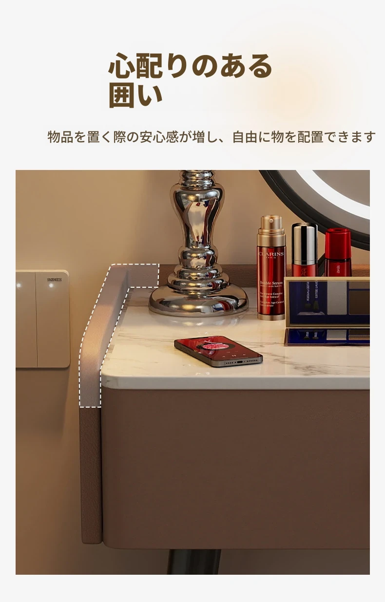 モダンでシンプルなデザインの小型化粧台、2025年新作!高級感あふれるレザー仕上げと実木製の構造で、寝室にぴったりのスタイリッシュな鏡付きドレッサー。あなたの美しさを引き立てる完璧なアイテムです!