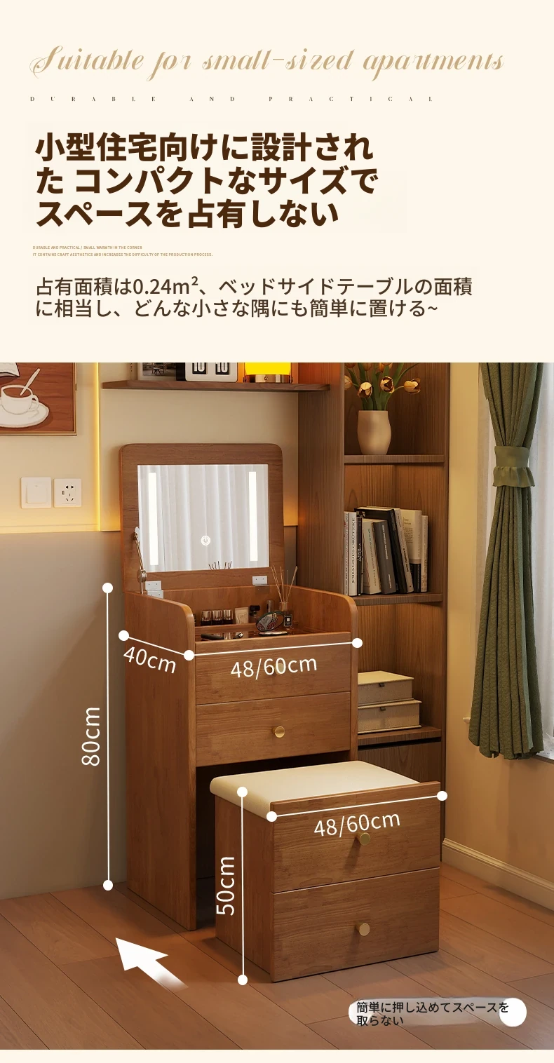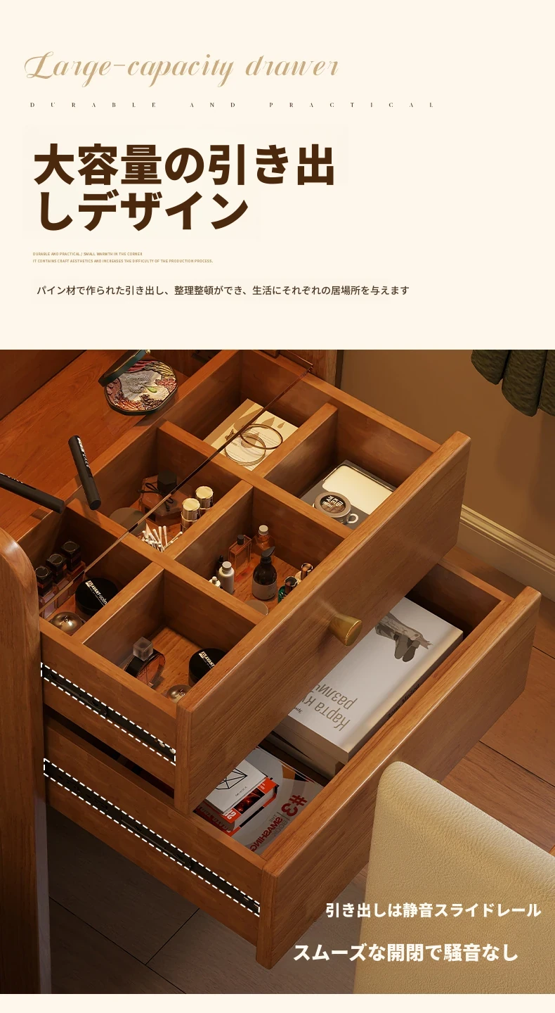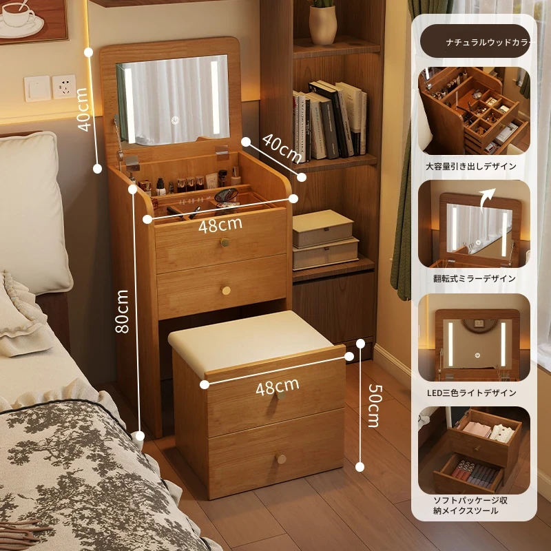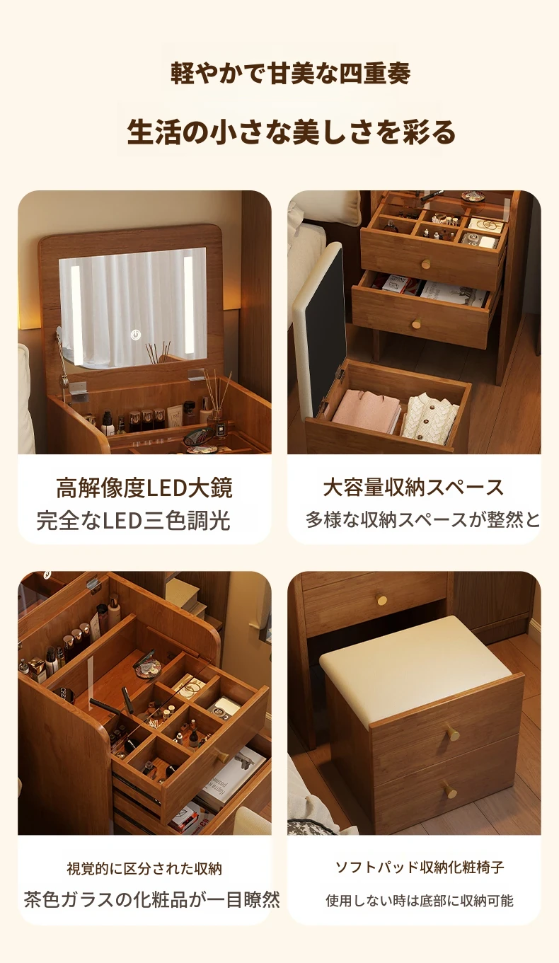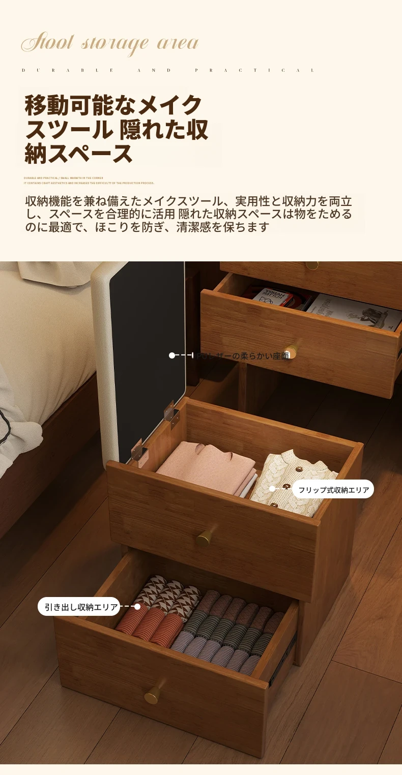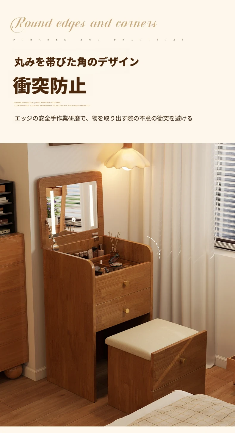 モダンでシンプルなデザインの実木製ドレッサー、コンパクトなサイズで小さな寝室にも最適!多機能収納キャビネットと椅子が一体化した使い勝手抜群の化粧台です。あなたの美を引き出すアイテム!