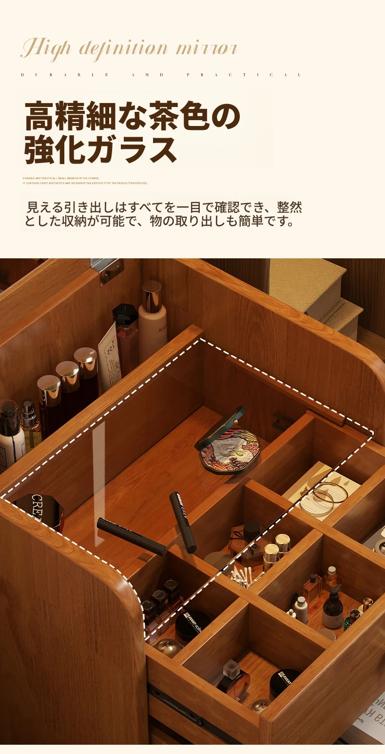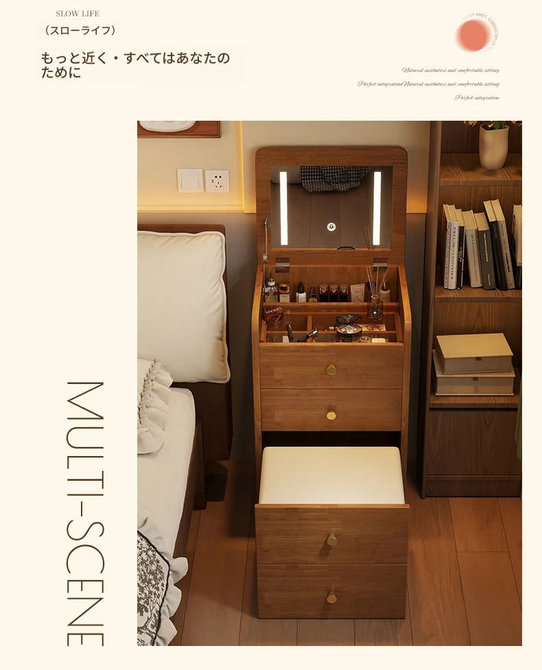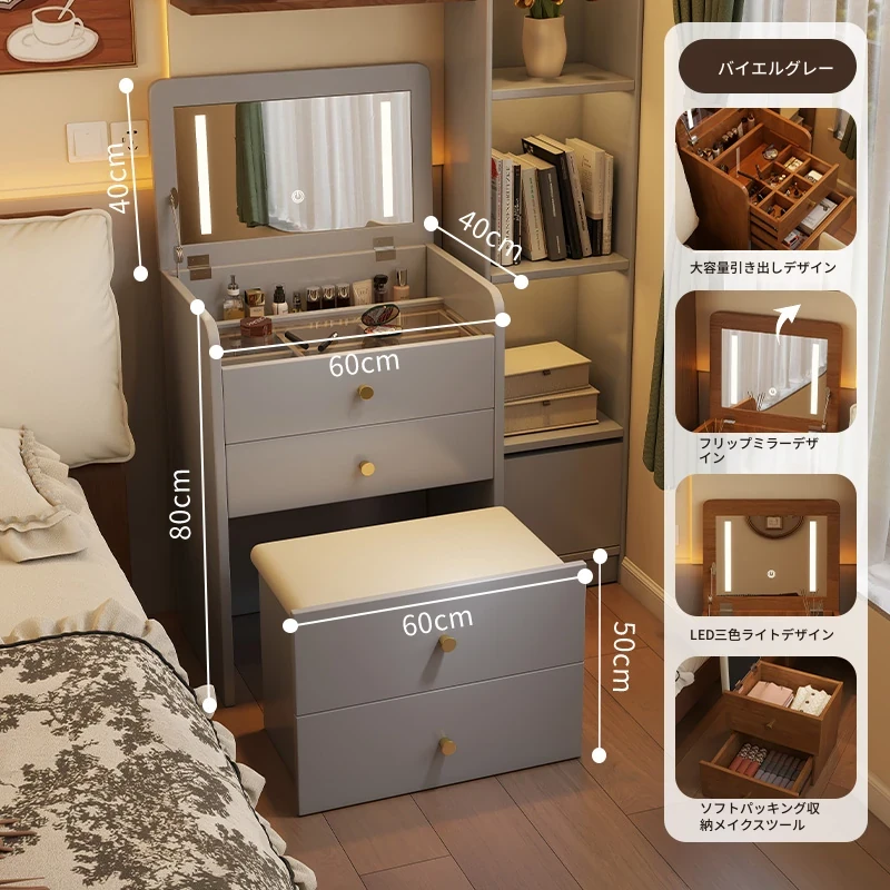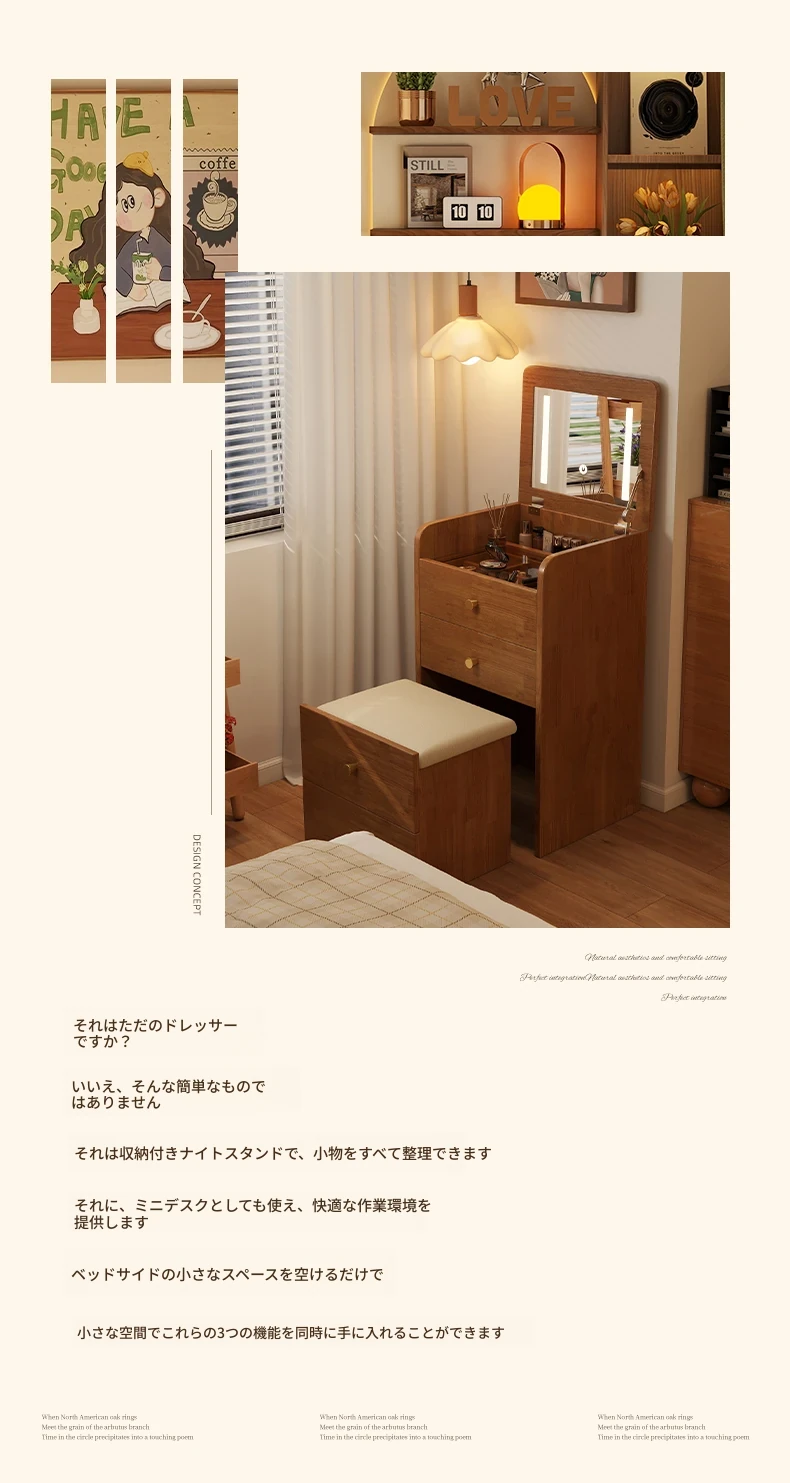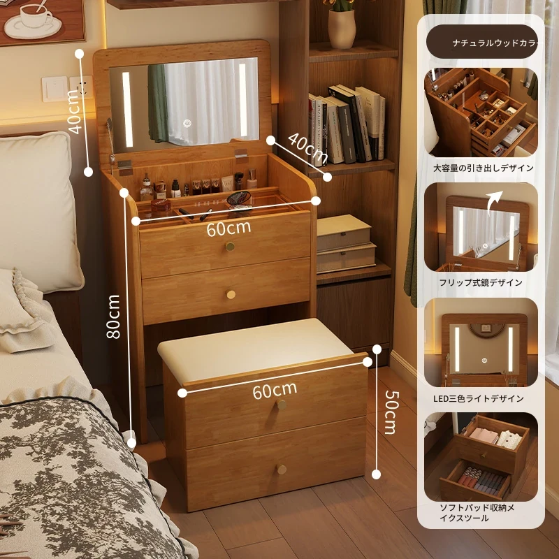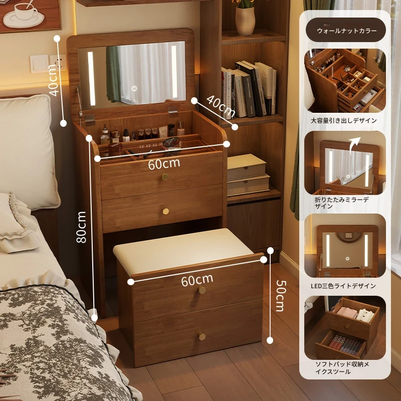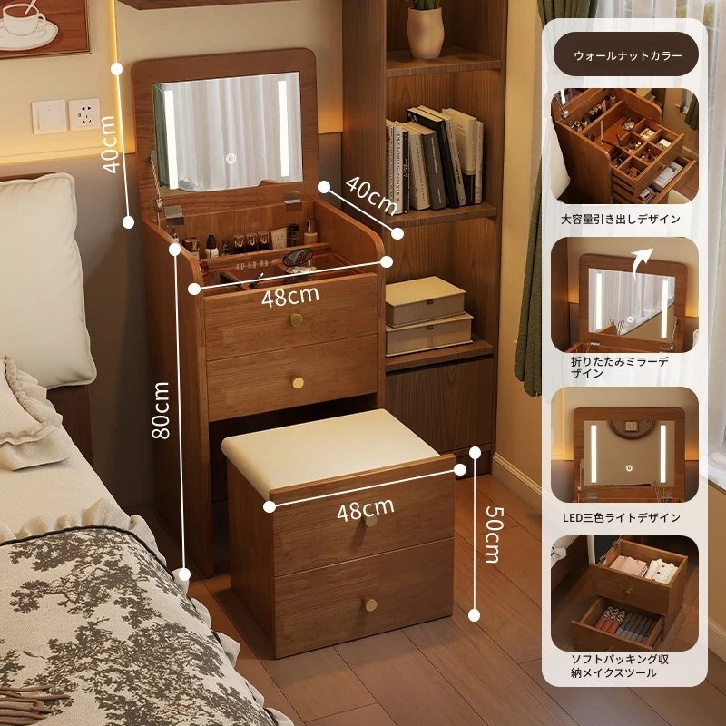 モダンでシンプルなデザインの実木製ドレッサー、コンパクトなサイズで小さな寝室にも最適!多機能収納キャビネットと椅子が一体化した使い勝手抜群の化粧台です。あなたの美を引き出すアイテム!