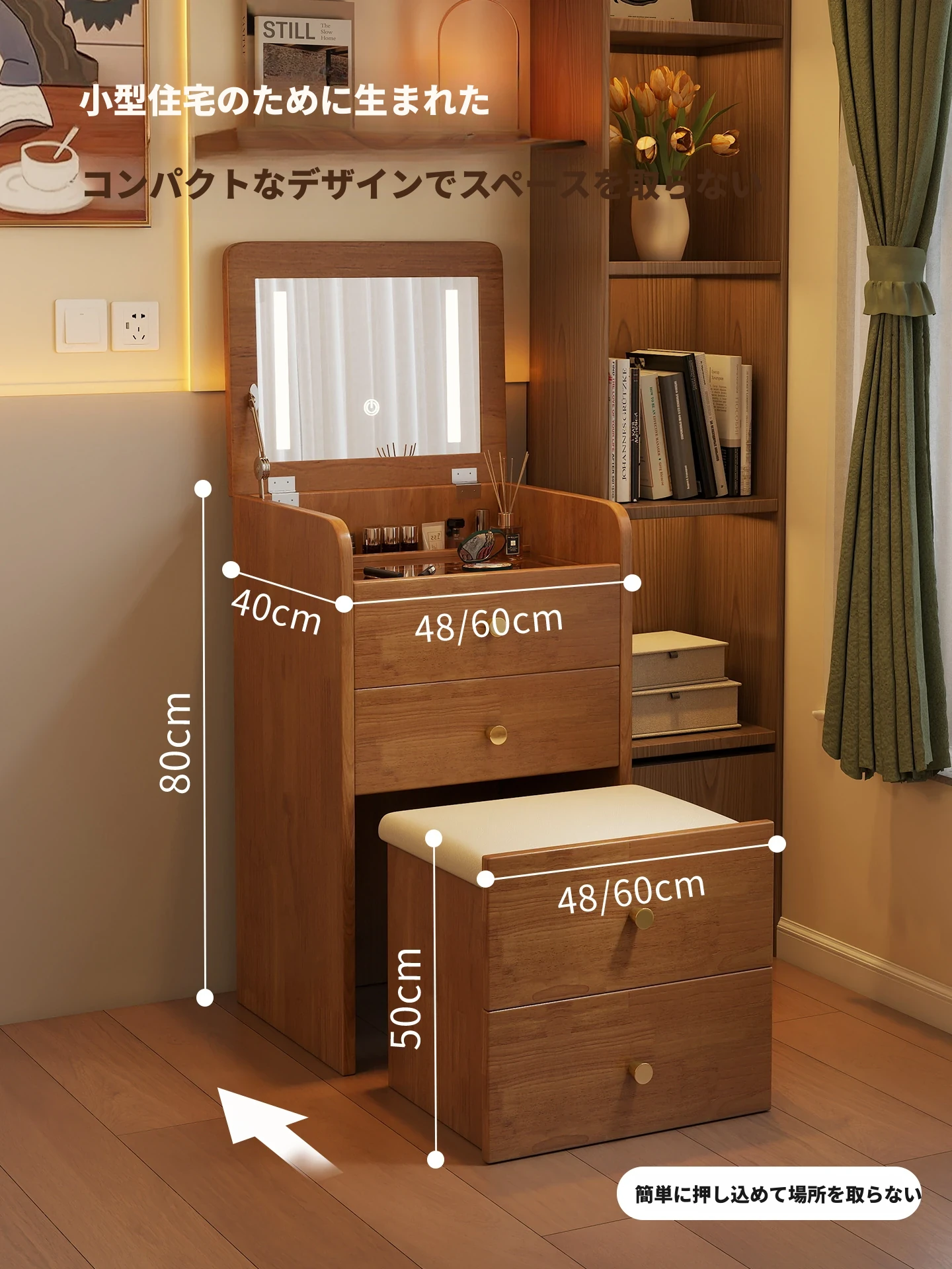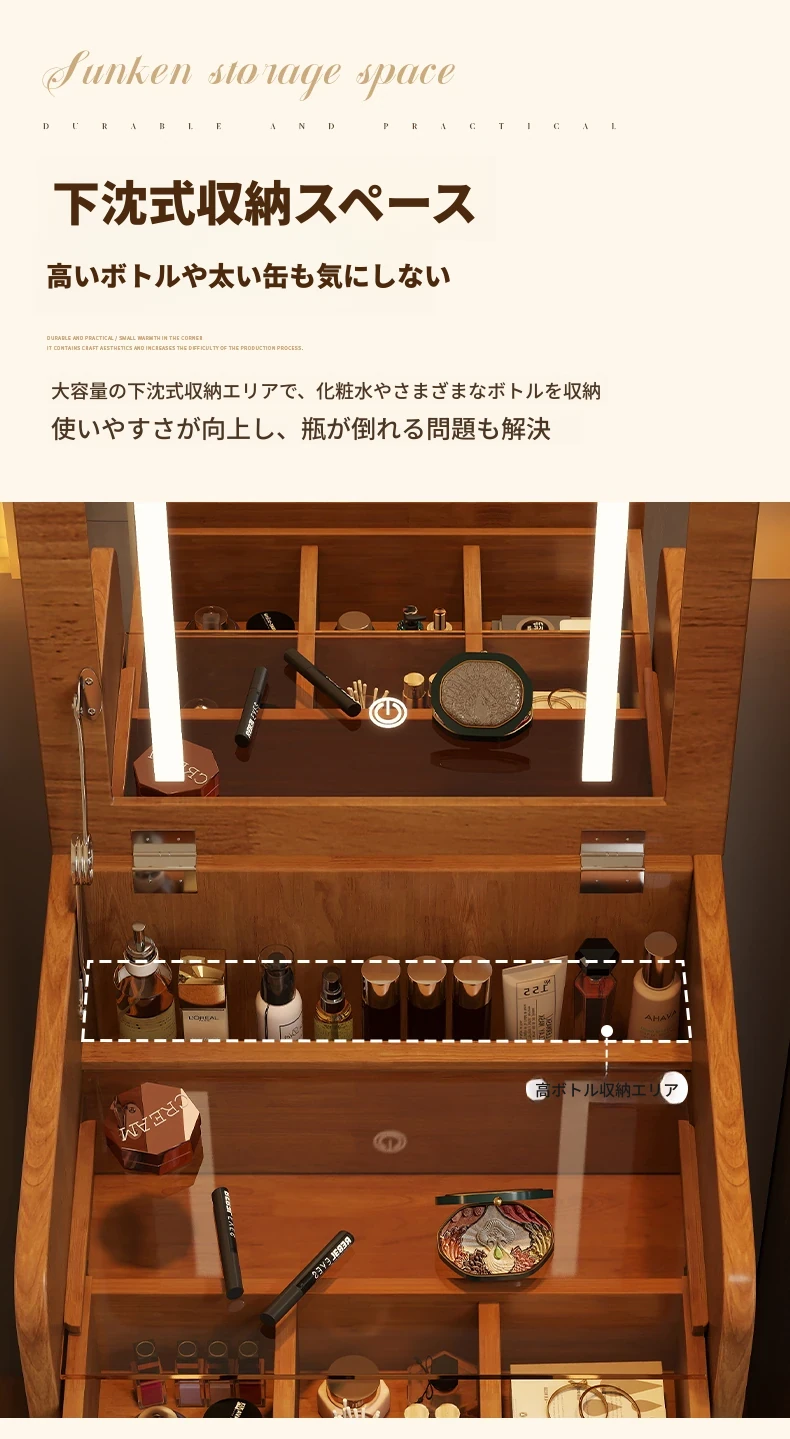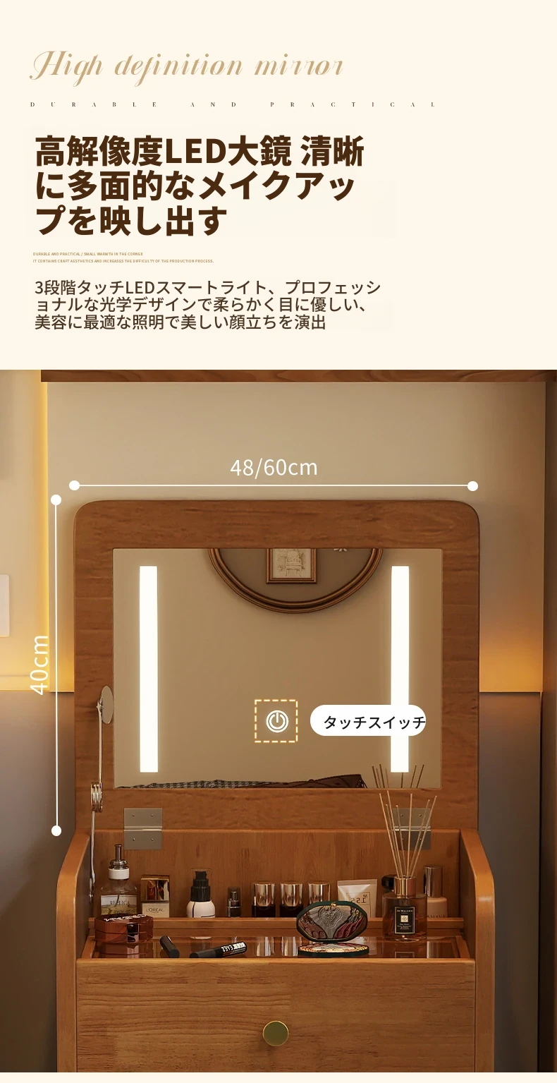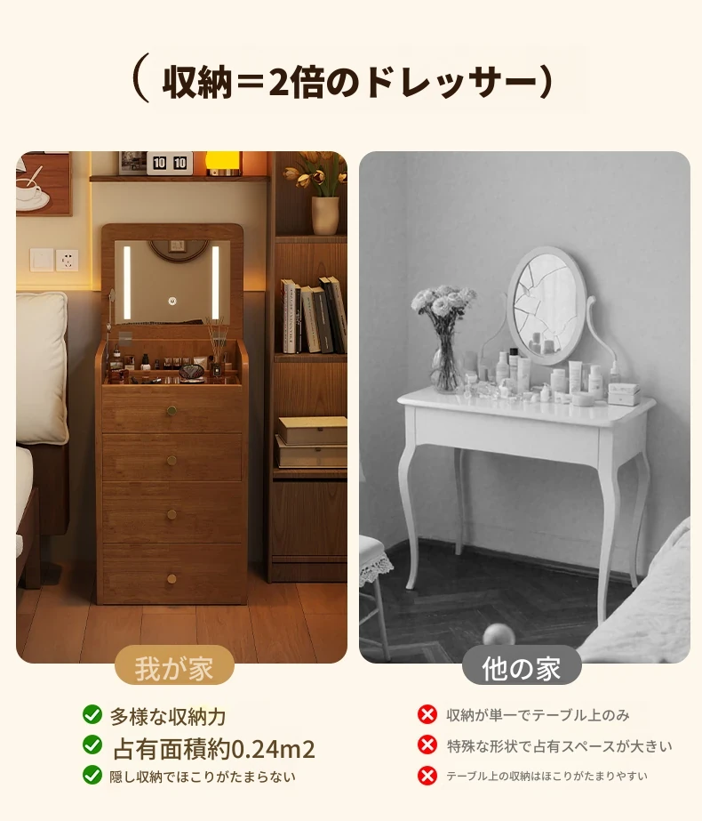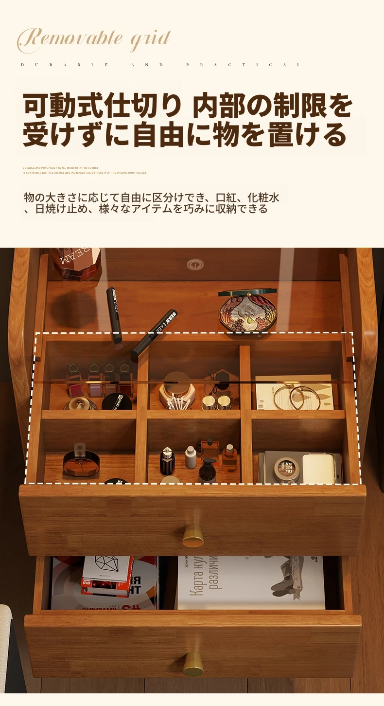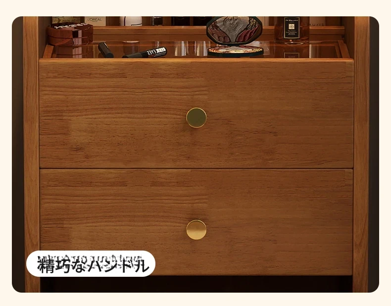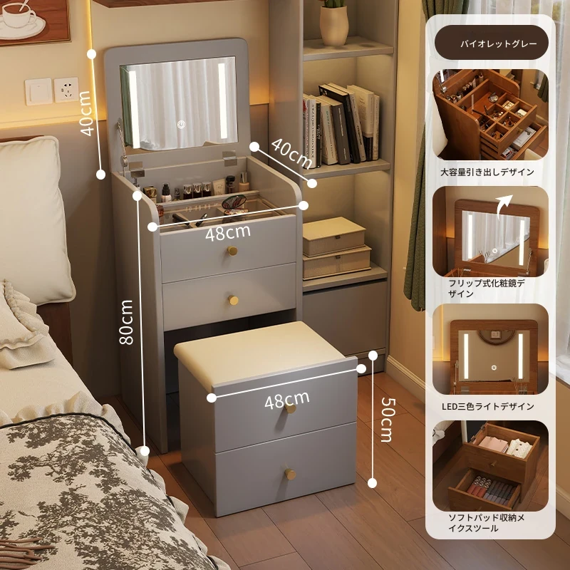 モダンでシンプルなデザインの実木製ドレッサー、コンパクトなサイズで小さな寝室にも最適!多機能収納キャビネットと椅子が一体化した使い勝手抜群の化粧台です。あなたの美を引き出すアイテム!