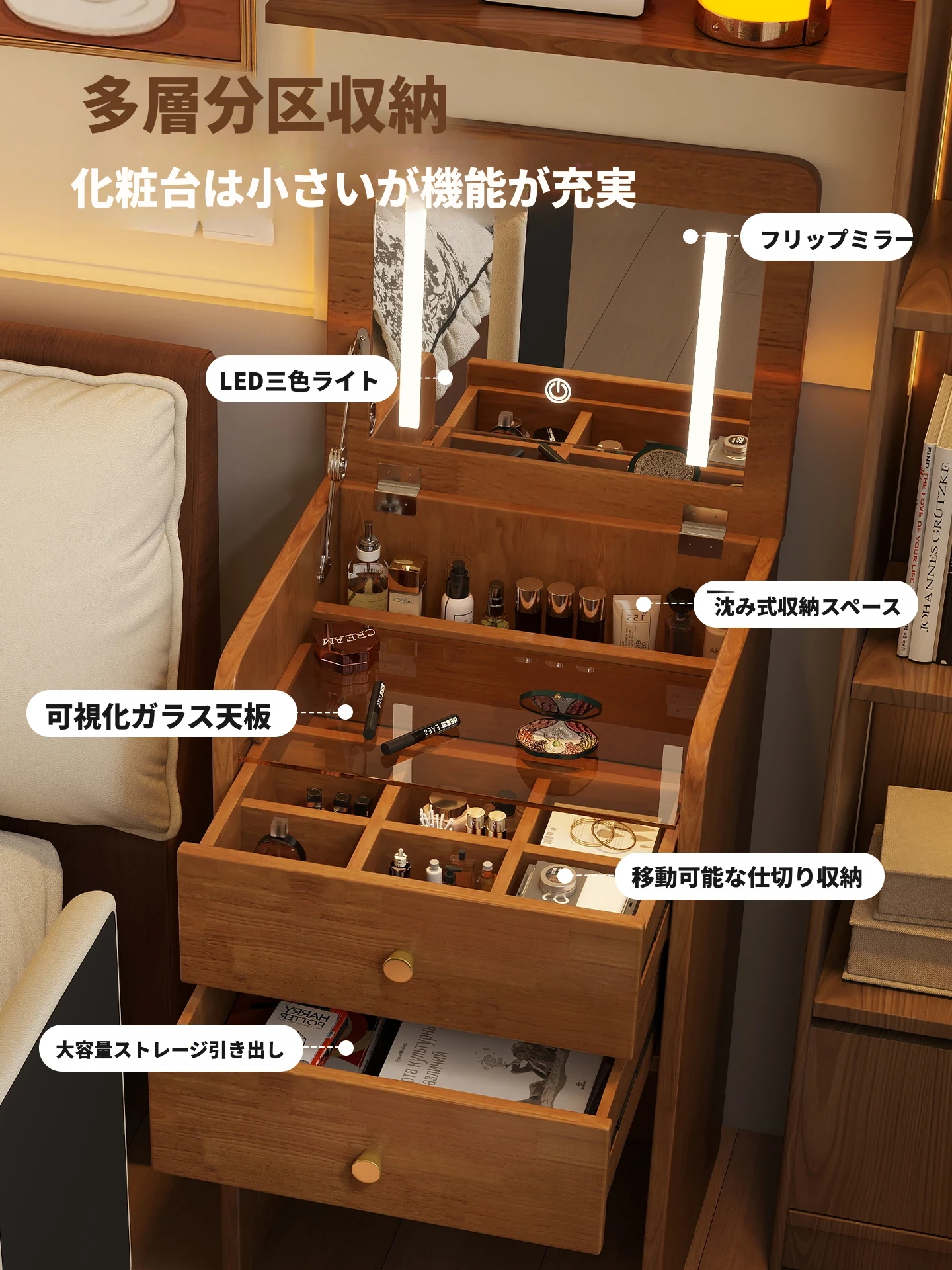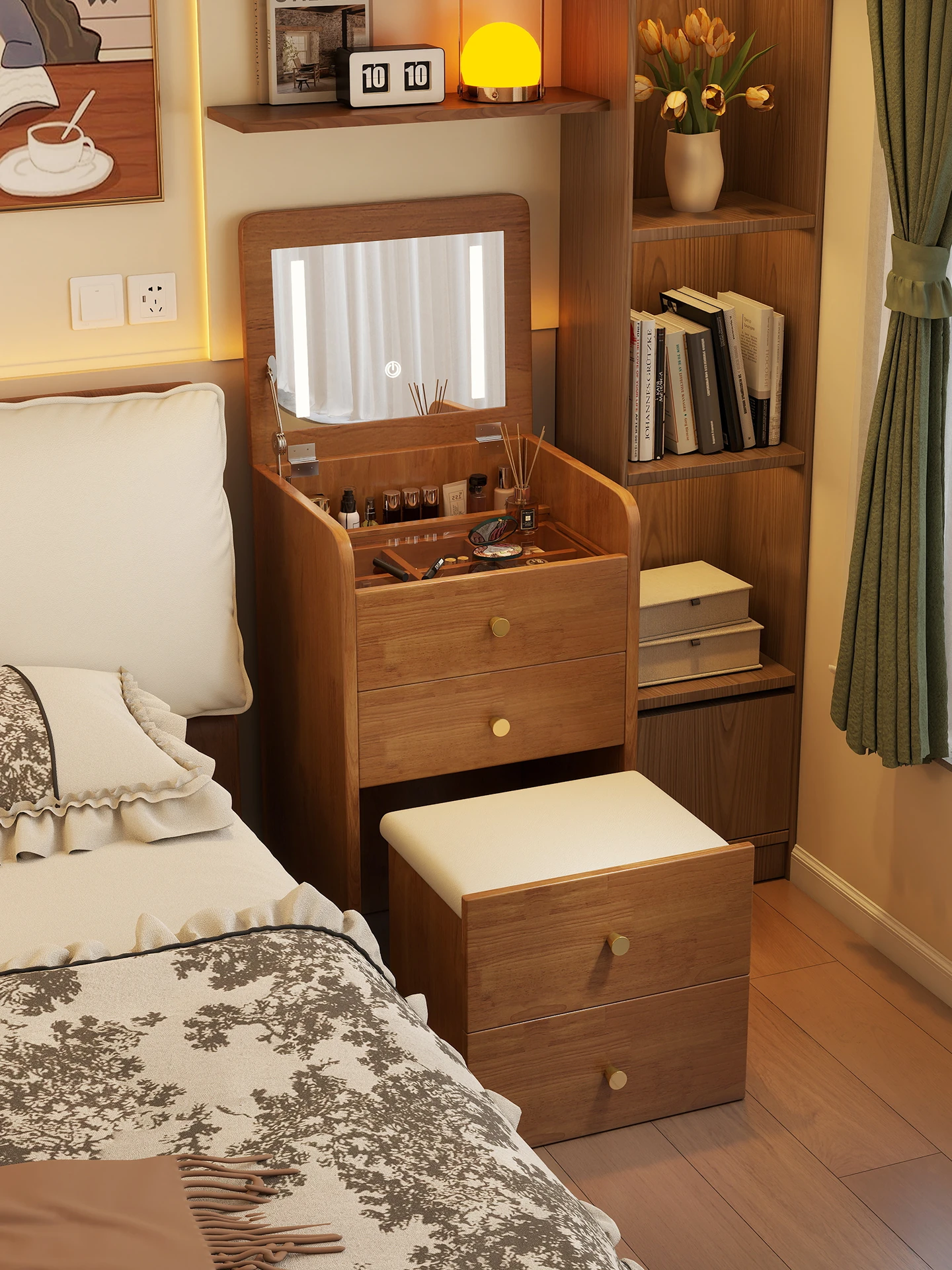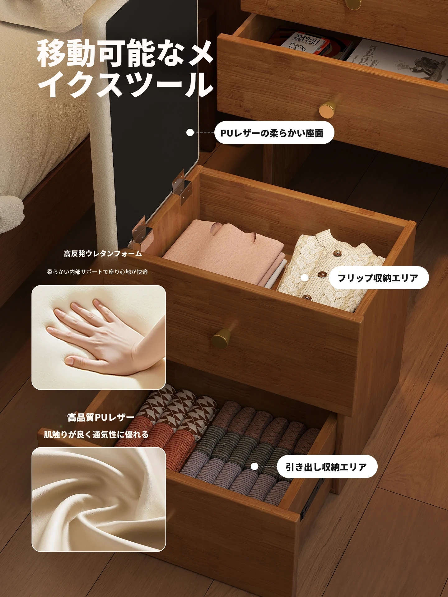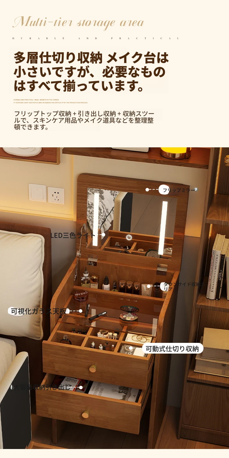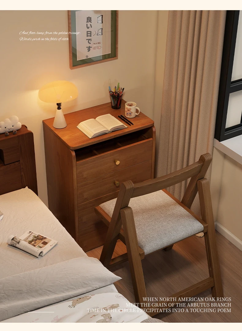 モダンでシンプルなデザインの実木製ドレッサー、コンパクトなサイズで小さな寝室にも最適!多機能収納キャビネットと椅子が一体化した使い勝手抜群の化粧台です。あなたの美を引き出すアイテム!