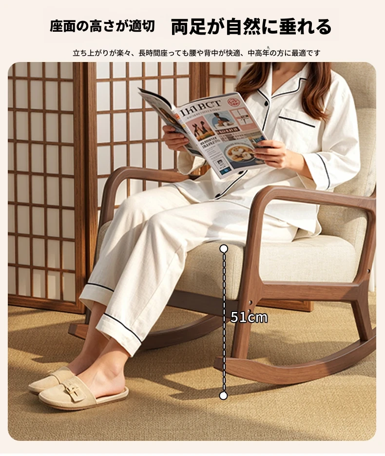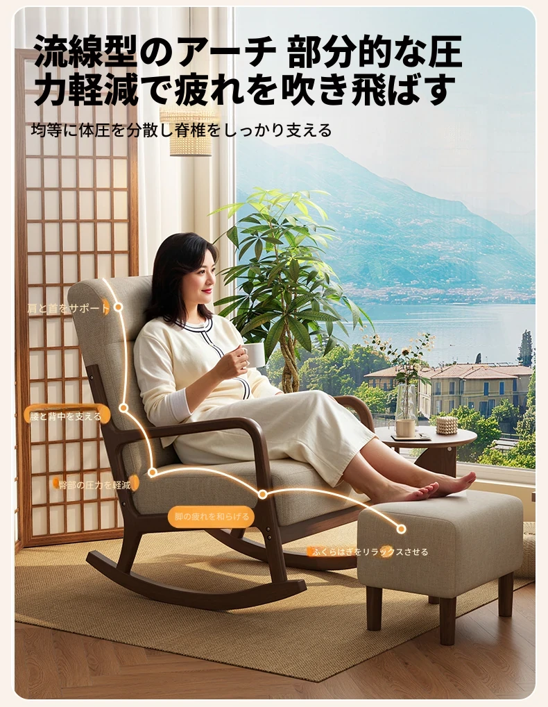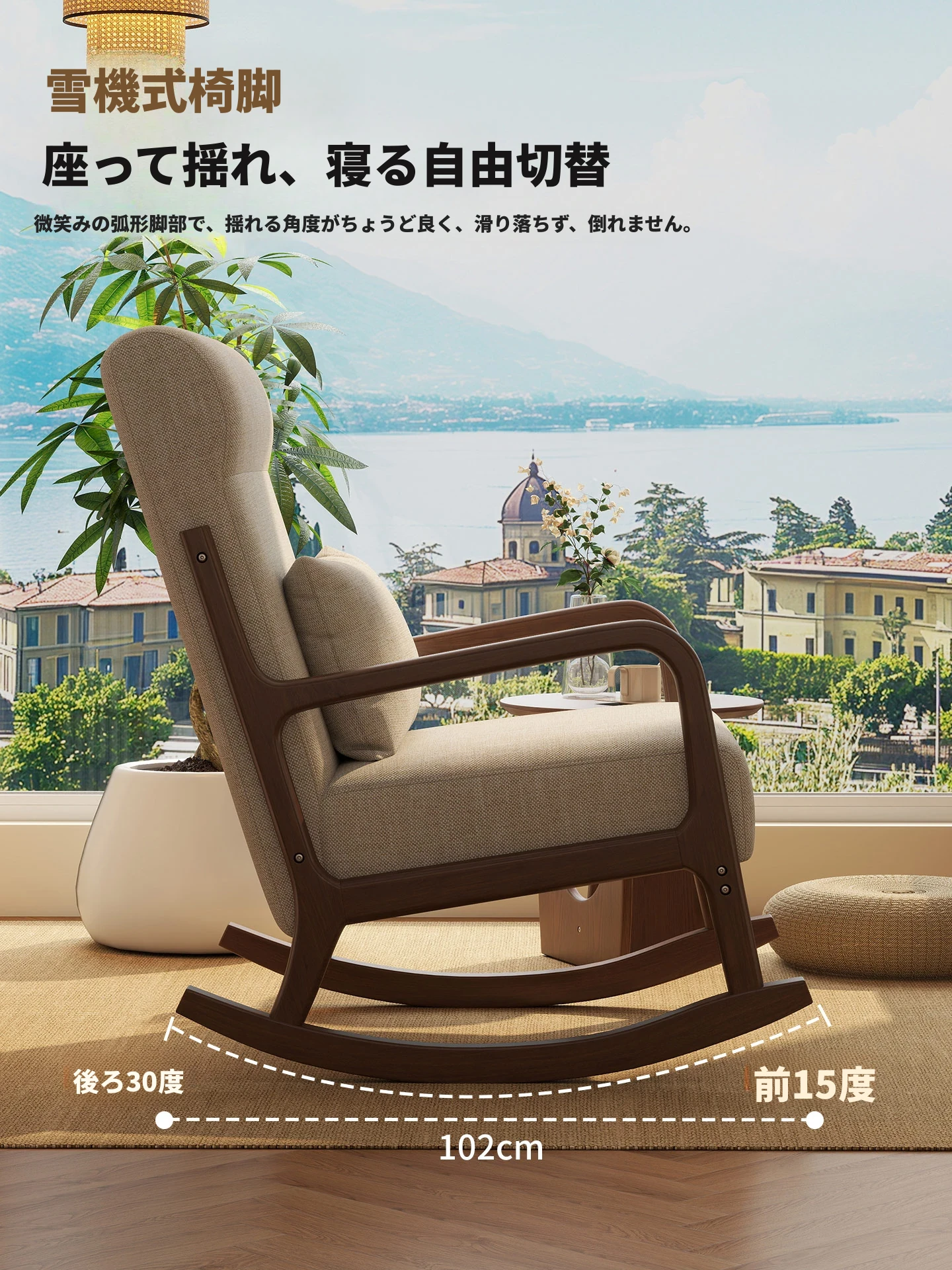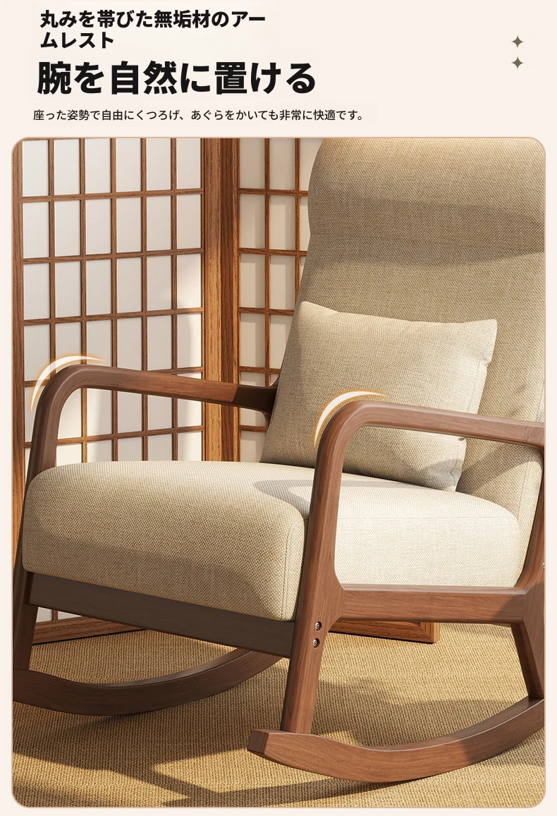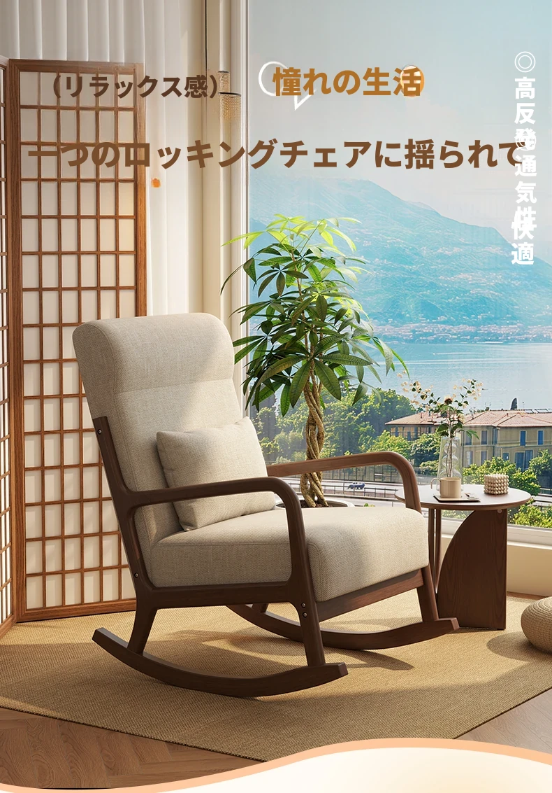 現代的シンプルなデザインの無垢材ロッキングチェア - リビングやバルコニーに最適な一人用ソファ。高齢者にも優しい快適な背もたれ付き、くつろぎのひとときをお楽しみください。