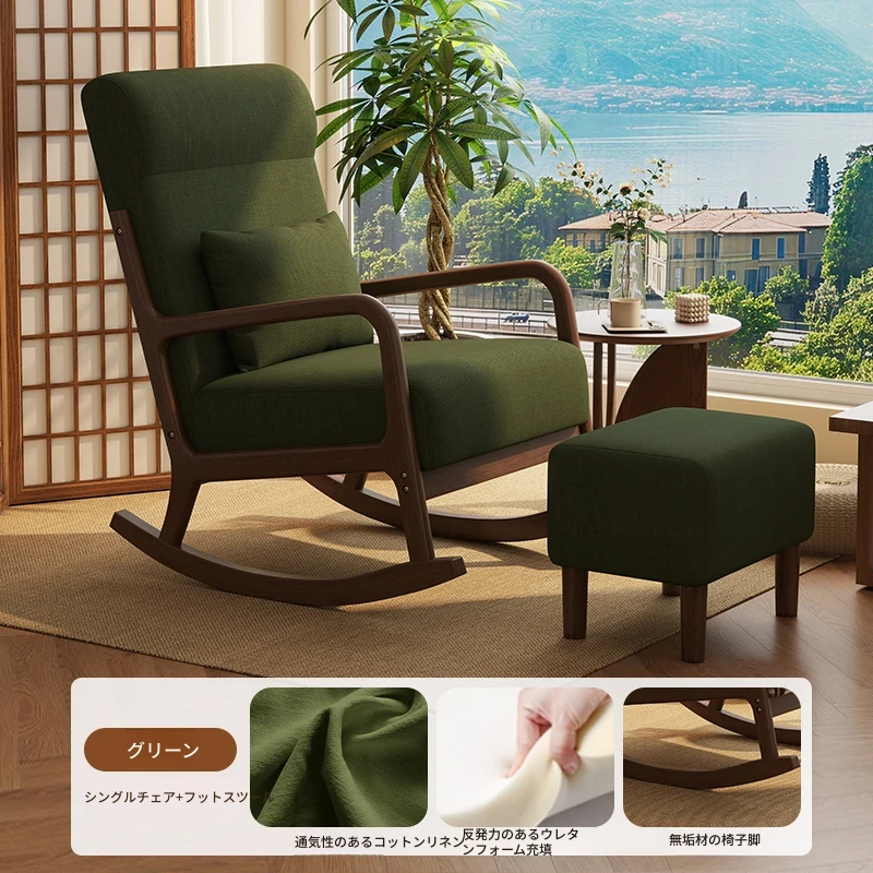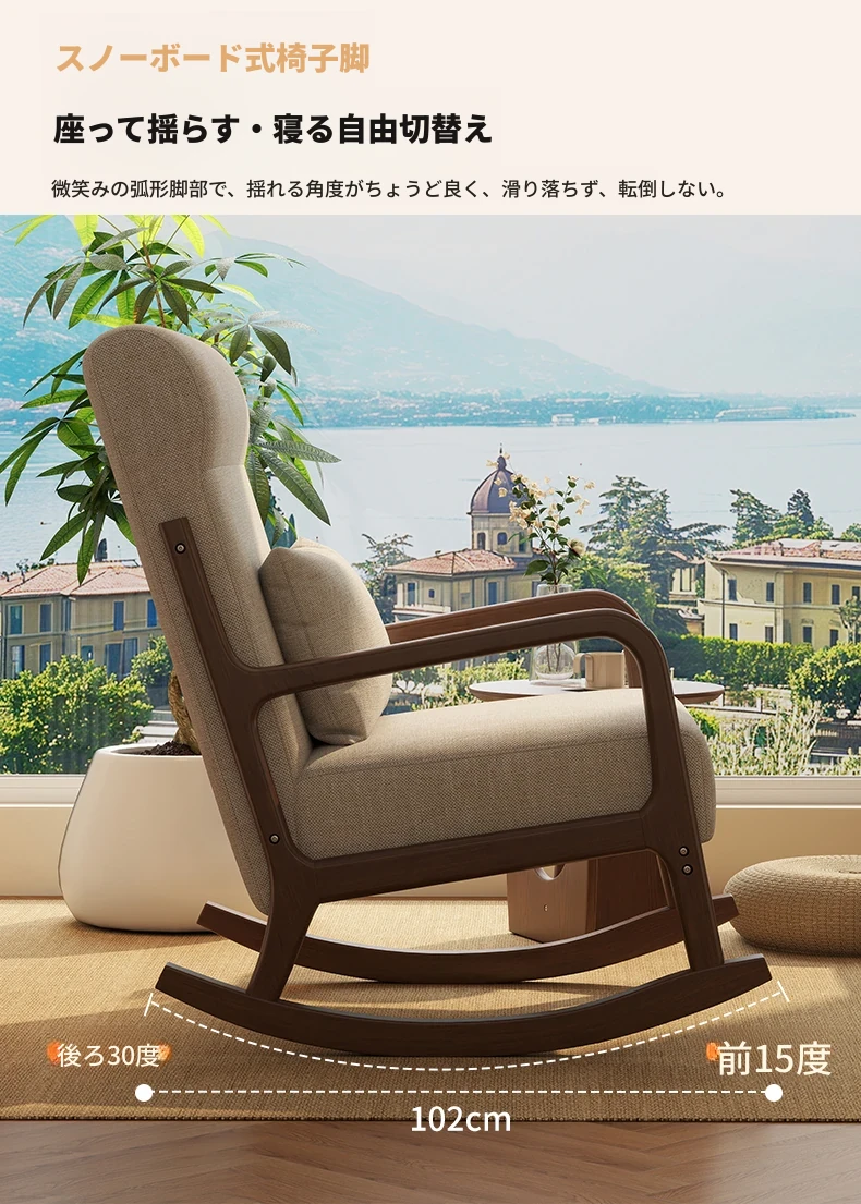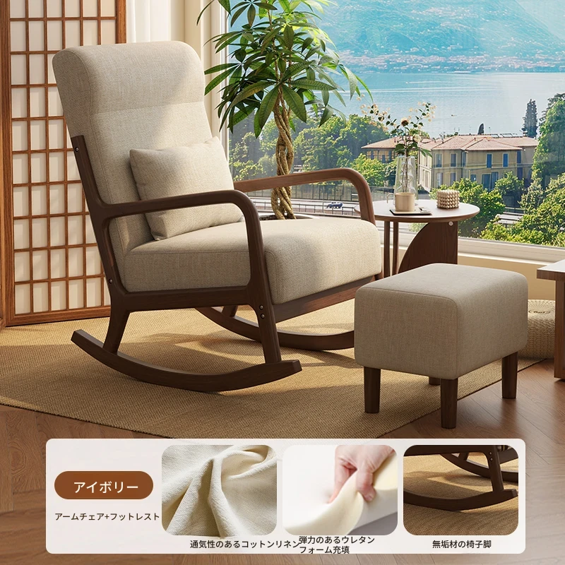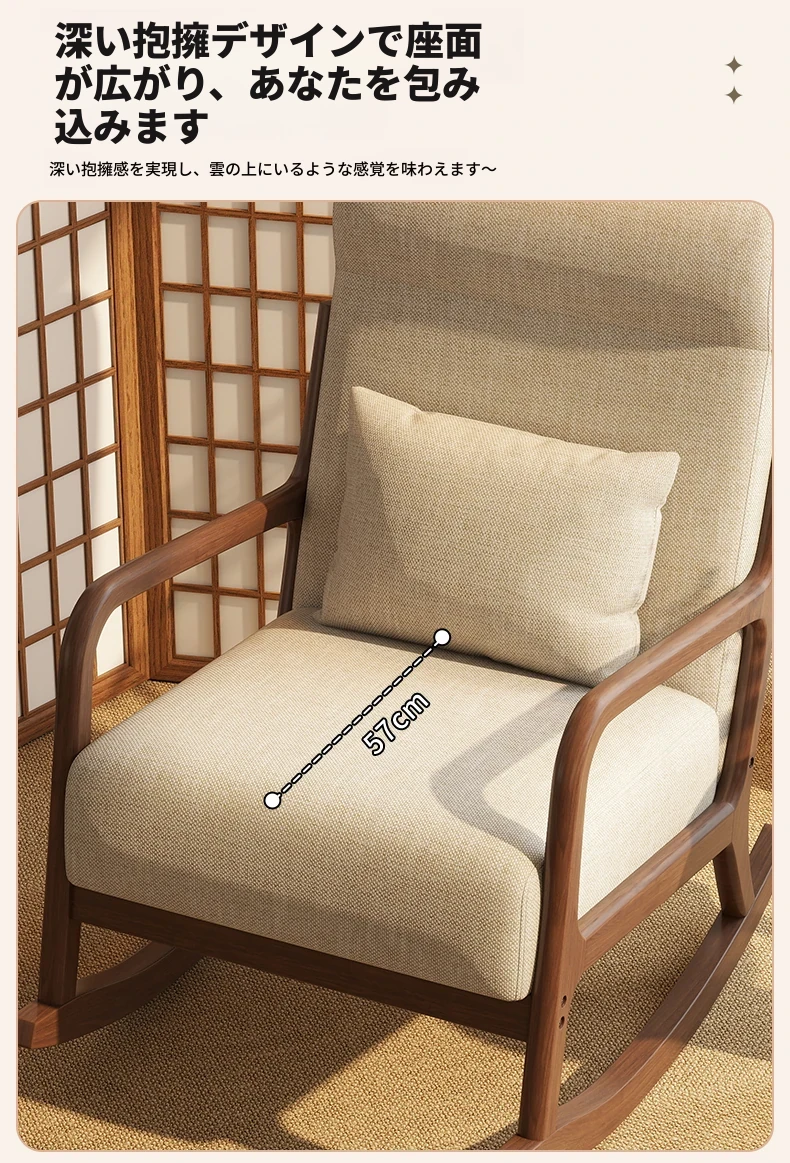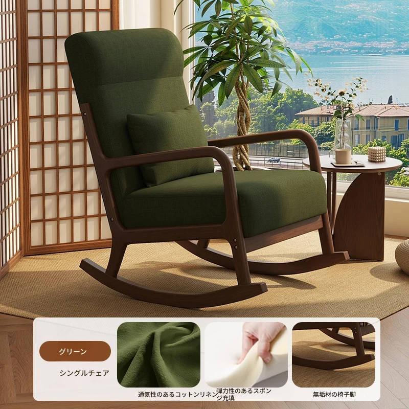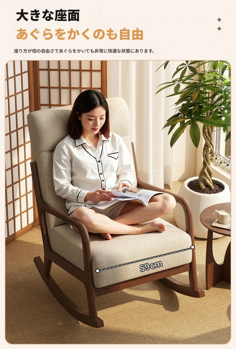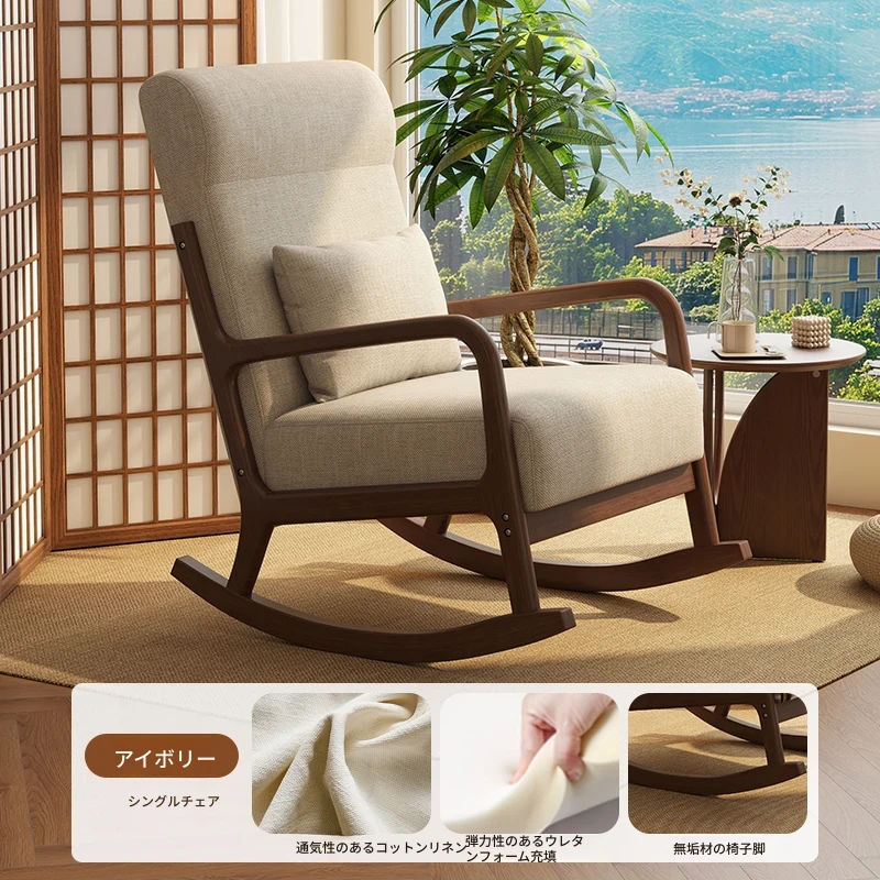 現代的シンプルなデザインの無垢材ロッキングチェア - リビングやバルコニーに最適な一人用ソファ。高齢者にも優しい快適な背もたれ付き、くつろぎのひとときをお楽しみください。