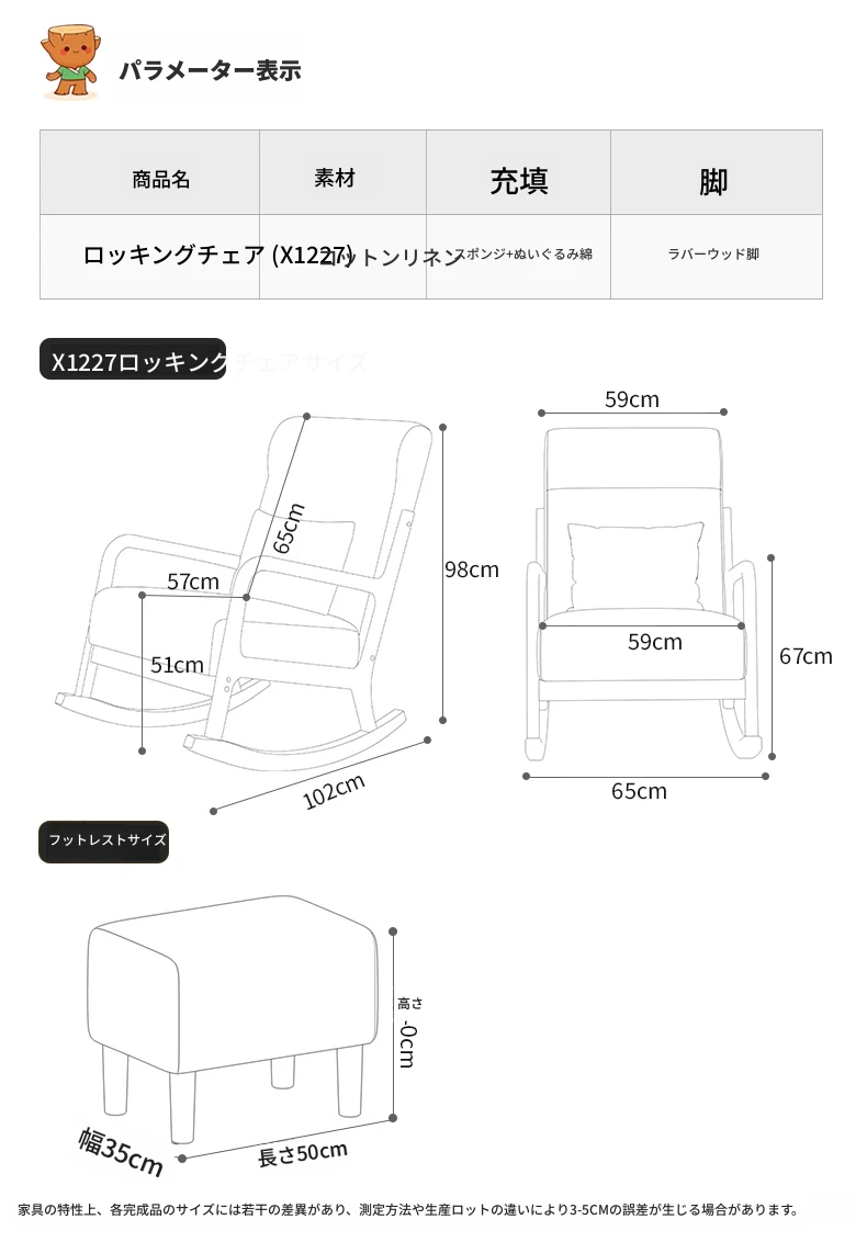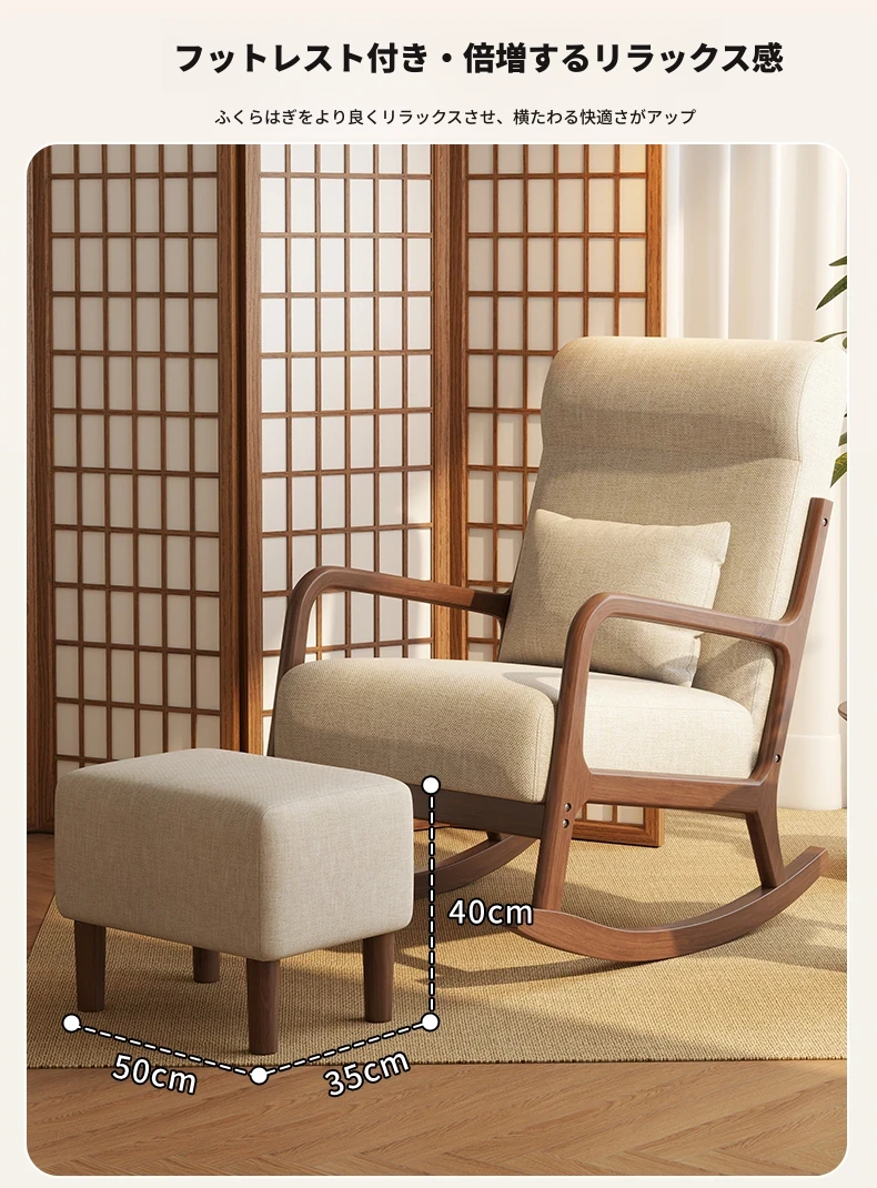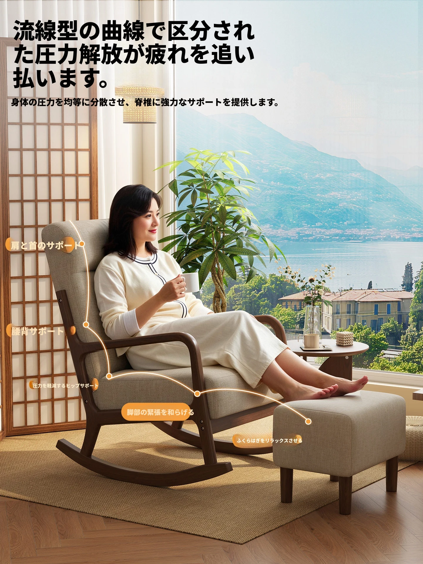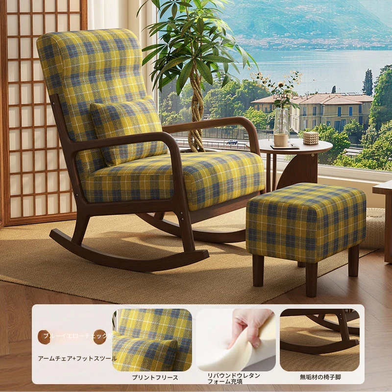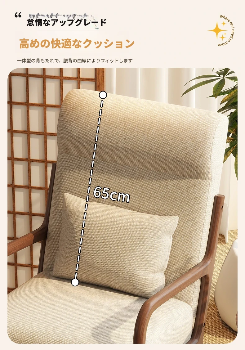 現代的シンプルなデザインの無垢材ロッキングチェア - リビングやバルコニーに最適な一人用ソファ。高齢者にも優しい快適な背もたれ付き、くつろぎのひとときをお楽しみください。